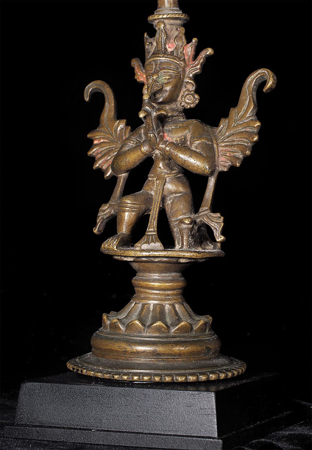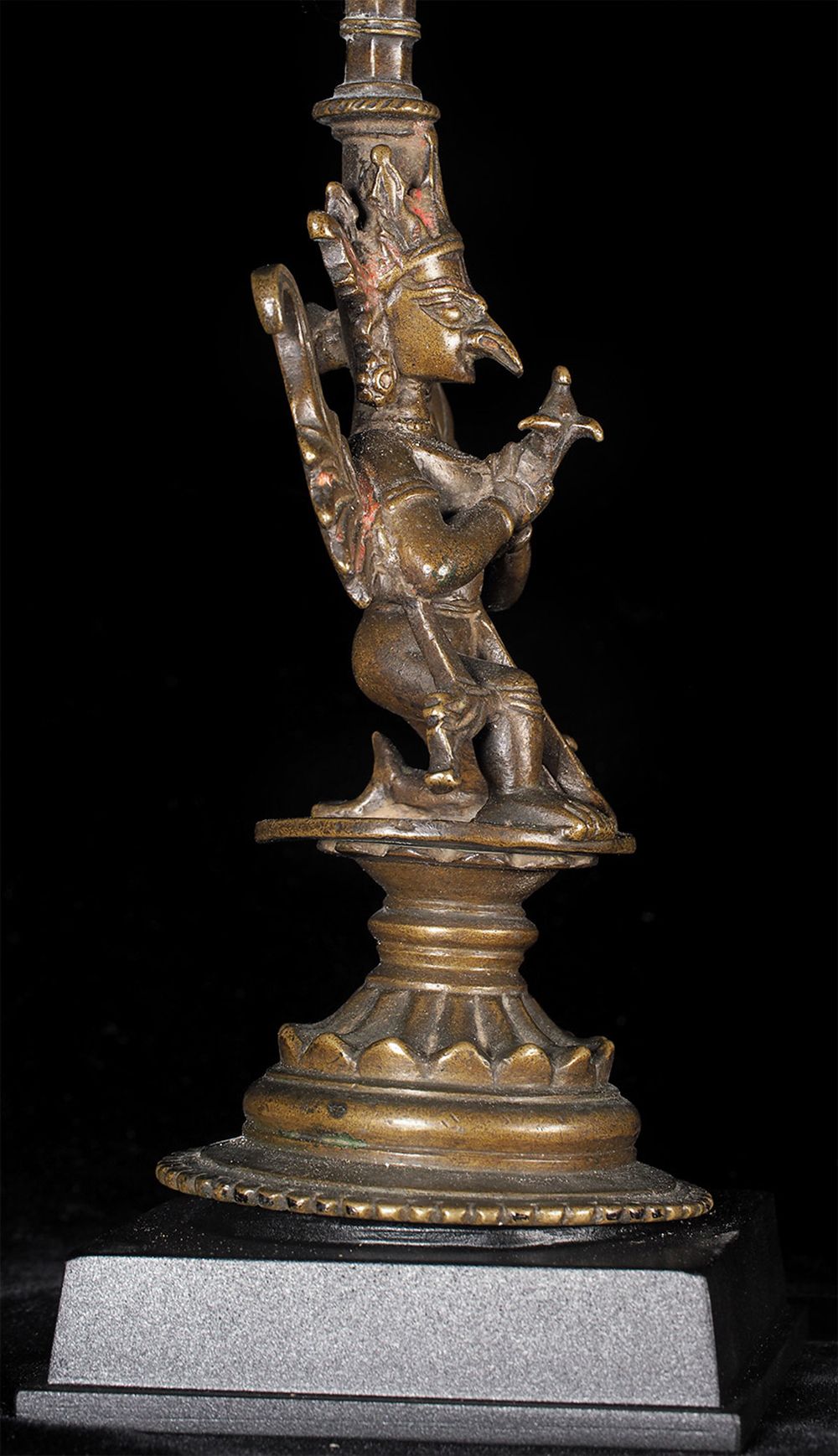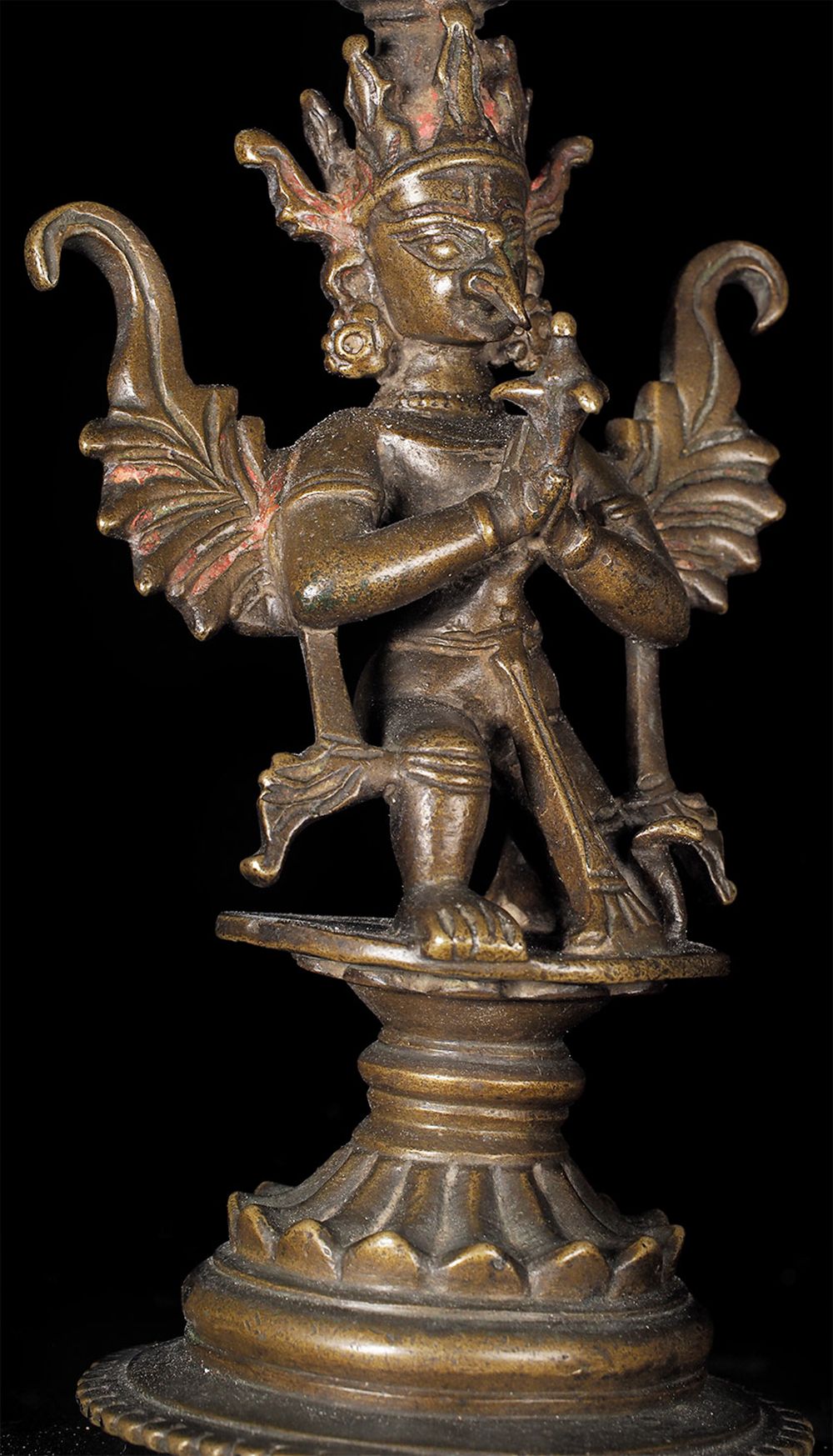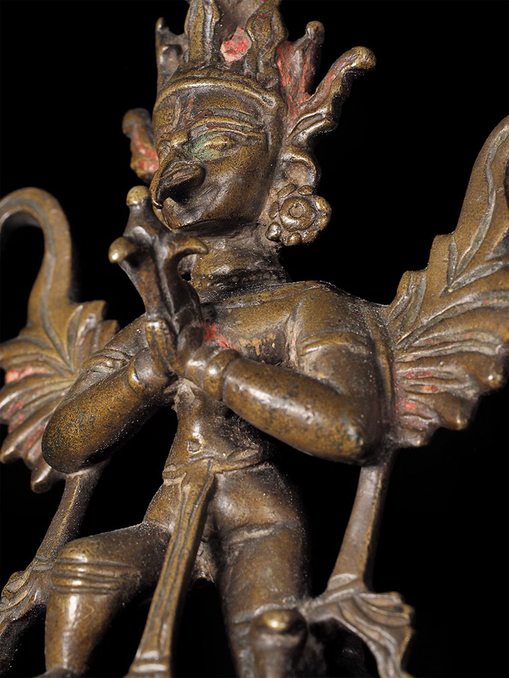 17th-18th century Garuda. He has a smooth patina and superb casting. The expressiveness of this Garuda is wonderful. He still has some orange puja powder in the crevices. He stands a good size at 8.25" tall, and 9.5" on its custom base. Fine and rare type. Done to a very high standard, and one of the best Garuda bronzes I have ever offered. This Garuda has been in my personal collection for the past 25 years.