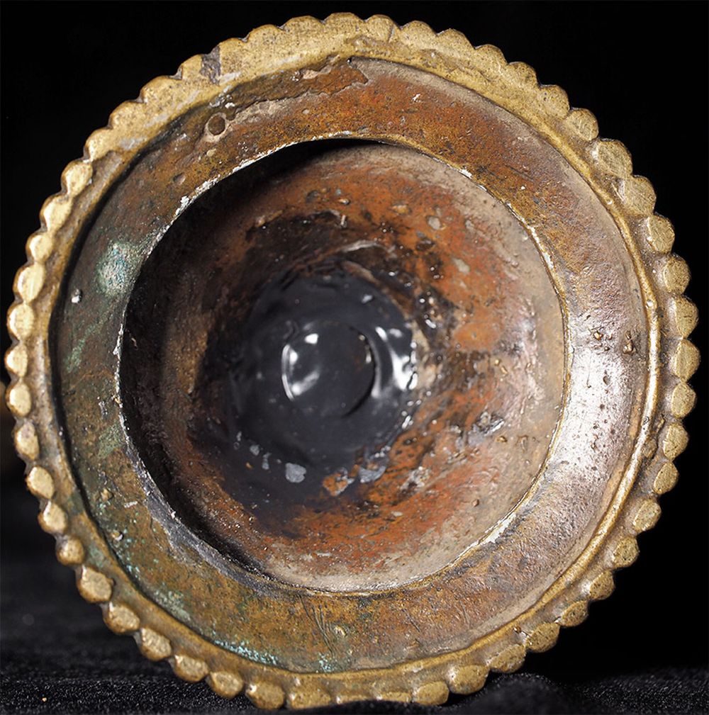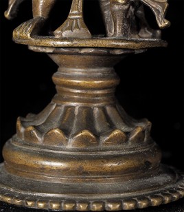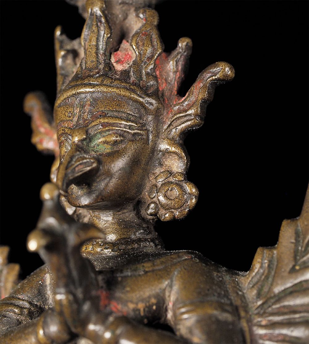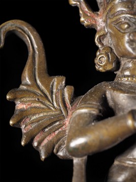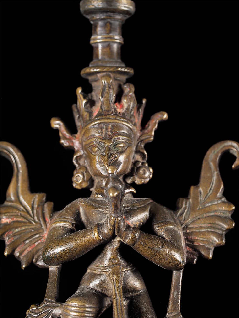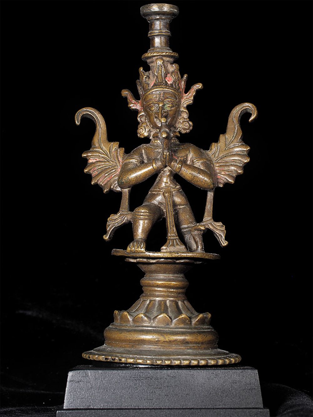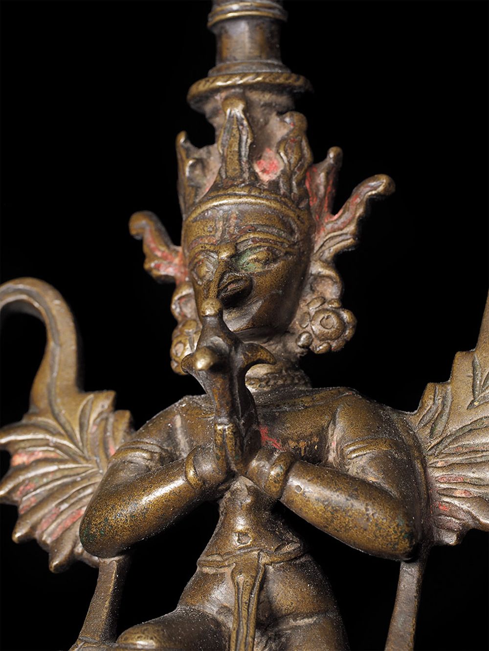 17th-18th century Garuda. He has a smooth patina and superb casting. The expressiveness of this Garuda is wonderful. He still has some orange puja powder in the crevices. He stands a good size at 8.25" tall, and 9.5" on its custom base. Fine and rare type. Done to a very high standard, and one of the best Garuda bronzes I have ever offered. This Garuda has been in my personal collection for the past 25 years.