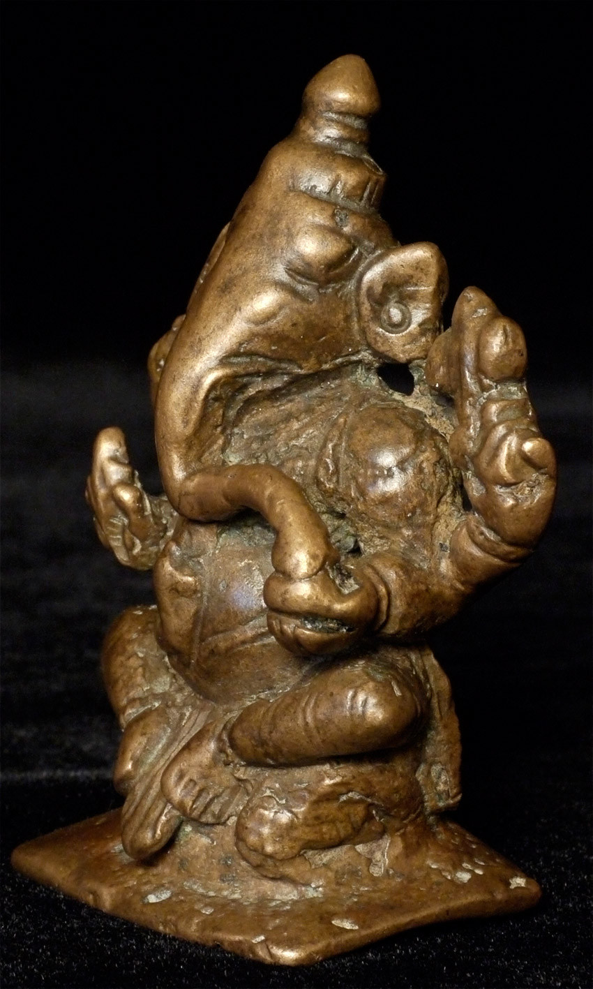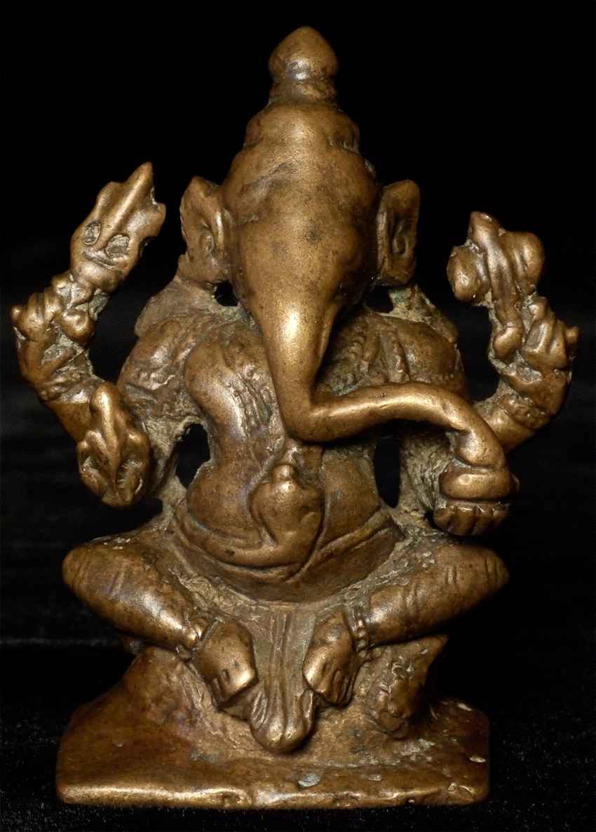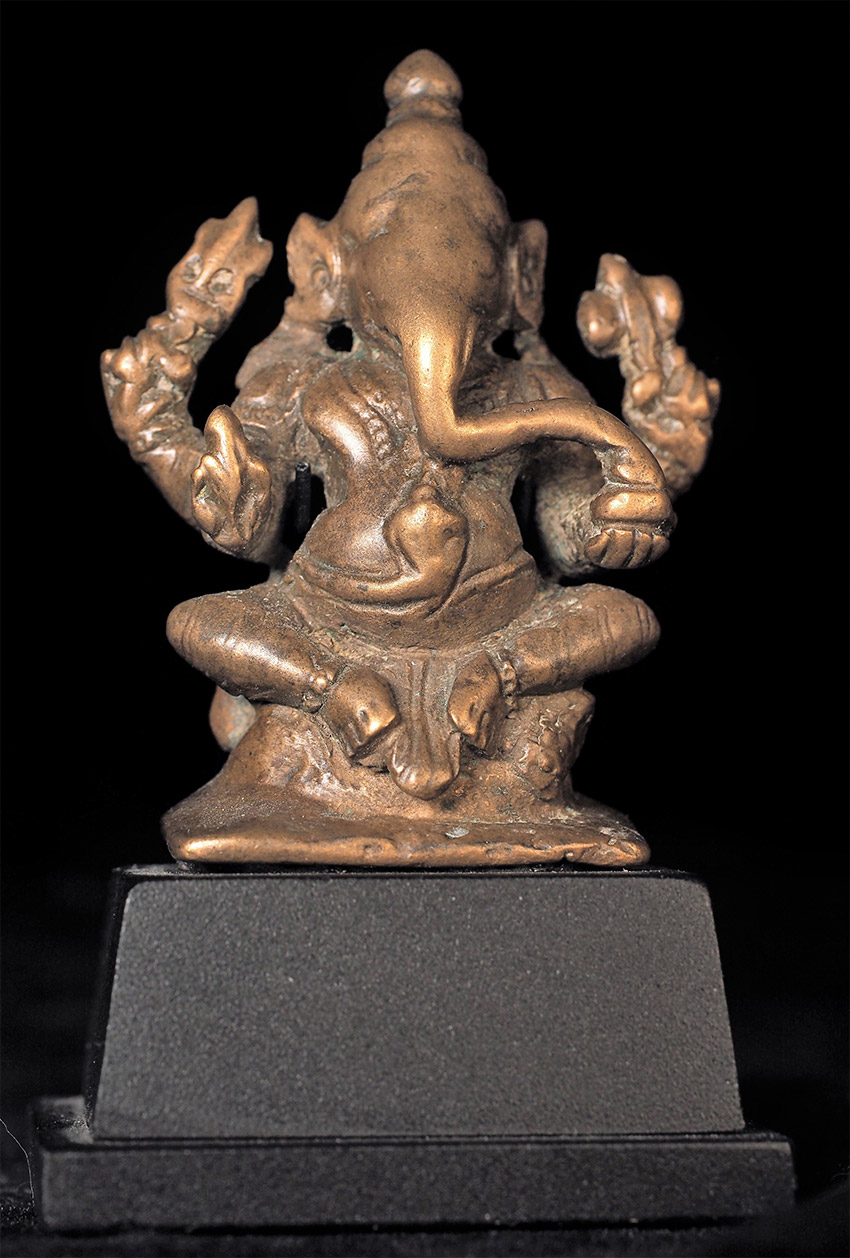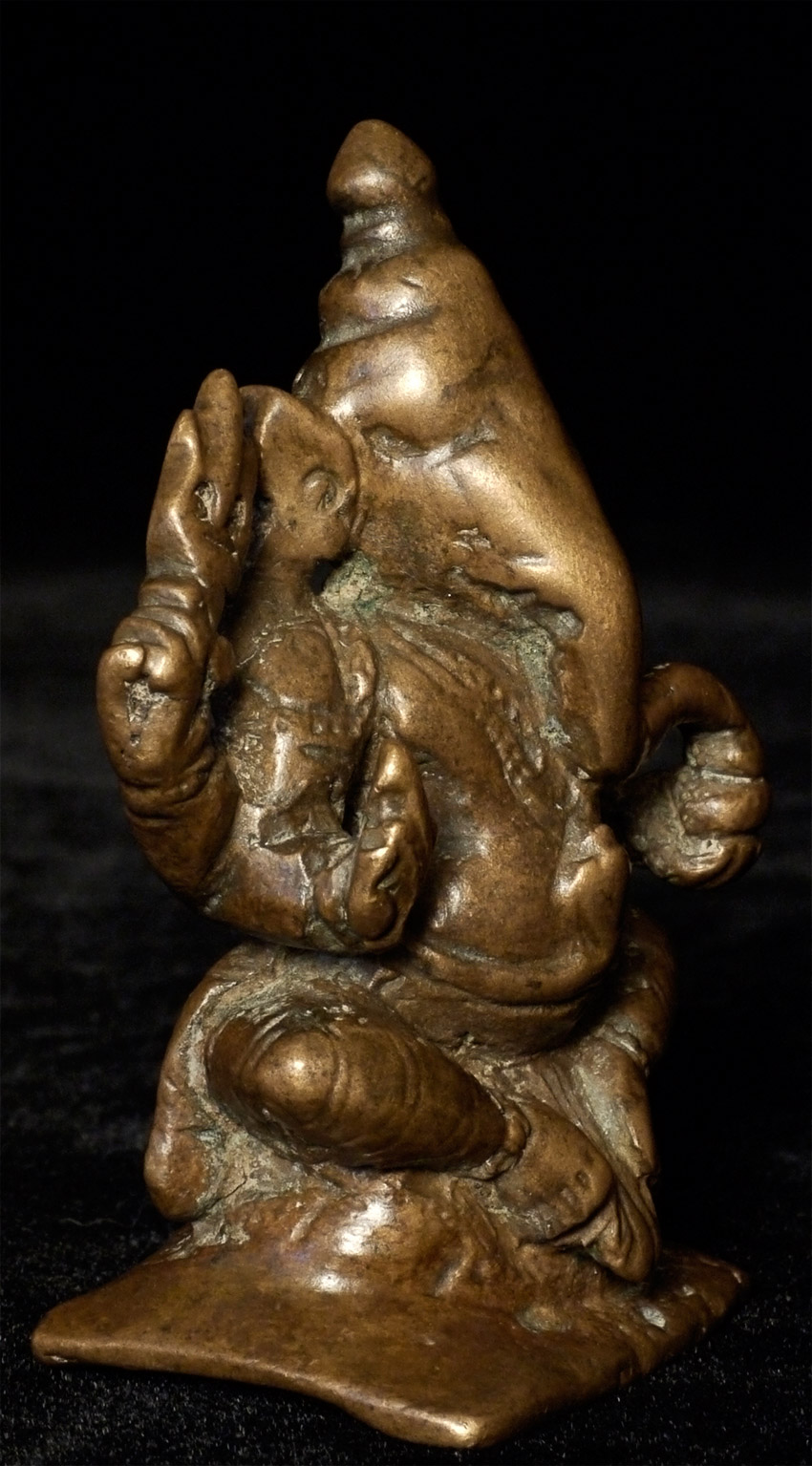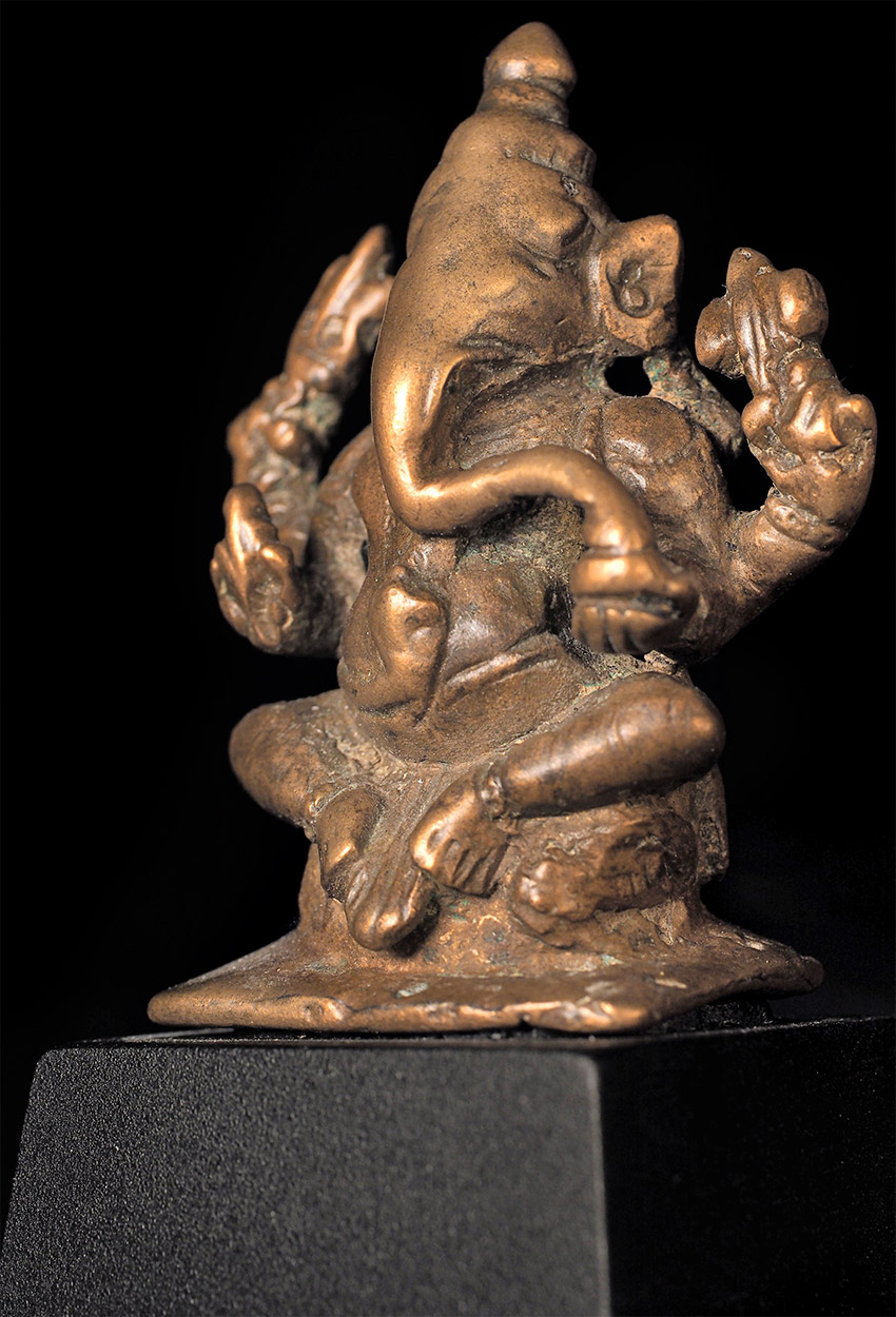 Fine 15th/16thC Ganesh that displays great personality and finesse. Very few as good as this one- in any size of any age. It is extremely hard to capture a distinctive personality in a Ganesh face due to the nature of the big trunk and ears and small eyes on the sides-often worn by time and devotion. This piece manages to convey a very singular character. Sits only a bit over 2.5 inches tall ( a bit over 4 inches on his custom base), but appears far larger in presence. He has been part of a trilogy of 3 Ganesh images in my personal collection for more than 10 years-being put up for sale for the first time as I downsize in advance of retirement.