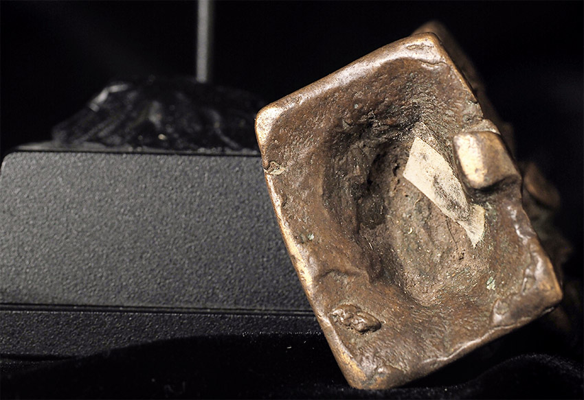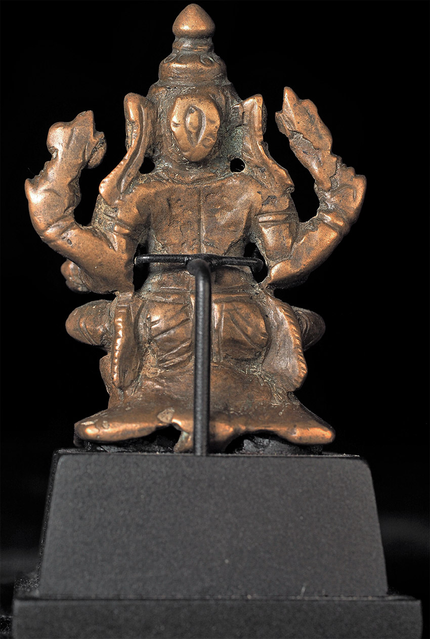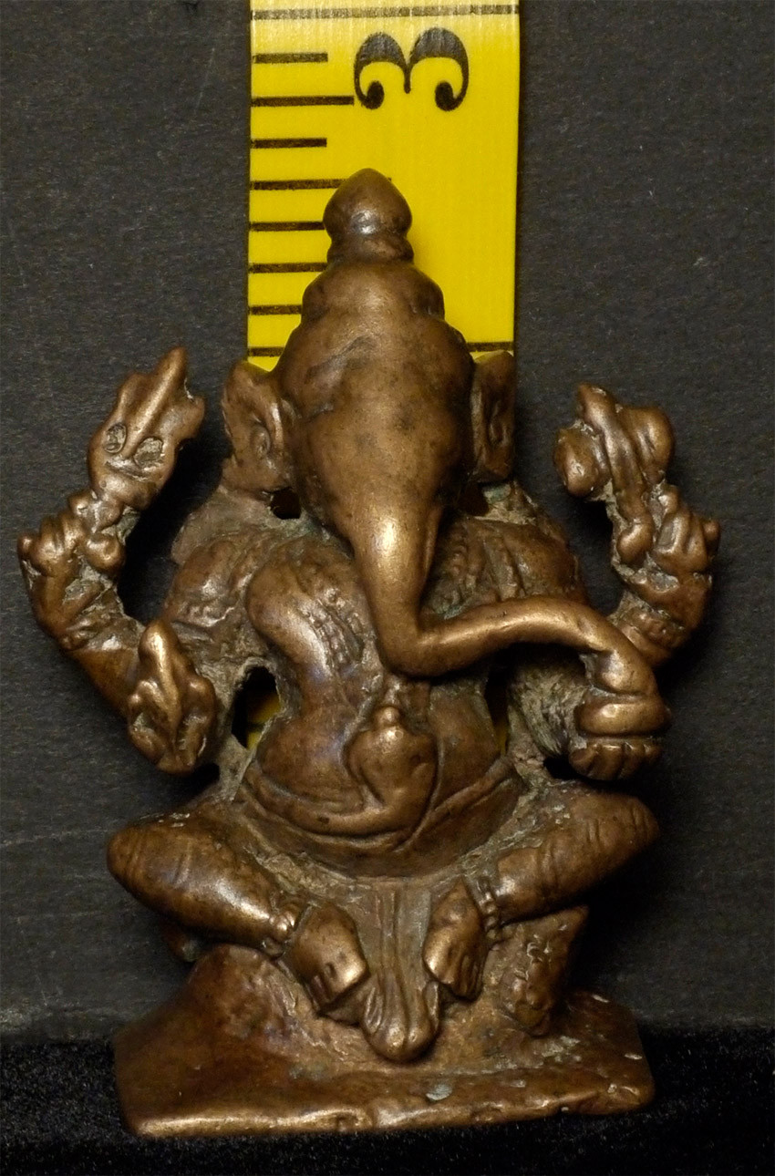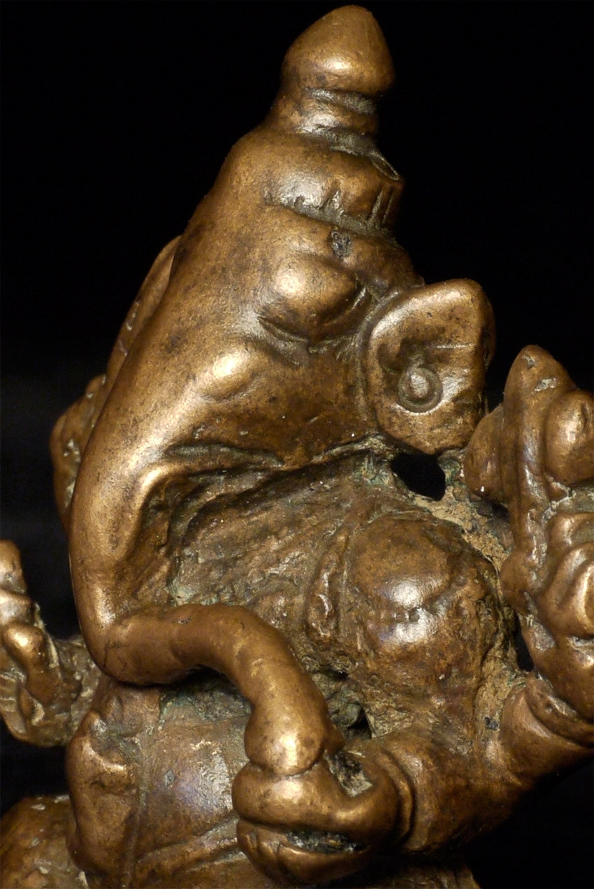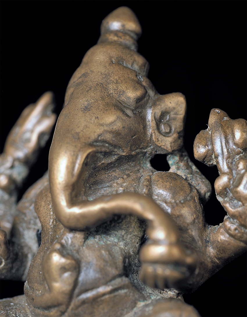 Fine 15th/16thC Ganesh that displays great personality and finesse. Very few as good as this one- in any size of any age. It is extremely hard to capture a distinctive personality in a Ganesh face due to the nature of the big trunk and ears and small eyes on the sides-often worn by time and devotion. This piece manages to convey a very singular character. Sits only a bit over 2.5 inches tall ( a bit over 4 inches on his custom base), but appears far larger in presence. He has been part of a trilogy of 3 Ganesh images in my personal collection for more than 10 years-being put up for sale for the first time as I downsize in advance of retirement.