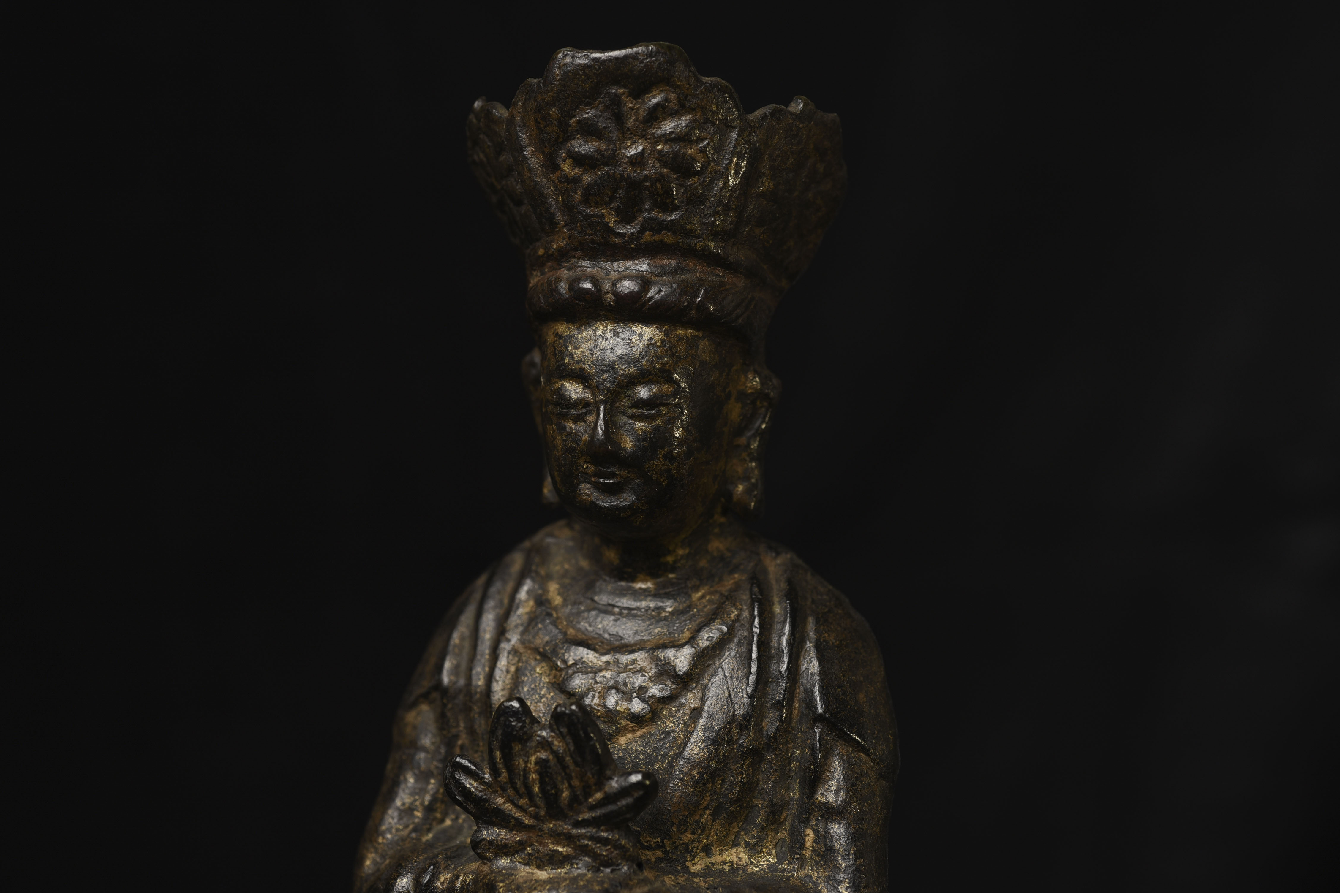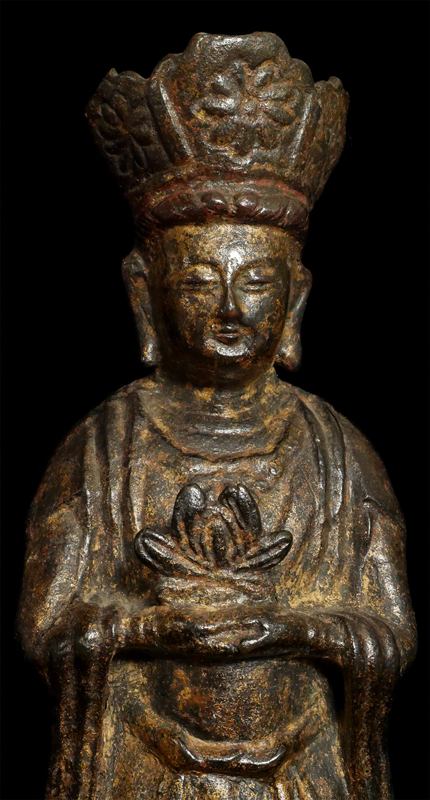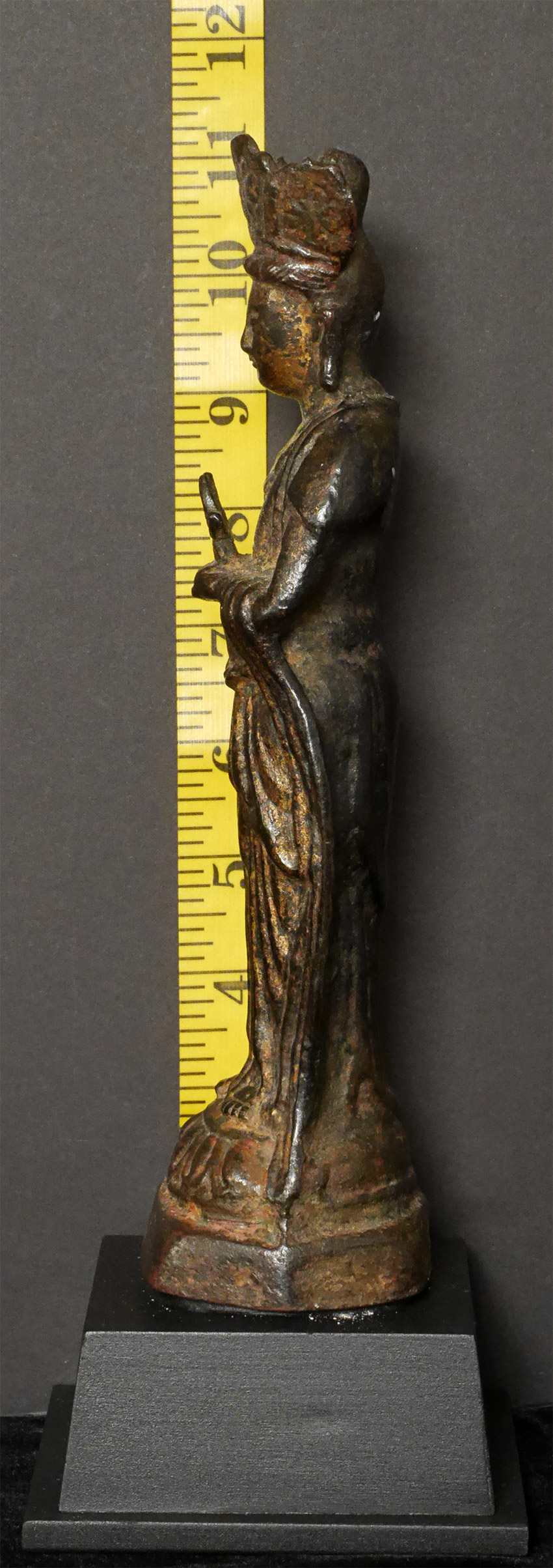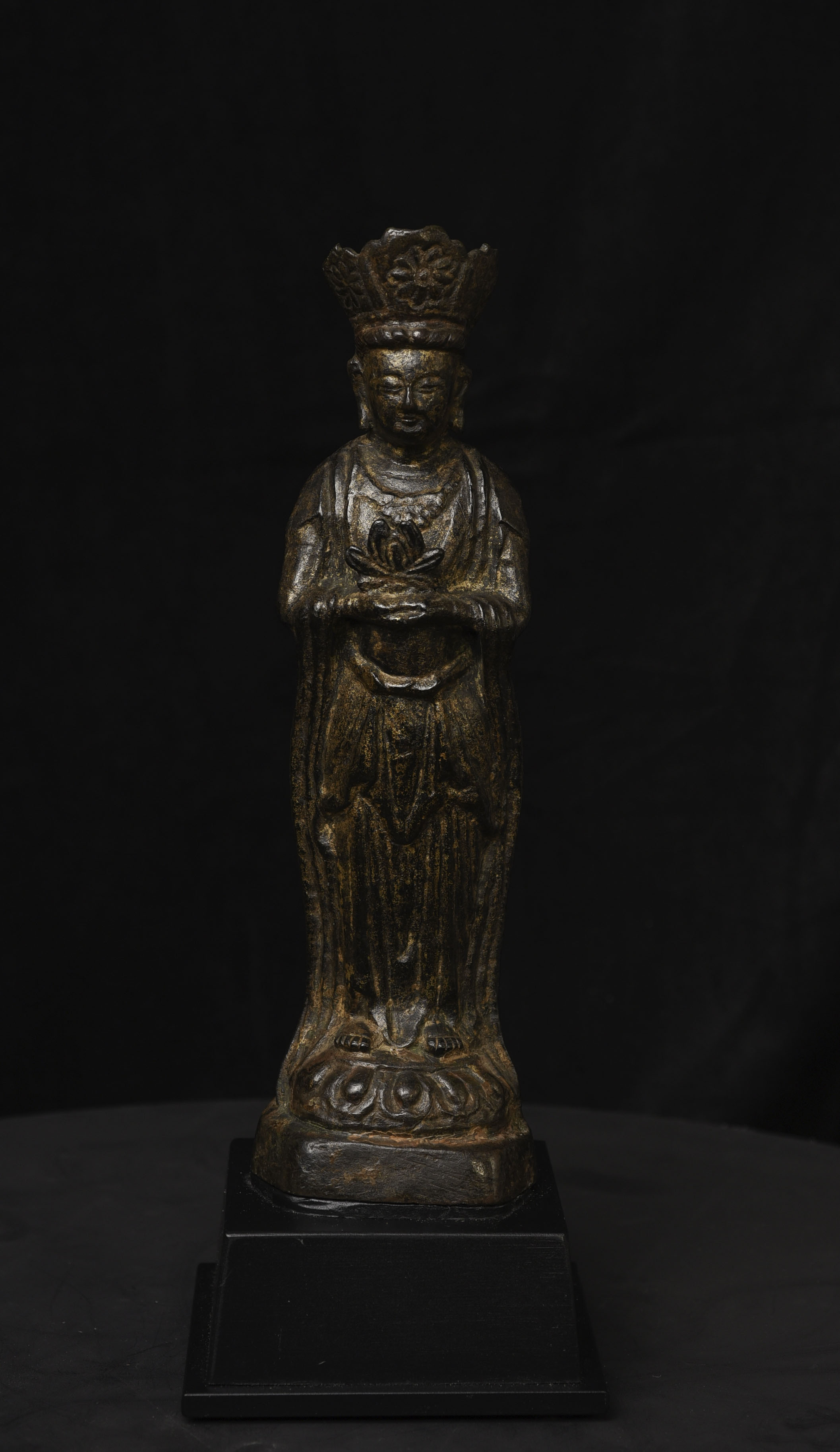 18/19thC Southern (Yunnan) Chinese Ming Standing Bronze Buddha. Nice size at 11.25 inches tall not including the custom base. Beautiful flowing robes an very unique and large open lotus in his hands. Characteristic large Yunan tall crown and relatively small face. A rare type with a very unusual flower form design on the crown and very distinctive profile to the entire piece. The Crown almost looks like the paper or cloth type with 5 panels that are tied on top of the heads of high Lamas during certain ceremonies. Looks to be 18thC, though could be as late as 19thC. Very hard to find comps to put this next to for comparison as it is such a singular piece. Has a real flow to it.