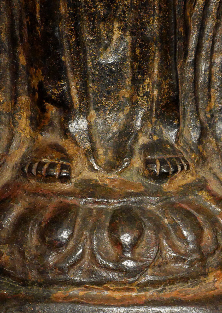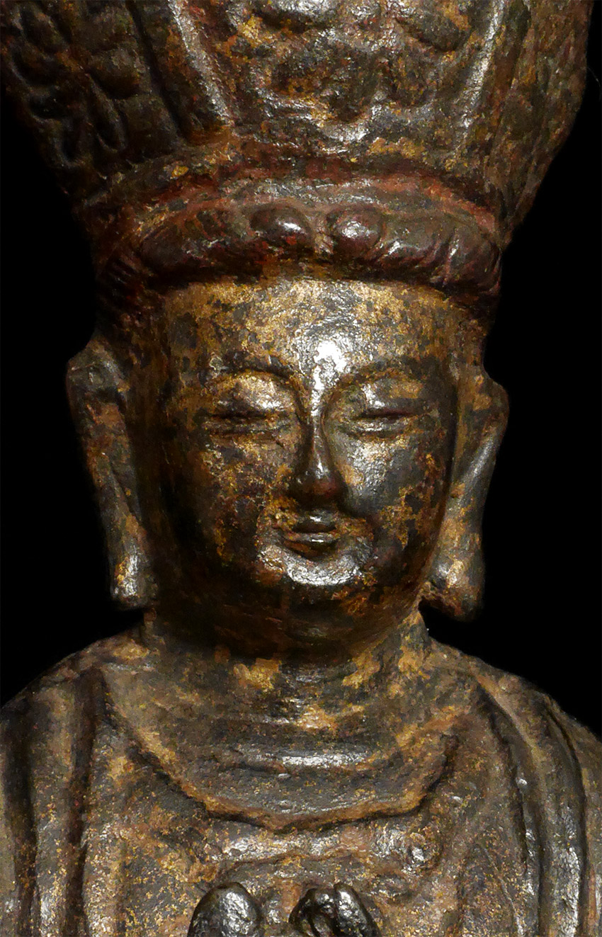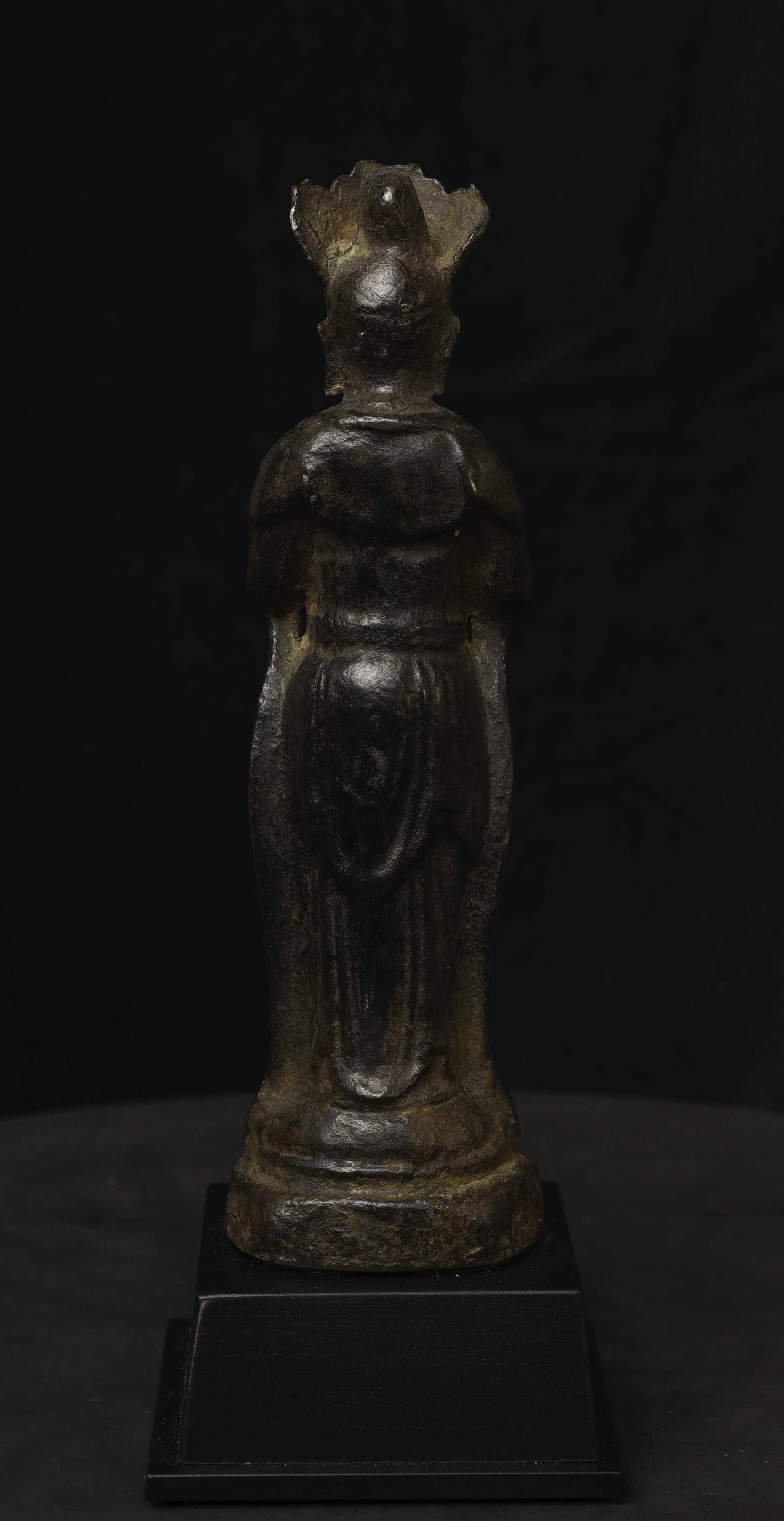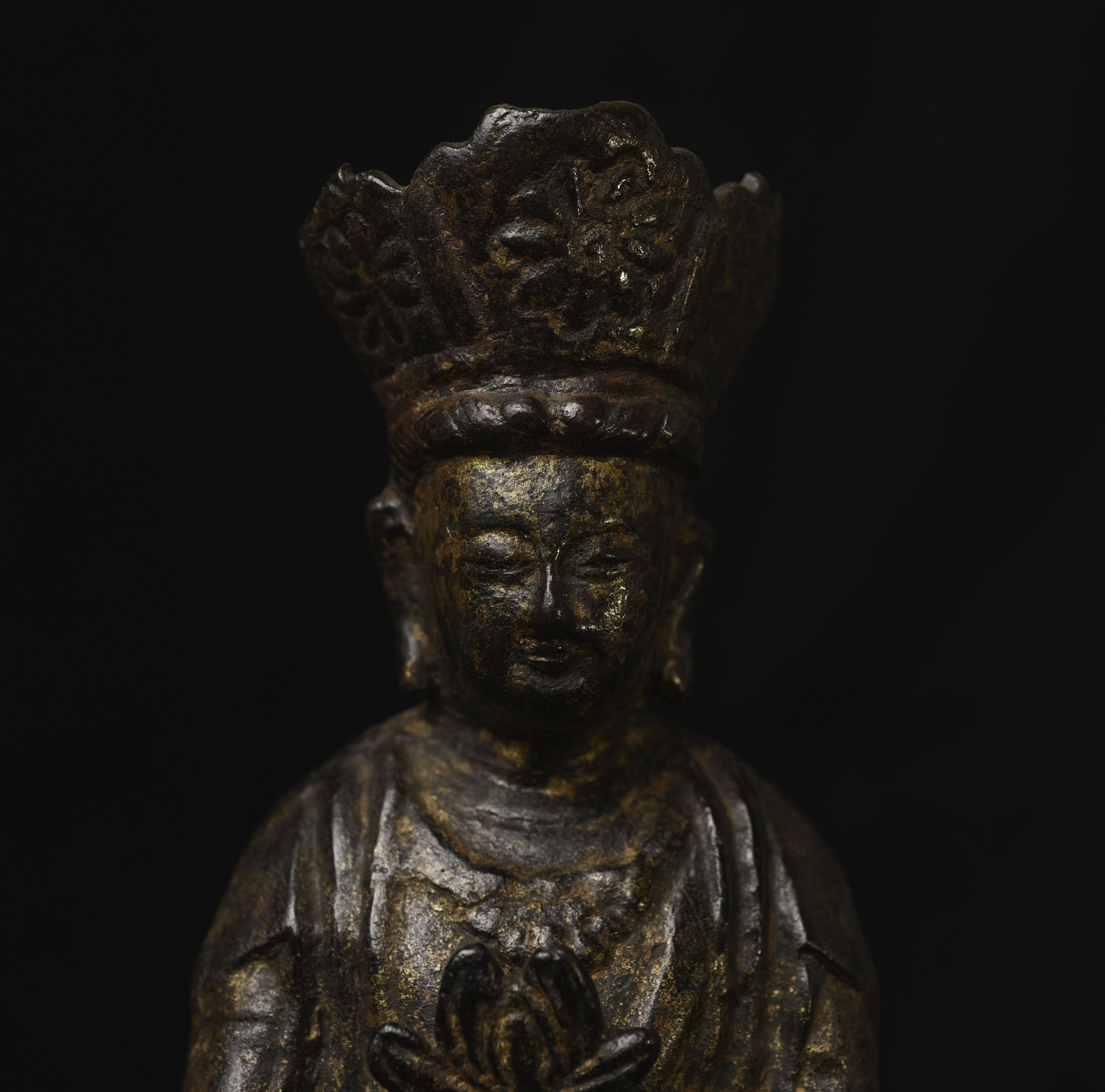 18/19thC Southern (Yunnan) Chinese Ming Standing Bronze Buddha. Nice size at 11.25 inches tall not including the custom base. Beautiful flowing robes an very unique and large open lotus in his hands. Characteristic large Yunan tall crown and relatively small face. A rare type with a very unusual flower form design on the crown and very distinctive profile to the entire piece. The Crown almost looks like the paper or cloth type with 5 panels that are tied on top of the heads of high Lamas during certain ceremonies. Looks to be 18thC, though could be as late as 19thC. Very hard to find comps to put this next to for comparison as it is such a singular piece. Has a real flow to it.