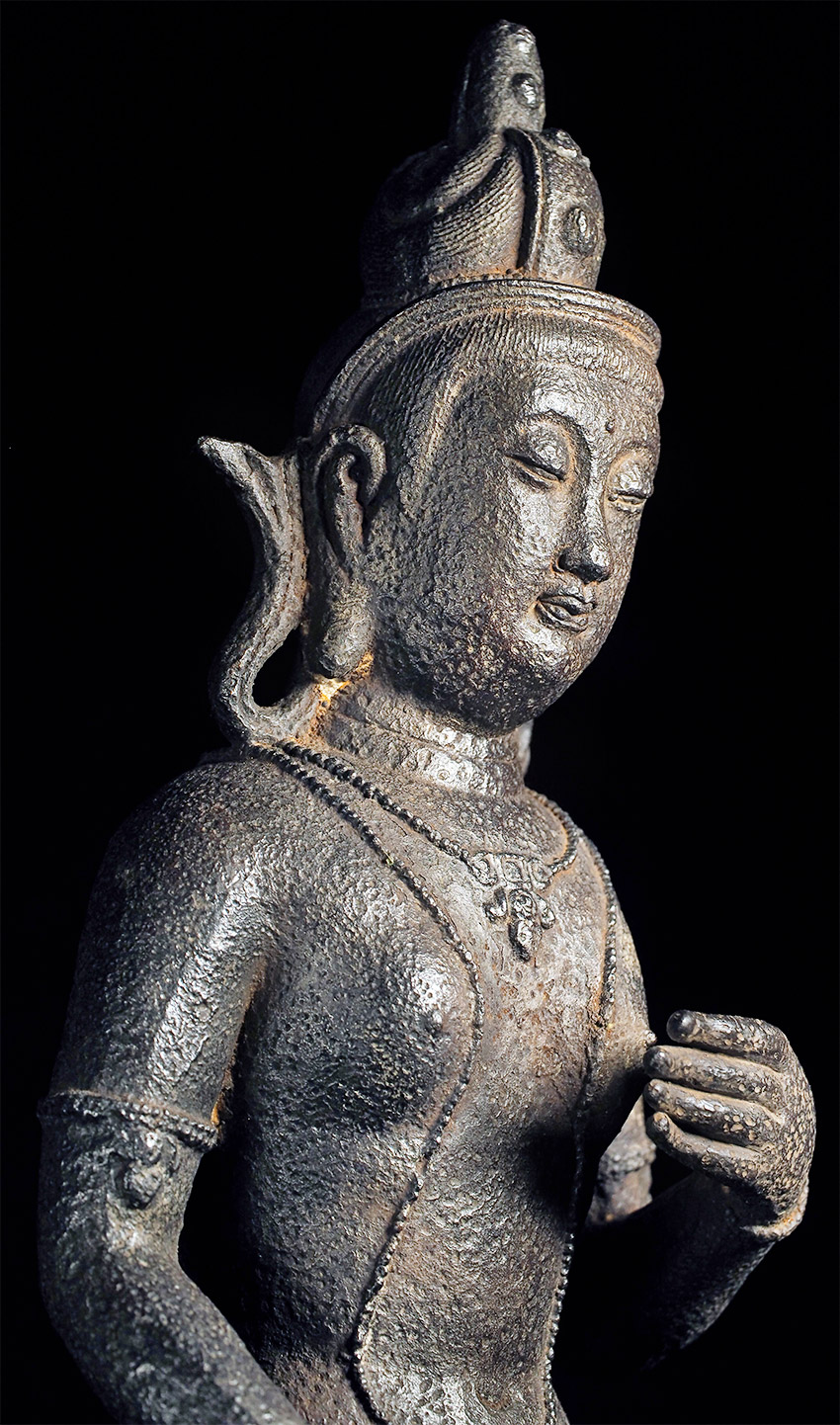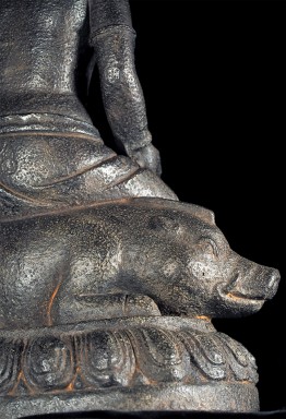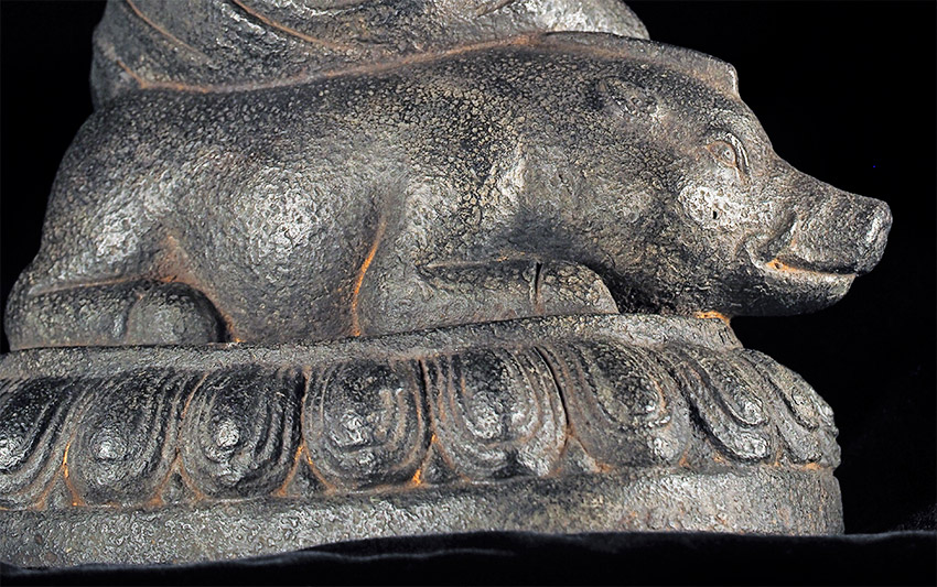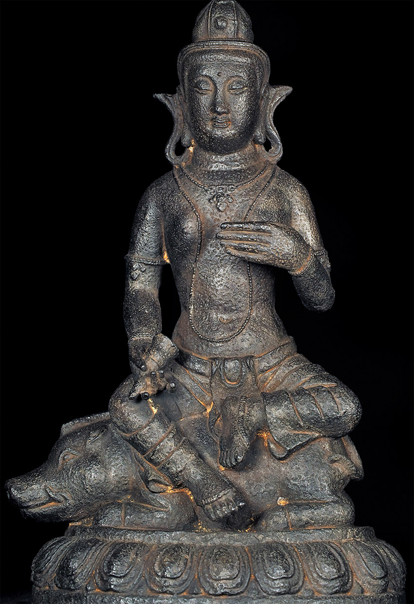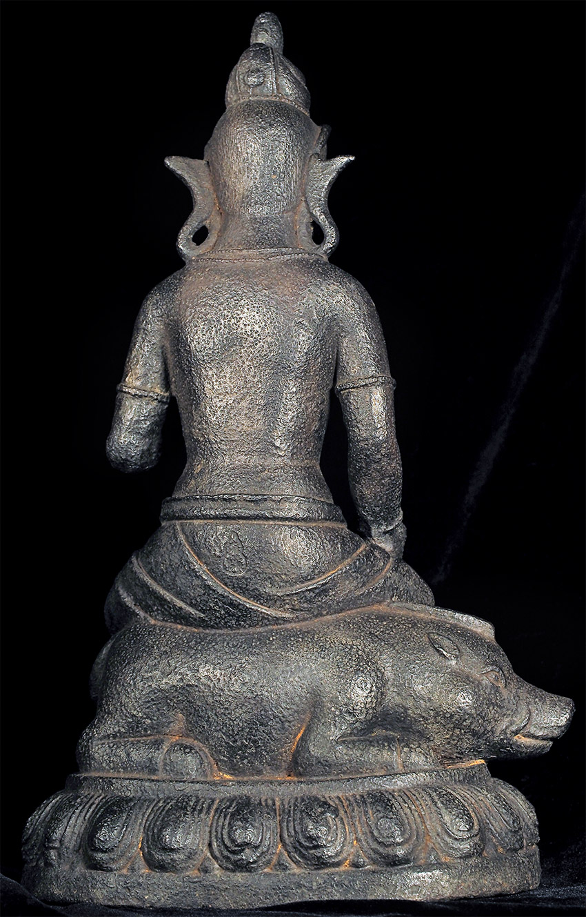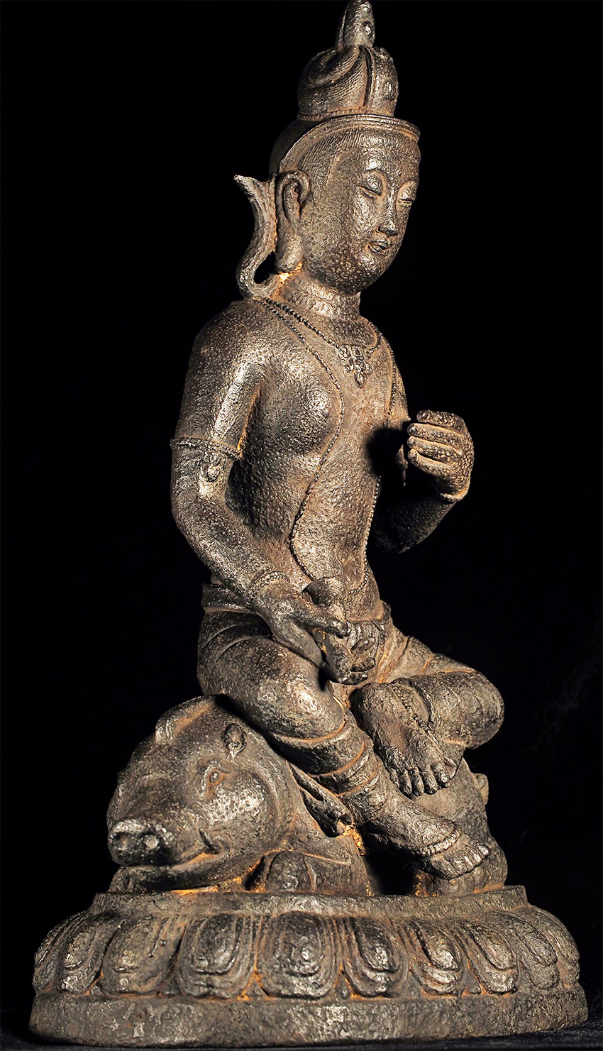 A 15thC large iron sculpture of Marici on her Boar. This is a rare Ming sculpture of a young maiden deity, with budding breasts and youthful face, sitting on her wonderful animated boar, which is filled with personality and delight. This creature has as much gentleness, kindness and friendliness in his face and body as I've ever seen in any sculpted metal animal of any kind. What makes it all the more remarkable is that the piece is made of iron- a material that is harder to capture great detail than bronze, copper, or brass. The patina is fabulous-dark inside and out, with a surface that is pitted and smooth in a way that can only happen with great age. Purchased by the previous owner through a highly respected Eastern European auction house. Purchased as a private sale, not through the auction process. Qute large and very heavy at 15 1/2 inches tall by almost 9 inches wide at the base. She leans forward, showing she is made to sit in a high place and to be looked at from below. Actual color is captured in the first two photos (more orange/black) and in a few of the other photos with the same color palette. Had to use bright lights and the other photos show piece well, but not the color. An all time favorite, unlike any other piece I have owned in 30 years. Has a delicacy and presence that is hard to explain, but that is palpable when in its presence. Not cheap, but this is a world class piece.