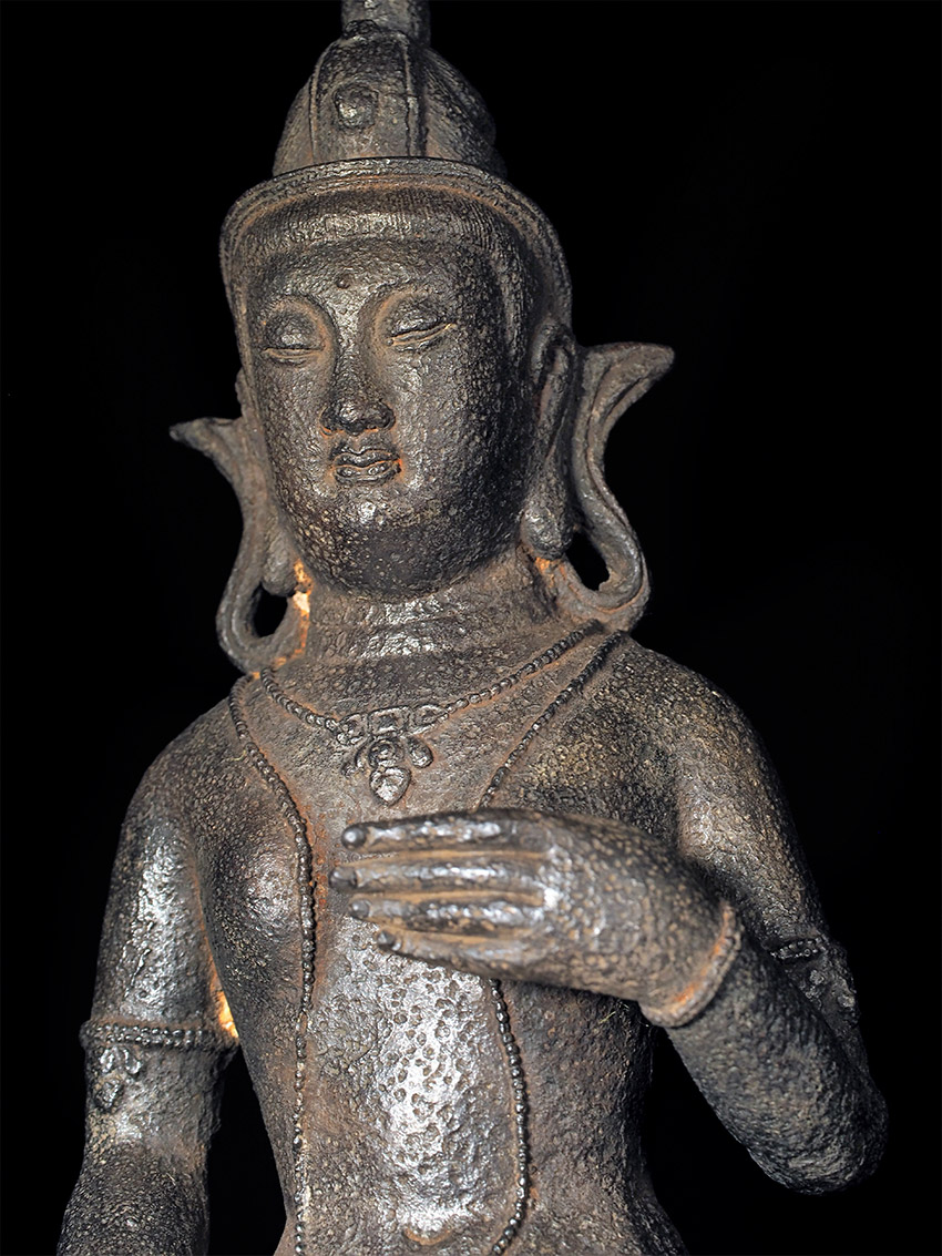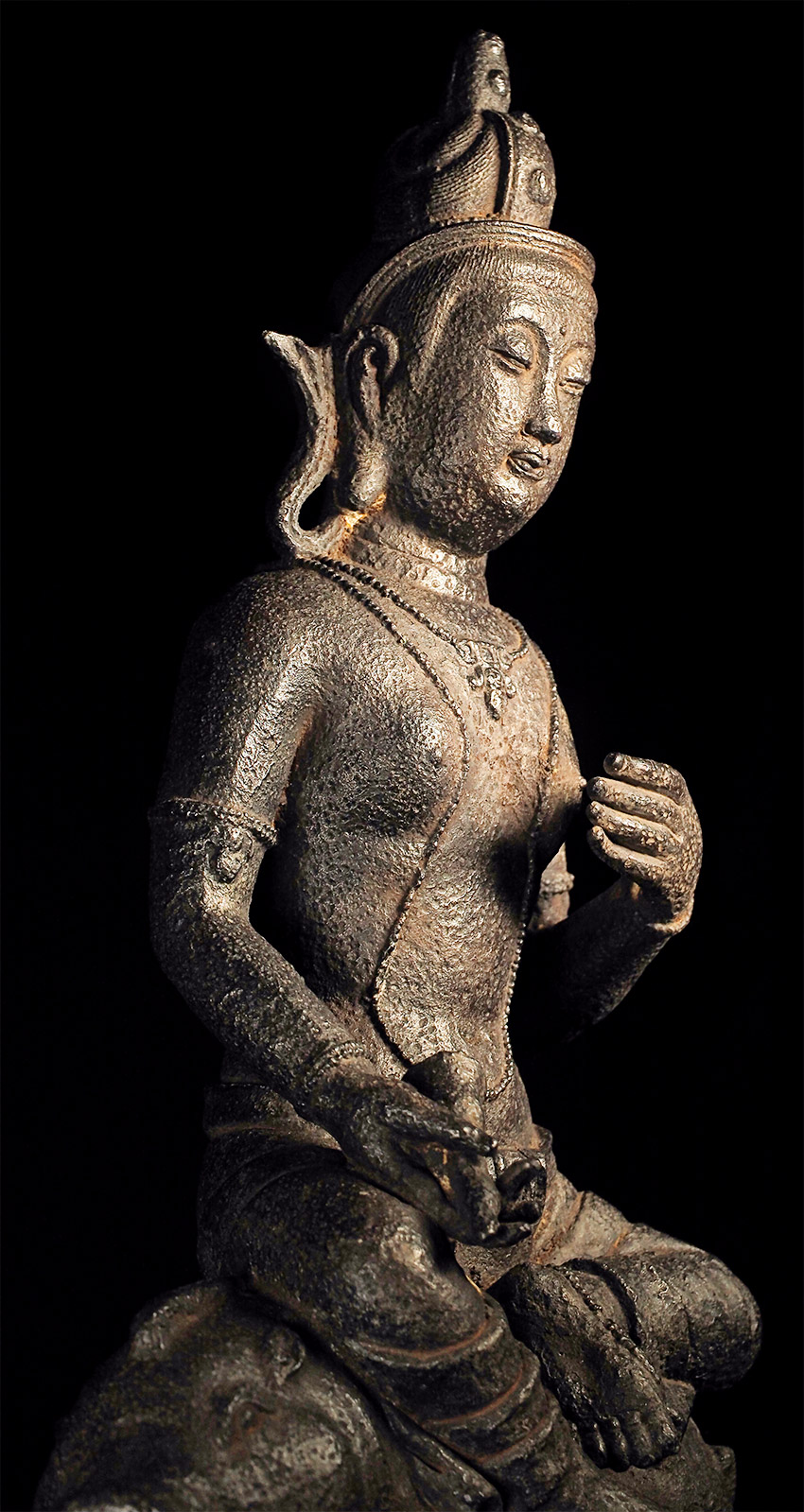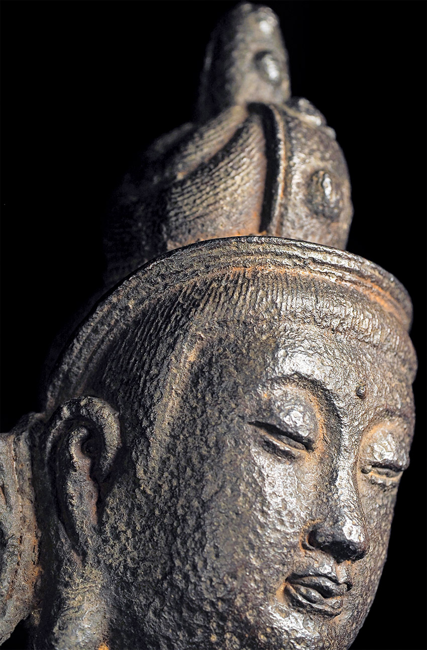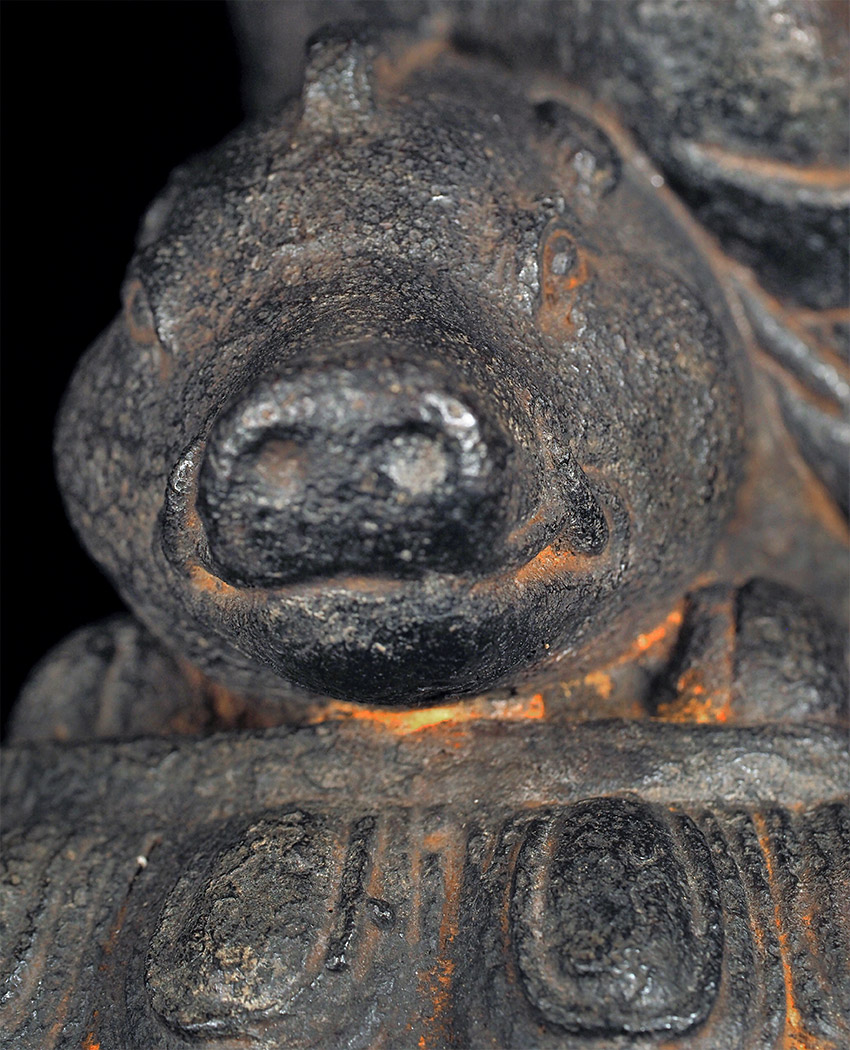 A 15thC large iron sculpture of Marici on her Boar. This is a rare Ming sculpture of a young maiden deity, with budding breasts and youthful face, sitting on her wonderful animated boar, which is filled with personality and delight. This creature has as much gentleness, kindness and friendliness in his face and body as I've ever seen in any sculpted metal animal of any kind. What makes it all the more remarkable is that the piece is made of iron- a material that is harder to capture great detail than bronze, copper, or brass. The patina is fabulous-dark inside and out, with a surface that is pitted and smooth in a way that can only happen with great age. Purchased by the previous owner through a highly respected Eastern European auction house. Purchased as a private sale, not through the auction process. Qute large and very heavy at 15 1/2 inches tall by almost 9 inches wide at the base. She leans forward, showing she is made to sit in a high place and to be looked at from below. Actual color is captured in the first two photos (more orange/black) and in a few of the other photos with the same color palette. Had to use bright lights and the other photos show piece well, but not the color. An all time favorite, unlike any other piece I have owned in 30 years. Has a delicacy and presence that is hard to explain, but that is palpable when in its presence. Not cheap, but this is a world class piece.