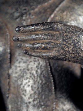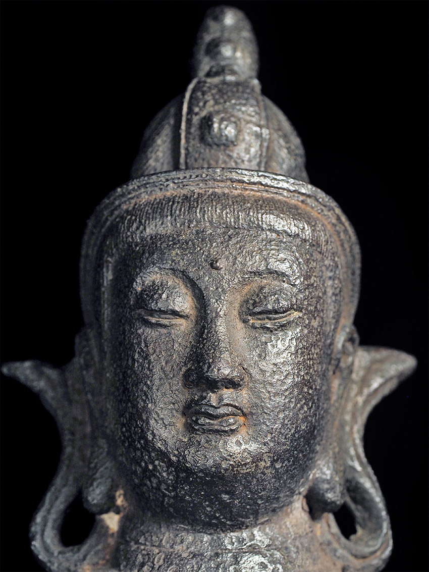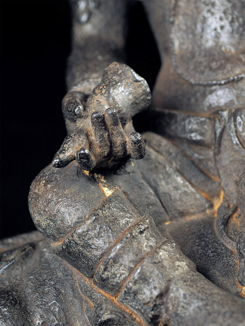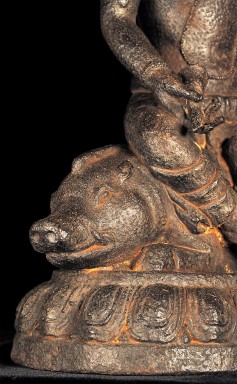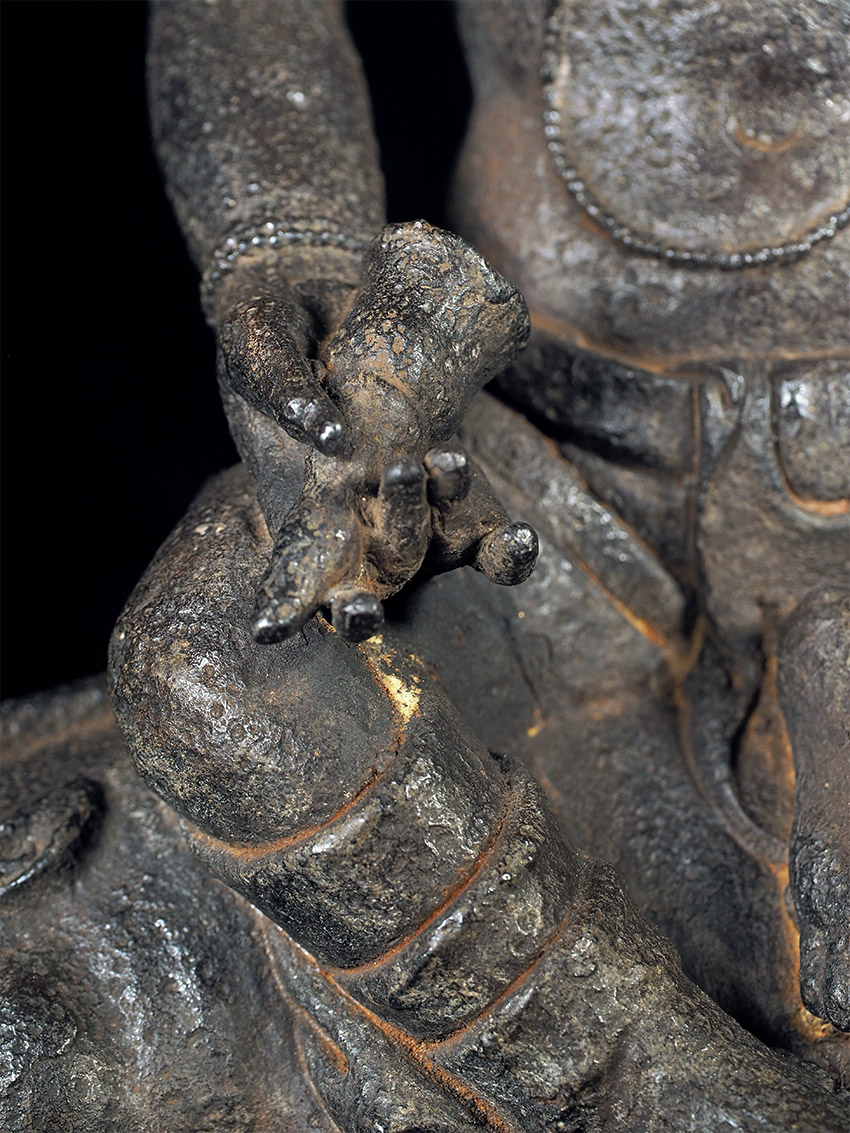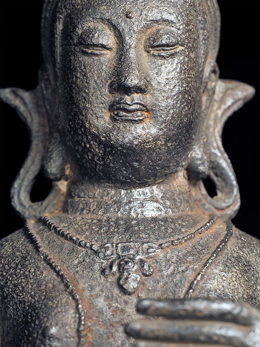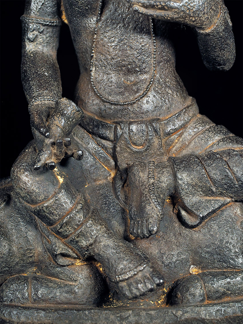 A 15thC large iron sculpture of Marici on her Boar. This is a rare Ming sculpture of a young maiden deity, with budding breasts and youthful face, sitting on her wonderful animated boar, which is filled with personality and delight. This creature has as much gentleness, kindness and friendliness in his face and body as I've ever seen in any sculpted metal animal of any kind. What makes it all the more remarkable is that the piece is made of iron- a material that is harder to capture great detail than bronze, copper, or brass. The patina is fabulous-dark inside and out, with a surface that is pitted and smooth in a way that can only happen with great age. Purchased by the previous owner through a highly respected Eastern European auction house. Purchased as a private sale, not through the auction process. Qute large and very heavy at 15 1/2 inches tall by almost 9 inches wide at the base. She leans forward, showing she is made to sit in a high place and to be looked at from below. Actual color is captured in the first two photos (more orange/black) and in a few of the other photos with the same color palette. Had to use bright lights and the other photos show piece well, but not the color. An all time favorite, unlike any other piece I have owned in 30 years. Has a delicacy and presence that is hard to explain, but that is palpable when in its presence. Not cheap, but this is a world class piece.