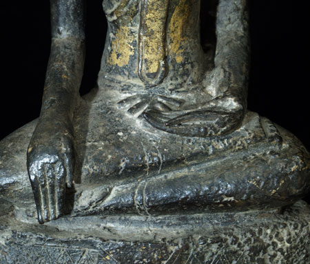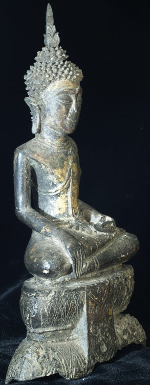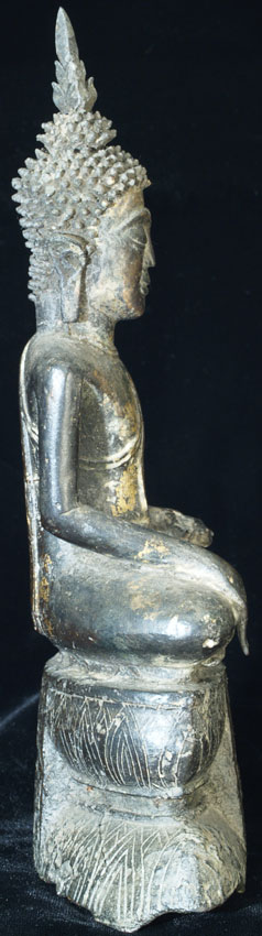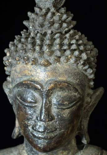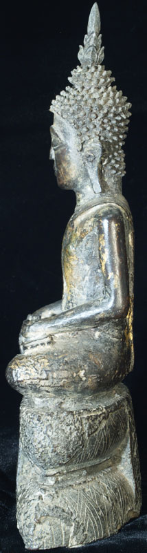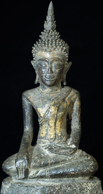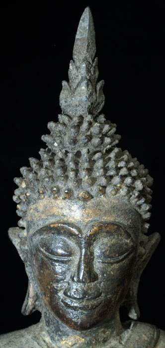 This is a delightful and very uncommon Cambodian bronze Buddha sculpted during the 18th, and possibly 17th century. It has influence from the nearby Ayuthaya style which was flourishing in nearby Thailand at the same time. It also has strong influence from Laos, although the face, style of base, body shape, and overall feel make this Buddha most likely from Cambodia. Excellent condition- some loss to the base which I believe is original to the casting. The base and Buddha, and very top of the head and finial, may have been cast separately. The feeling radiating from the gentle, loving face is quite special- spend time looking at the photos. He was quite expensive to purchase, and I thought long and hard before buying him myself, but I’ve learned to buy the Buddhas that speak to me, and that they will always find a good home (if with no one else, with me!). Nice size- Sits just over 10 inches tall and extremely heavy, as the base is partially filled with lead, which is not uncommon for Cambodian Buddhas.
