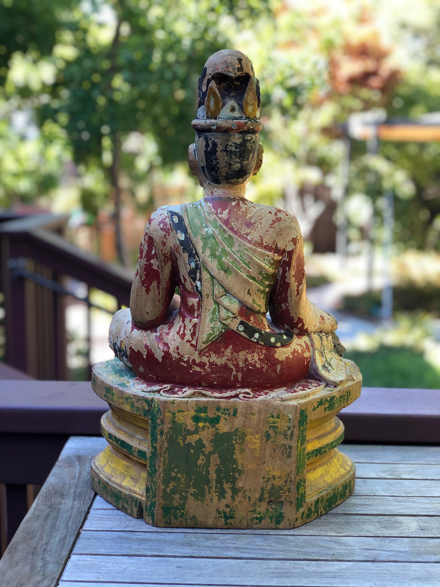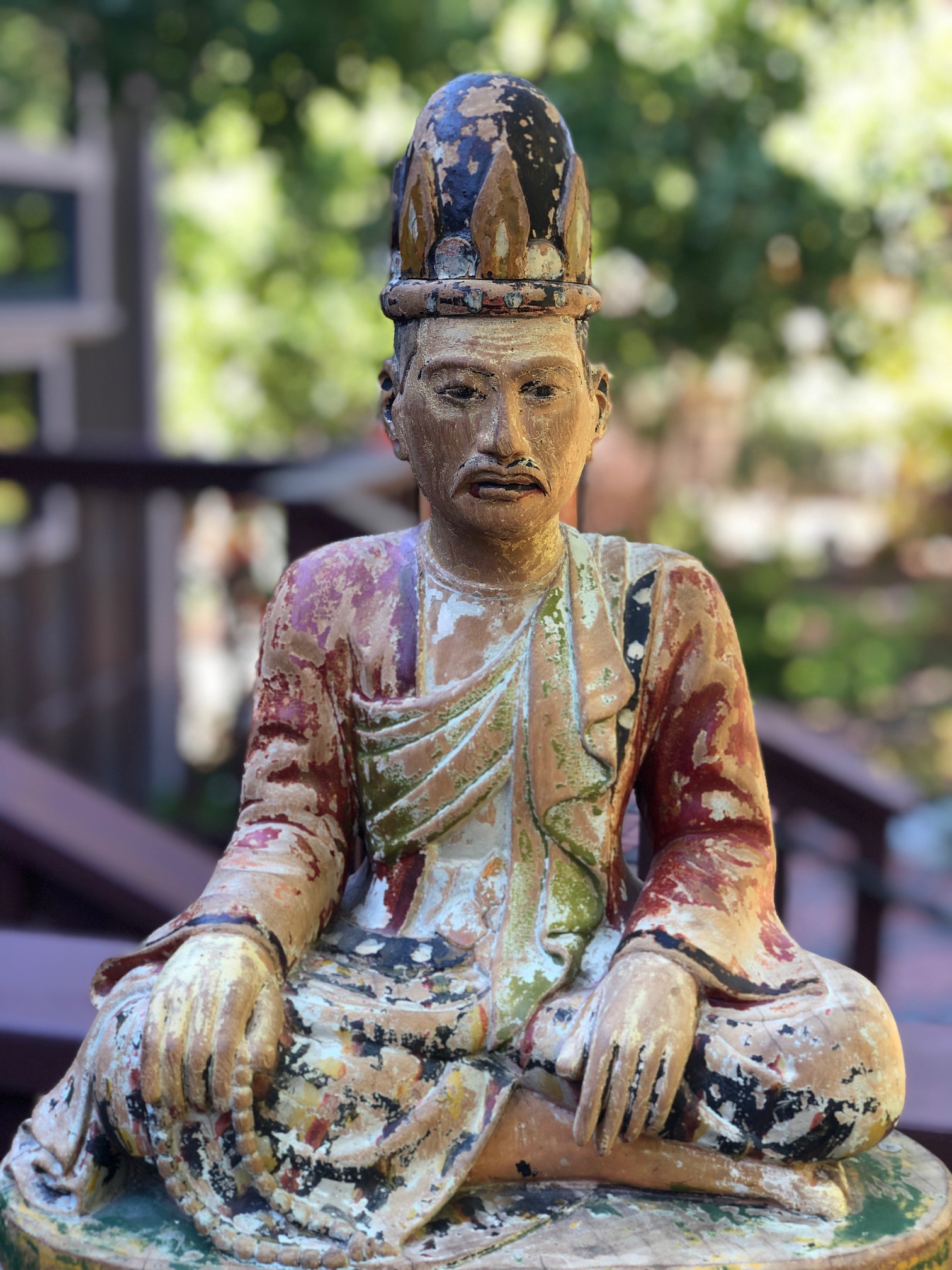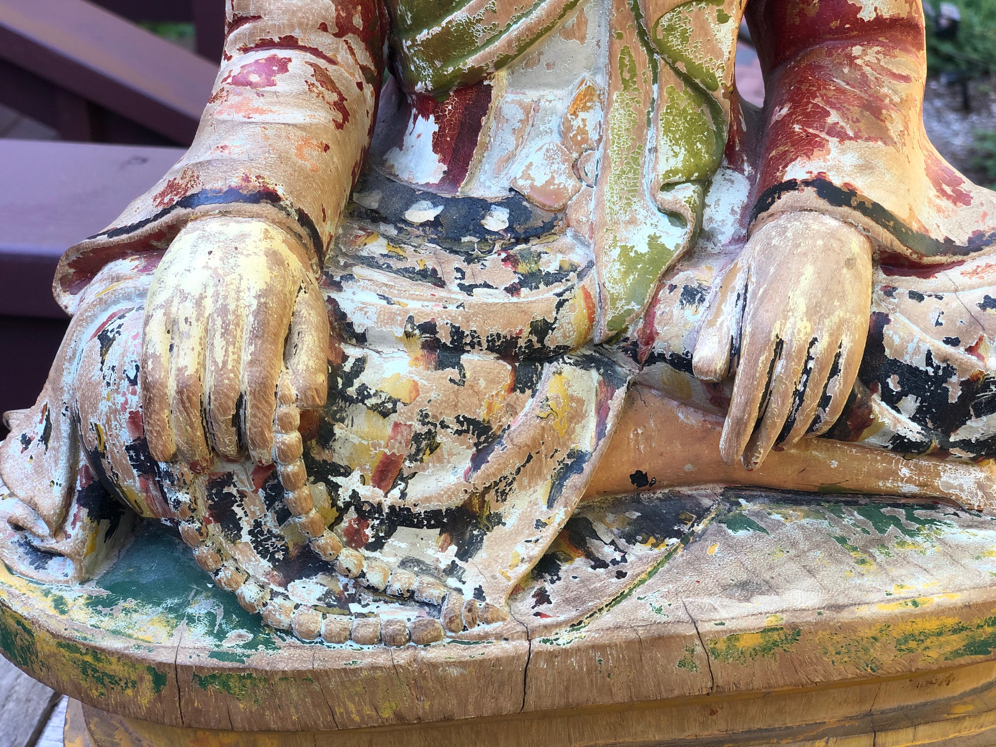 Just uncovered, packed, and ready to ship (almost 14 years ago) when it was sold in 2003 and I thought I had lost it as I could not find it to ship and refunded the buyer's money. Photos were taken with an early digital, so it is not shown to its fullest potential. I have not seen one comparable in all the years since. Made of teak or other hardwood. I purchased this early in my collecting career in the mid-1980s, as it had an individual personality- something lacking in so many Buddhist pieces. Would have sat at the feet of a really grand first quality large Buddha in a high-level temple. Best of its type- 19thC Mandalay portrait sculpture of a donor figure holding Buddhist beads. Very fine carving, with great finesse and sensitivity. The original polychrome has worn in a beautiful way. He is quite large at 20 inches tall by over 12 inches wide. Special