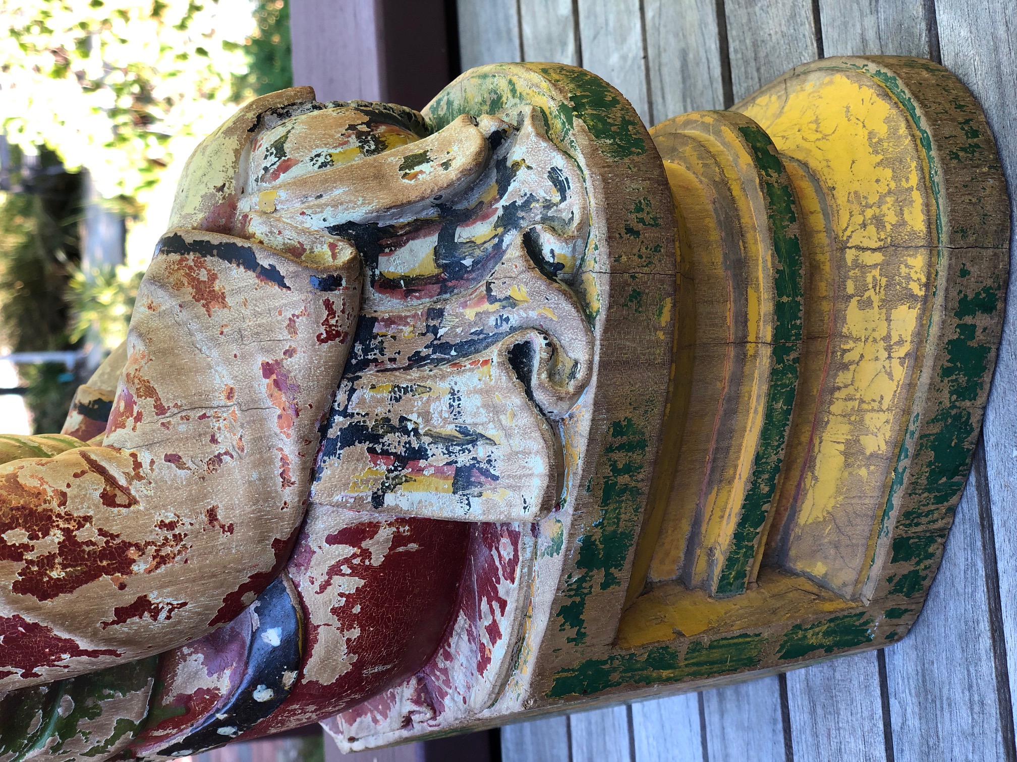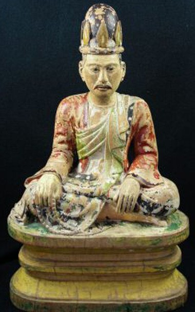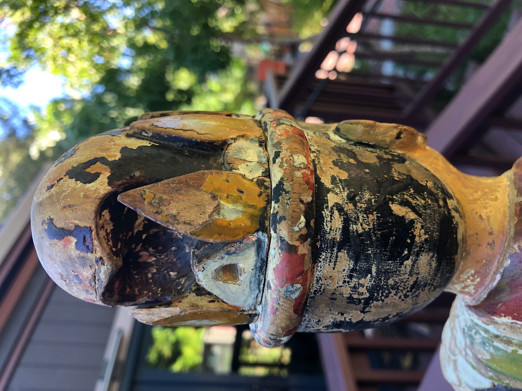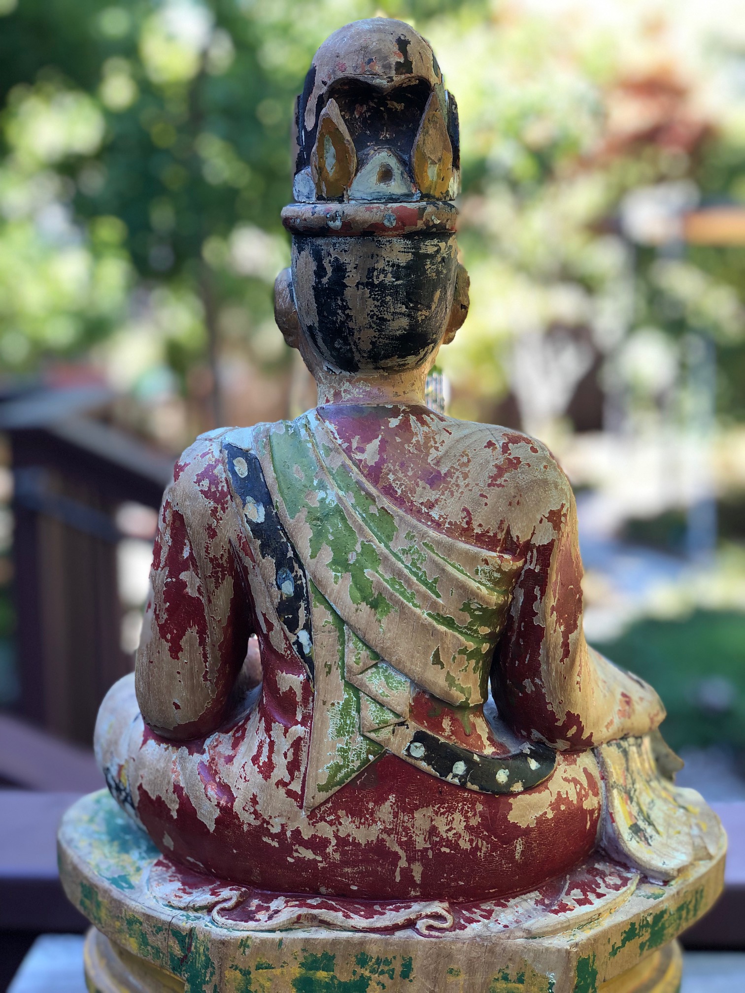 Just uncovered, packed, and ready to ship (almost 14 years ago) when it was sold in 2003 and I thought I had lost it as I could not find it to ship and refunded the buyer's money. Photos were taken with an early digital, so it is not shown to its fullest potential. I have not seen one comparable in all the years since. Made of teak or other hardwood. I purchased this early in my collecting career in the mid-1980s, as it had an individual personality- something lacking in so many Buddhist pieces. Would have sat at the feet of a really grand first quality large Buddha in a high-level temple. Best of its type- 19thC Mandalay portrait sculpture of a donor figure holding Buddhist beads. Very fine carving, with great finesse and sensitivity. The original polychrome has worn in a beautiful way. He is quite large at 20 inches tall by over 12 inches wide. Special