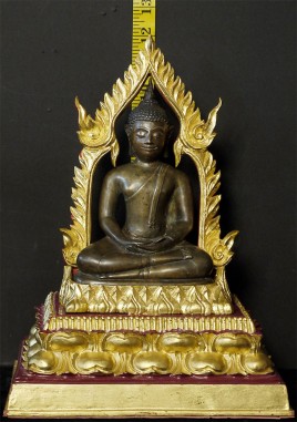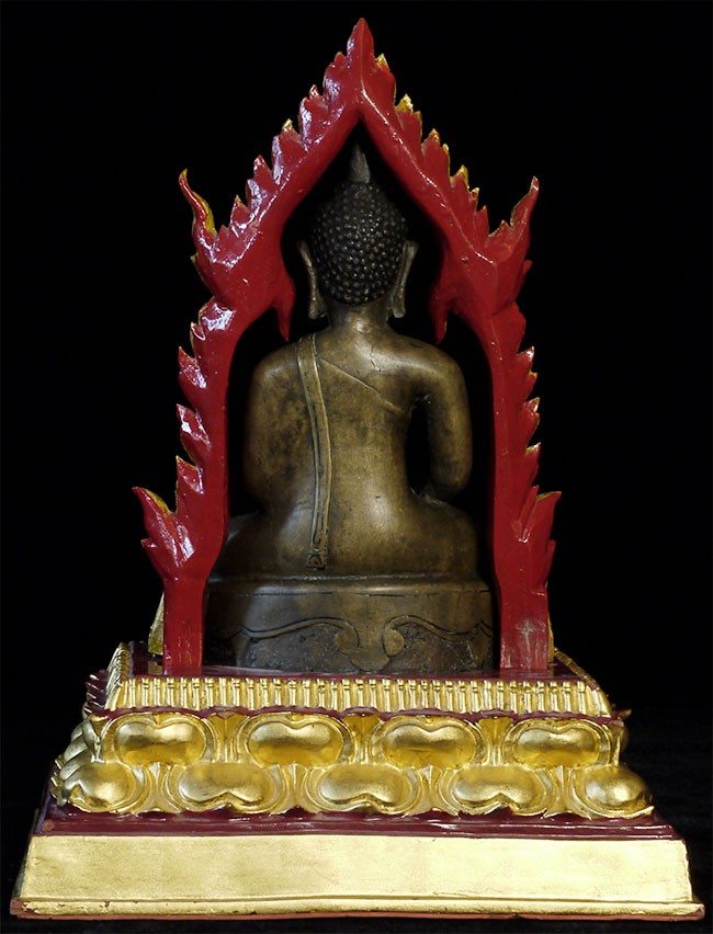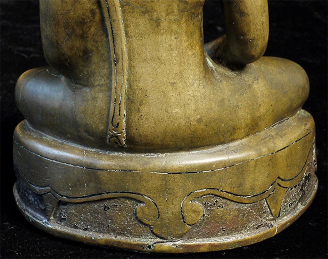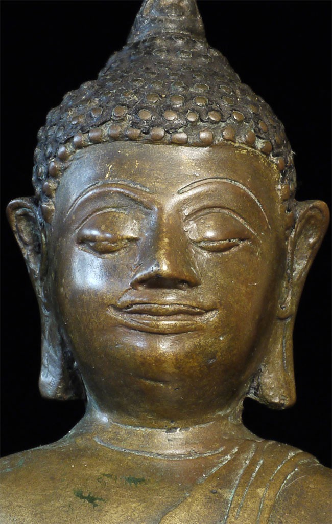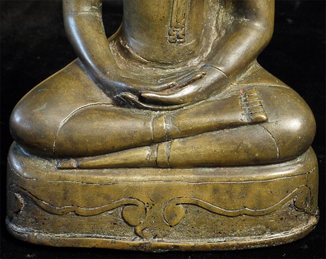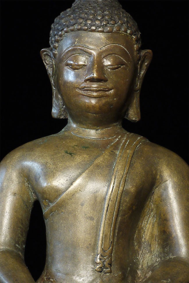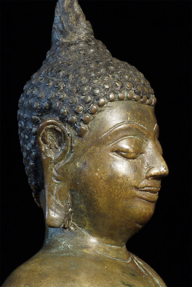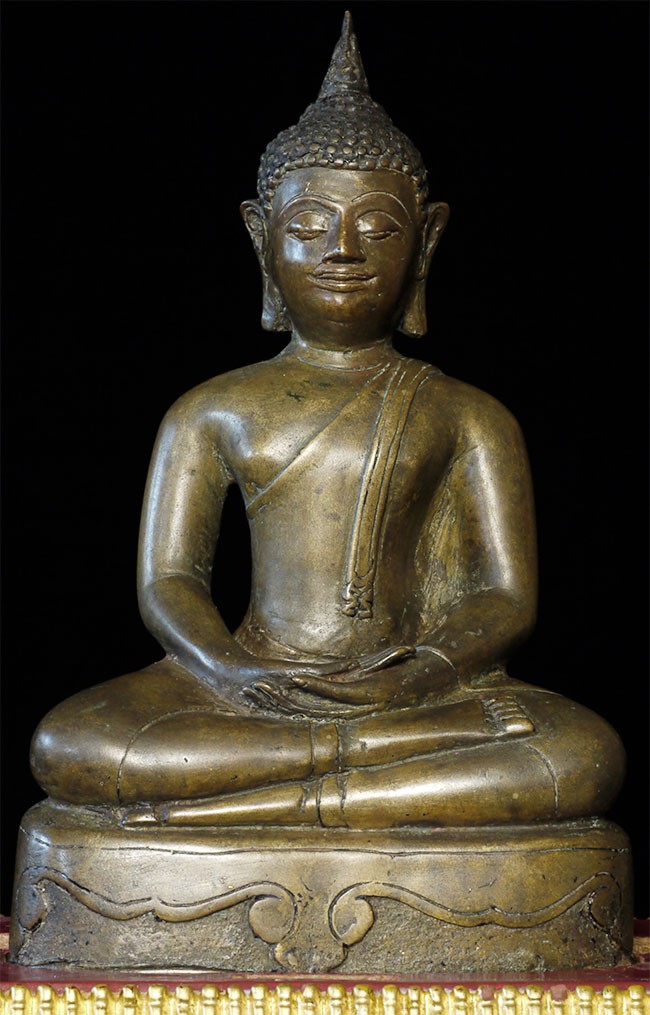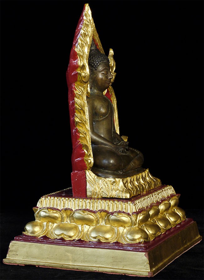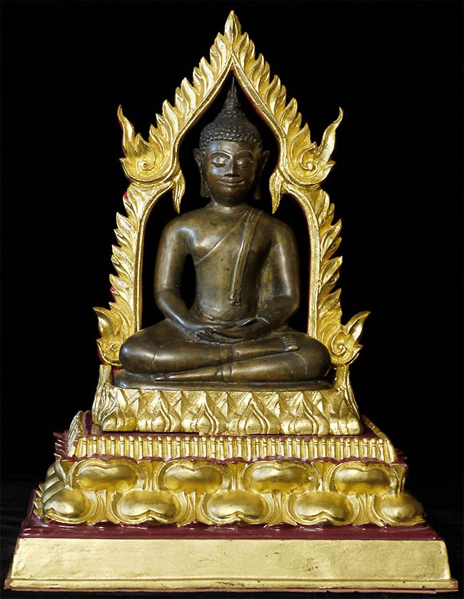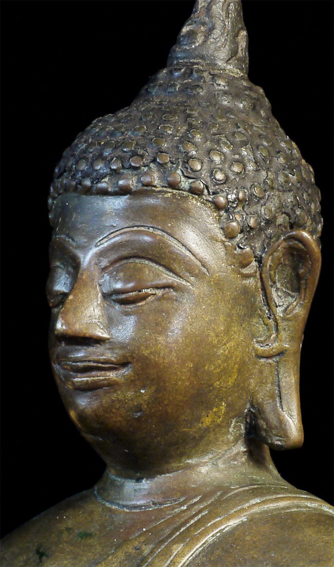A very fine, classic 15thC Kamphen Phet style Buddha. Quite rare in this quality. Bronze alone is 7.75" tall and 12" tall with its elaborate custom base. A personal favorite and best I've ever seen.