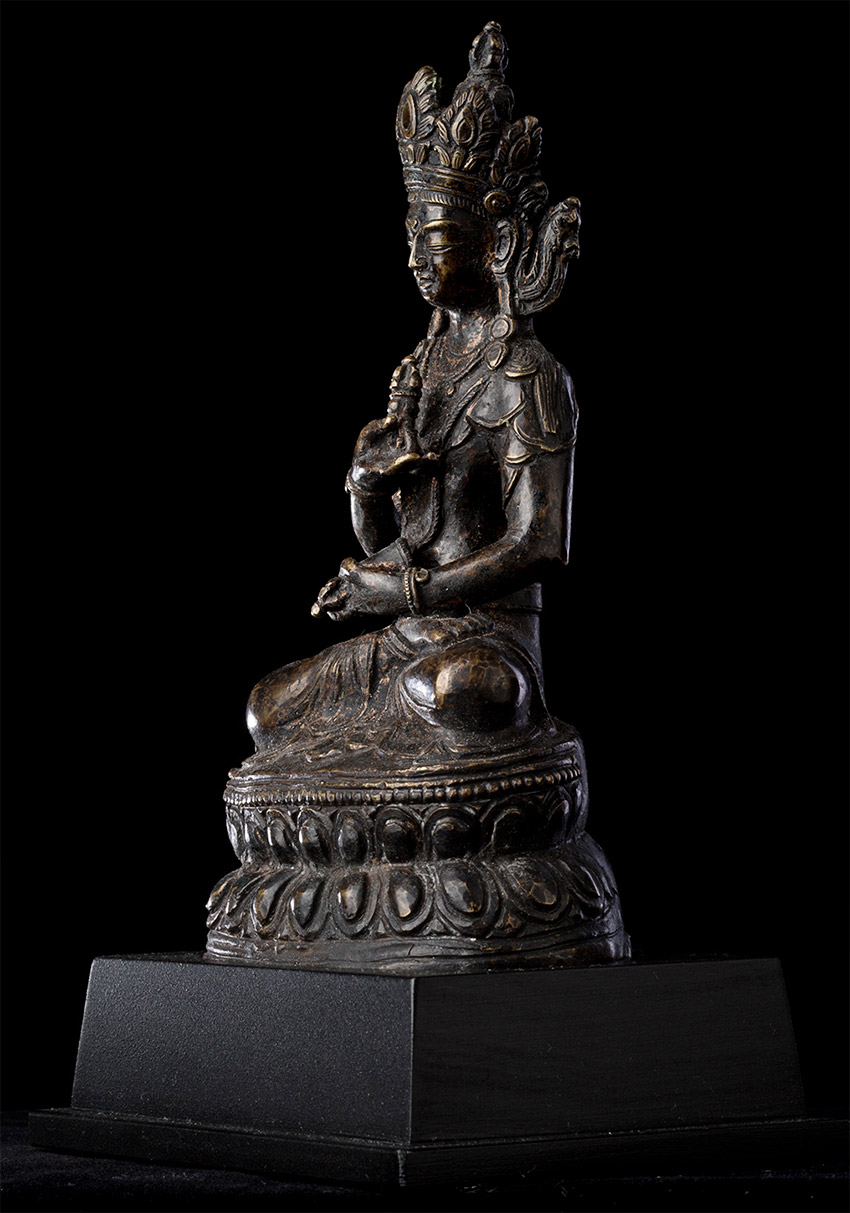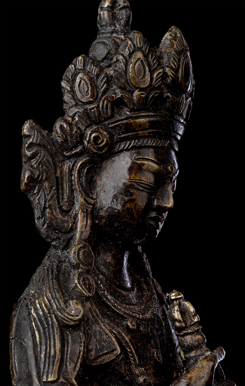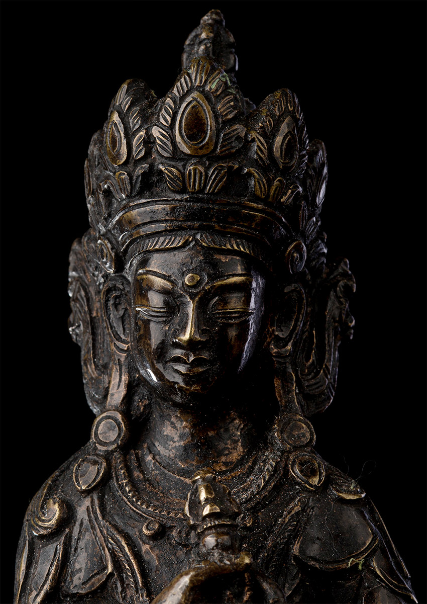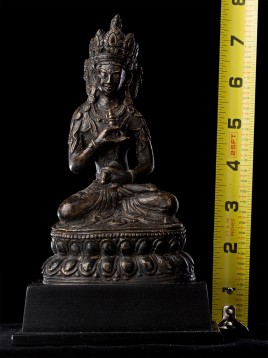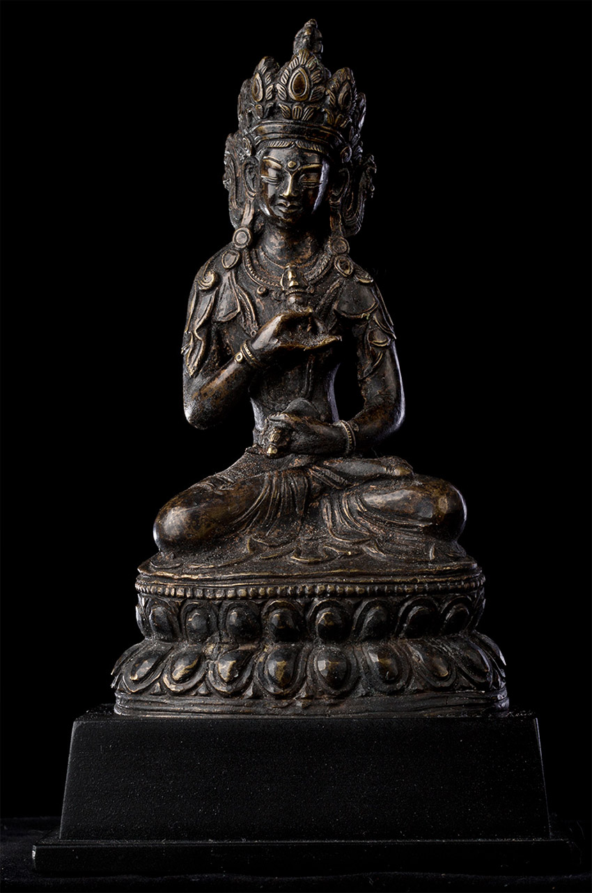 Wonderful 15thC (approx.) Tibetan Bronze Bodhisattva with silver inlay in the crown and headdress. Holding bell and dorge. From a the estate of a west coast USA collector of high end Himalayan and Chinese bronzes, who put his collection together in the 1960's and 70's. I also purchased a fine Mongolian and a classic gilded Ming piece from the same collection, which will also be listed soon. Measures 6.5" tall and 7.5" on its custom base. Consecration plate looks to be original. Something inside jingles. This piece has an especially ecstatic, joy-filled face that brings the piece into perfect balance. Special!