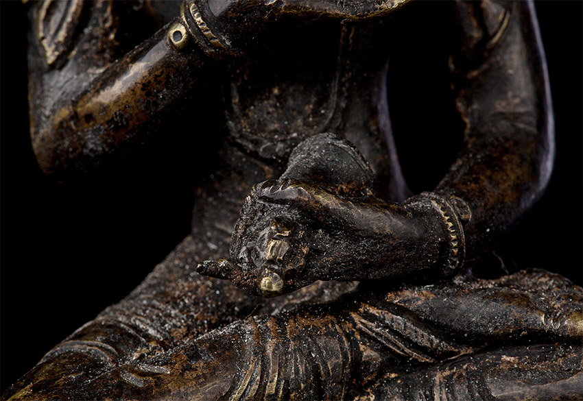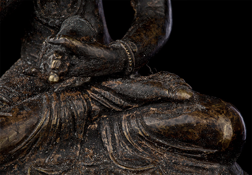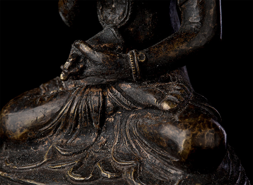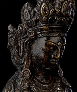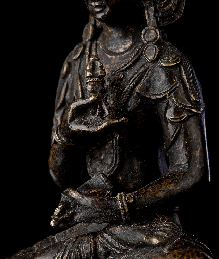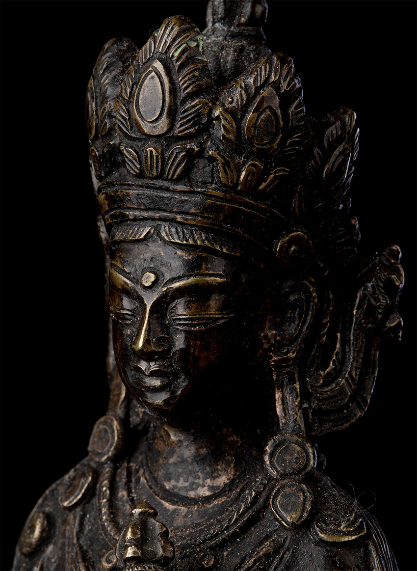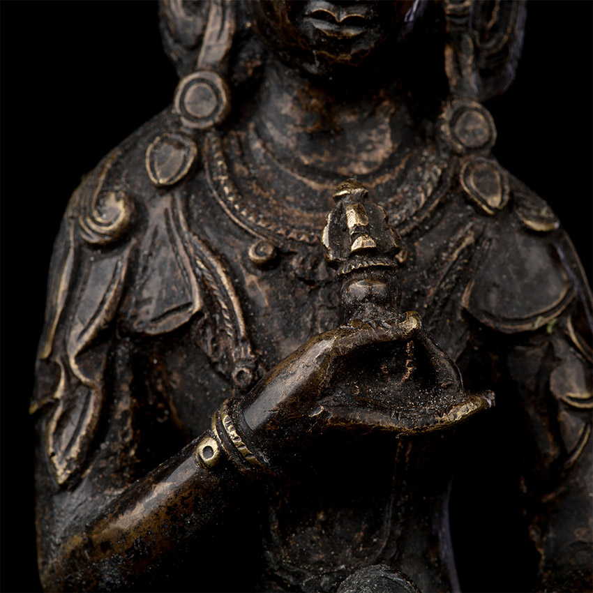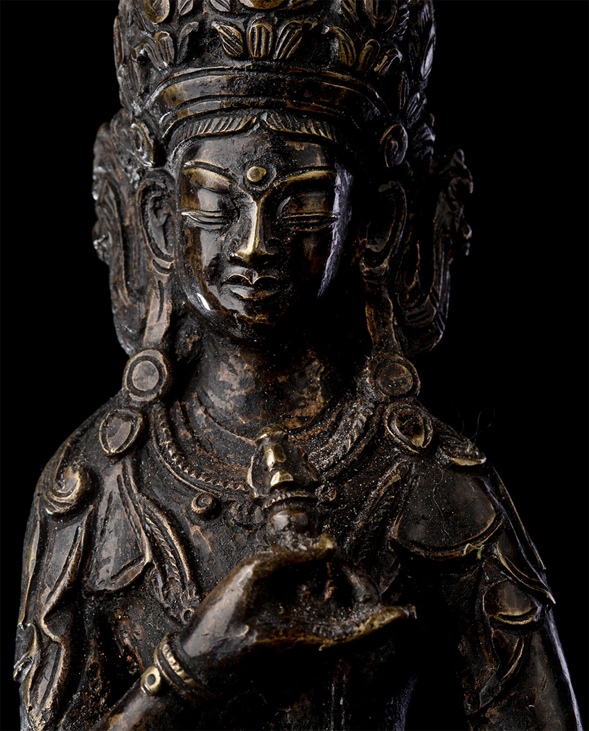 Wonderful 15thC (approx.) Tibetan Bronze Bodhisattva with silver inlay in the crown and headdress. Holding bell and dorge. From a the estate of a west coast USA collector of high end Himalayan and Chinese bronzes, who put his collection together in the 1960's and 70's. I also purchased a fine Mongolian and a classic gilded Ming piece from the same collection, which will also be listed soon. Measures 6.5" tall and 7.5" on its custom base. Consecration plate looks to be original. Something inside jingles. This piece has an especially ecstatic, joy-filled face that brings the piece into perfect balance. Special!