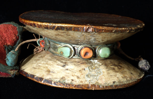 Authentic old Tibetan drum made of bone and skin (the bone is the correct kind!) Came out of an estate with other authentic items- this is the real thing- not one of the copies pouring out of China. The bands looks to be silver, the turquoise and coral look to be original, and the cloth is very old- This is the real deal. Powerful and a little disturbing, it is a true reminder of the impermanence of life. Clearly very old- I'm unsure how to date this kind of item.