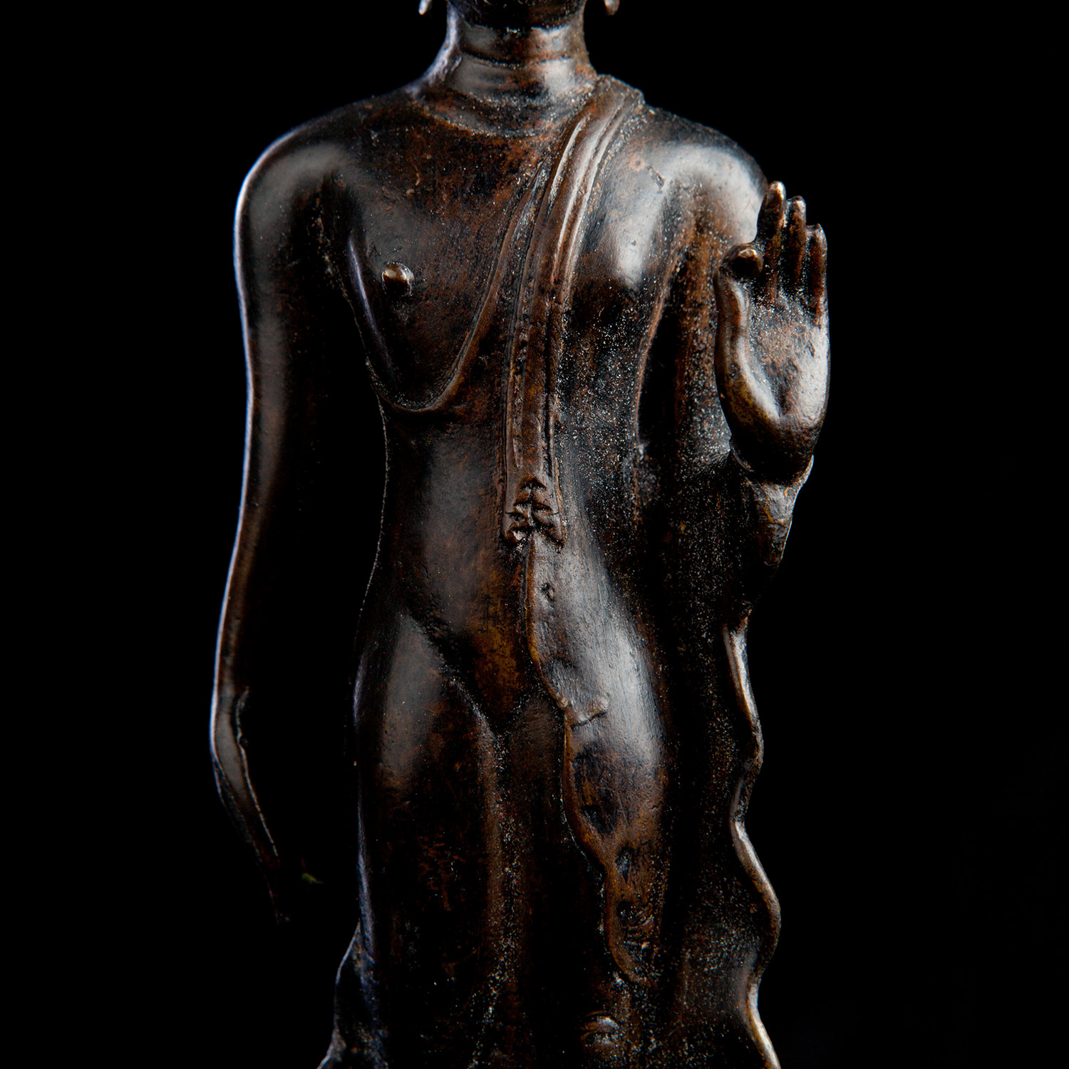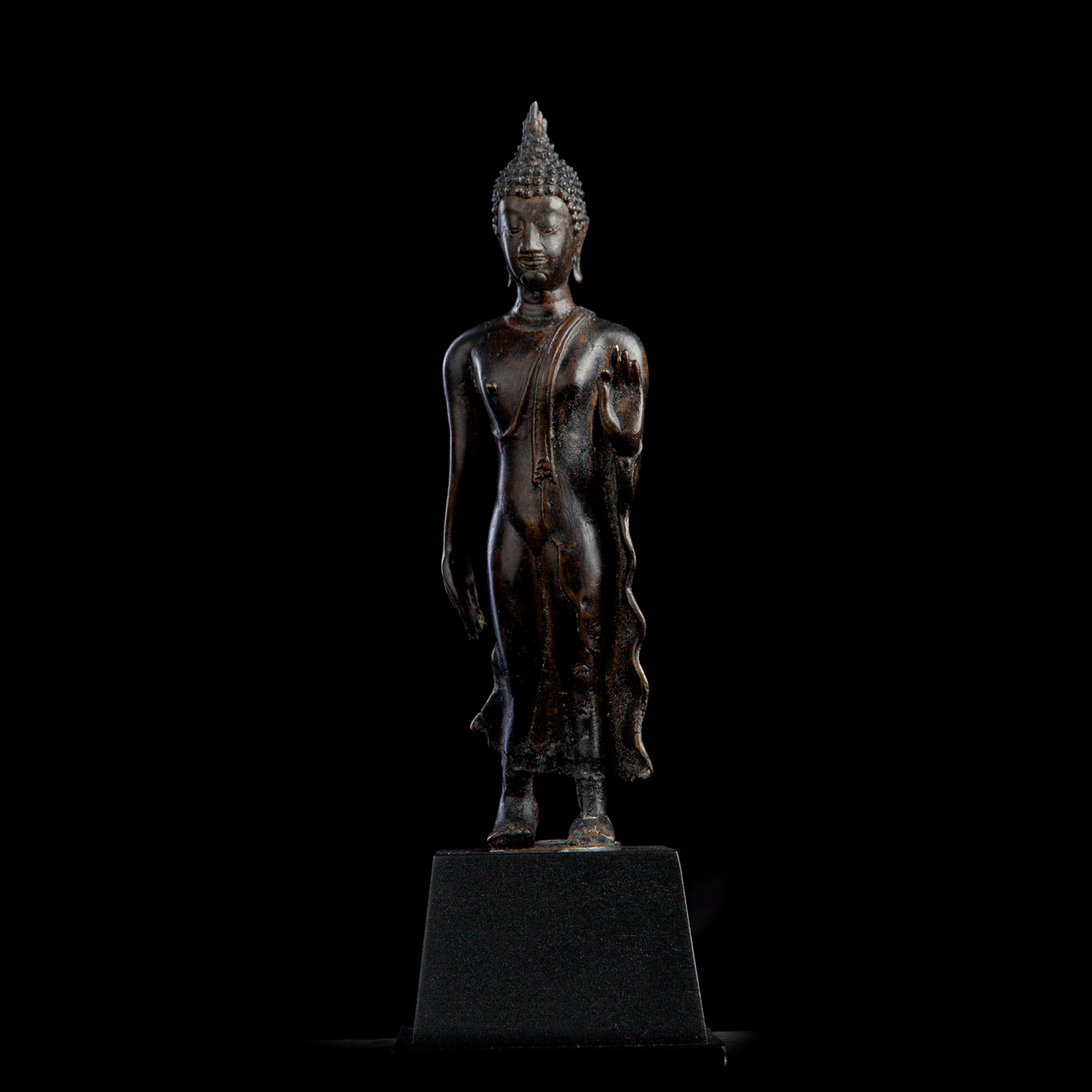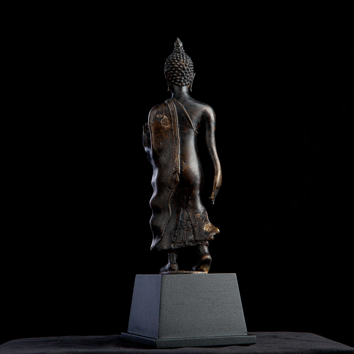 18/19thC Thai Walking Bronze Buddha. More than 95% of the walking Buddhas made were made in the late 19thC, under Rama V. This one may be a bit earlier. In perfect condition. Measures 7-1/8" bronze only, and is 9-7/16" tall on its custom base.