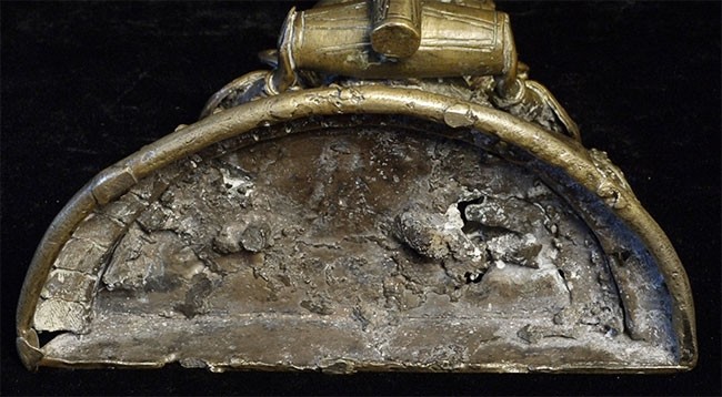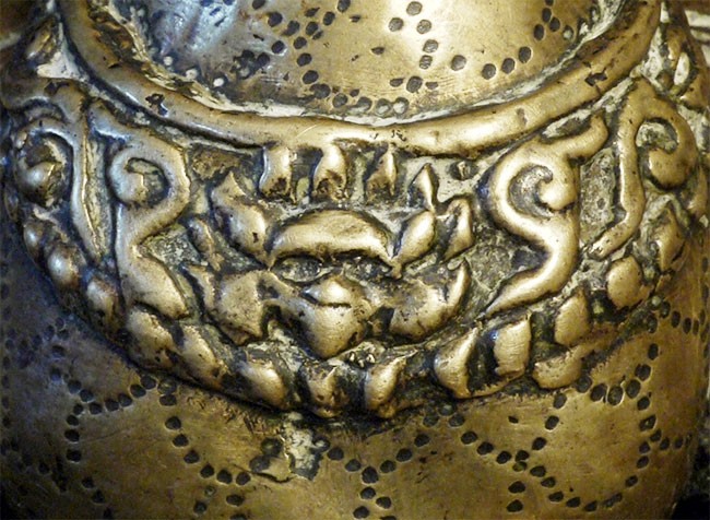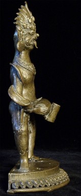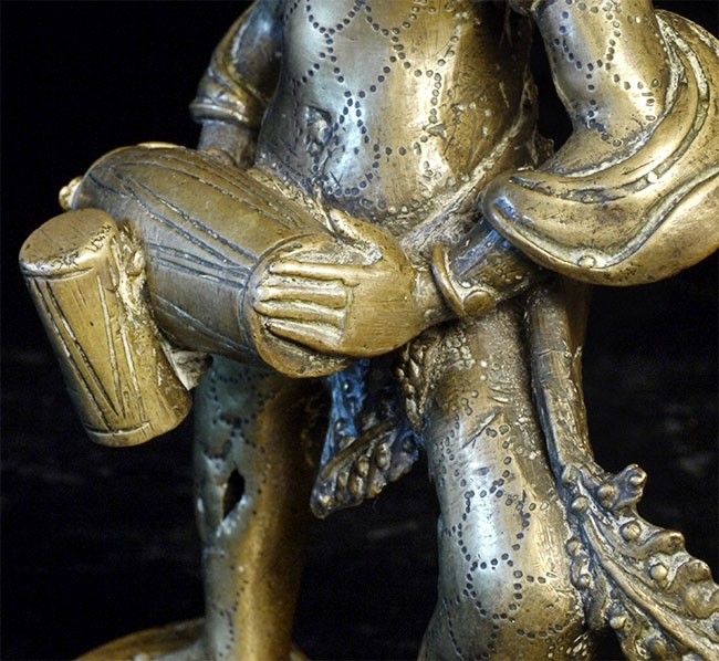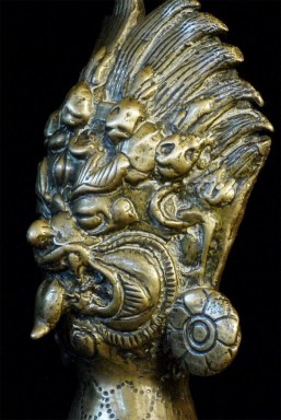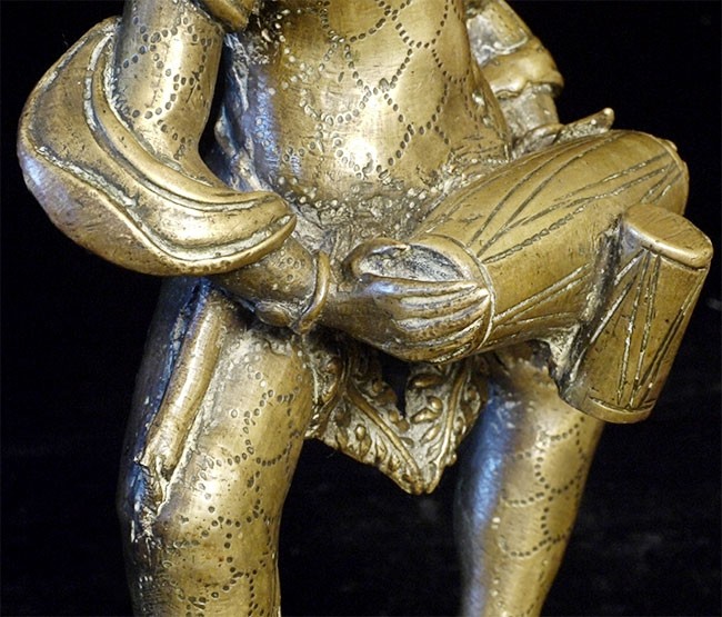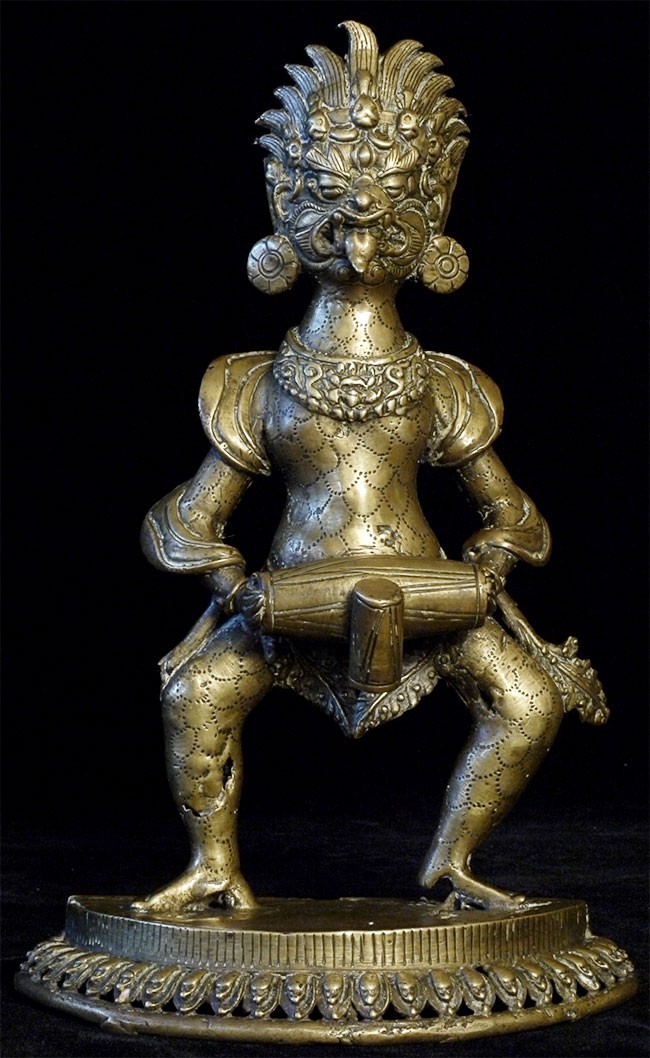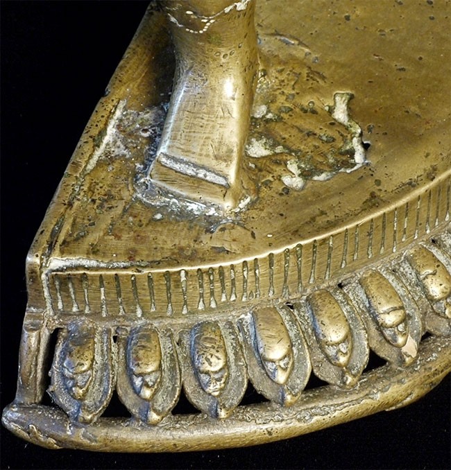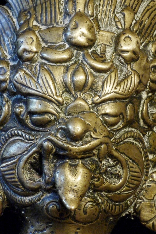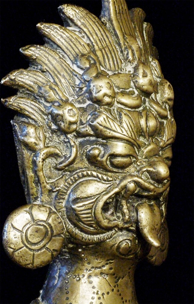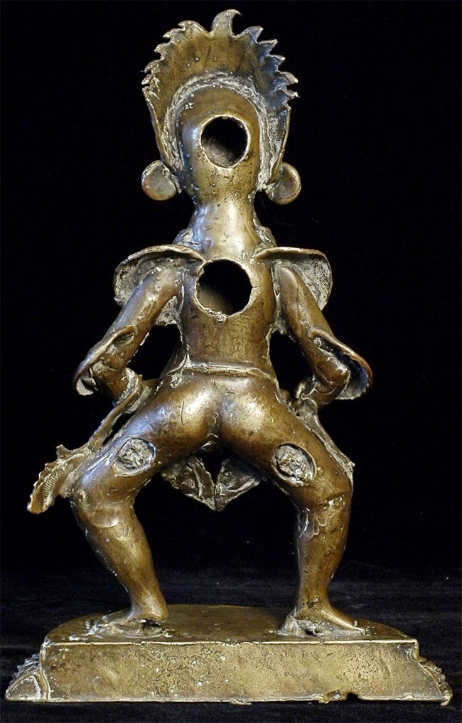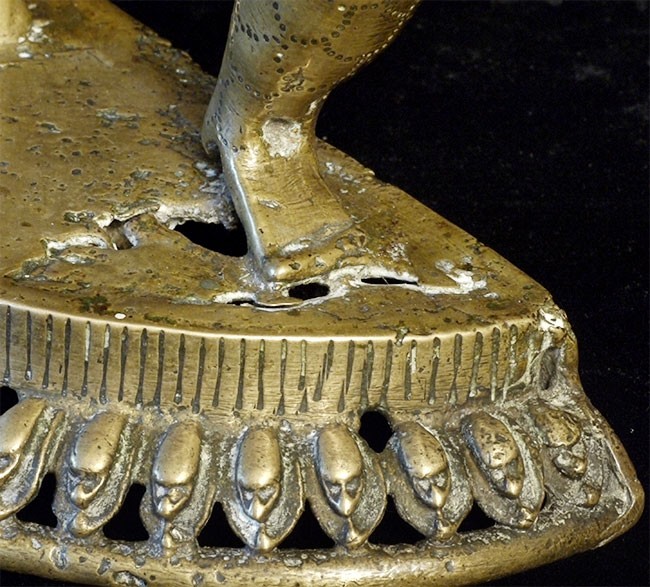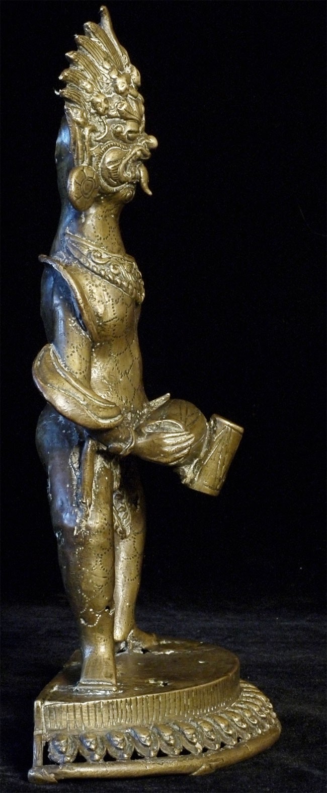 Antique Nepalese fierce deity. Good size at 10 1/4 inches tall, 7 inches wide, and 3 1/8 inches deep. Significant wear suggests may be 18thC or earlier. Excellent detail still shows through the wear. Some original casting flaws on the lower legs. Extremely energetic and charismatic overall--commands attention across a room in a way that few statues its size manage to do. Has a true "tantric" feel. Looks to have had multiple consecrations. Never seen another like him. Almost seems alive. The remains of the cleaning solution in crevices (appear white); can mostly be removed, but I leave it up to the next owner to decide. There is already less now than in the photos, as I have already removed some of it.