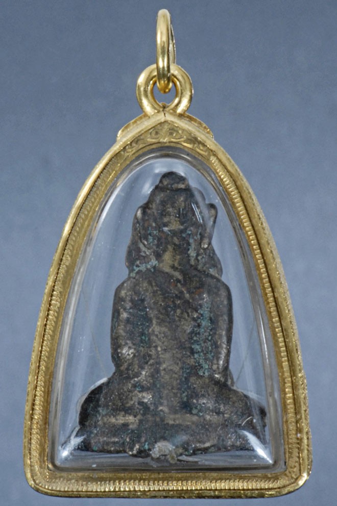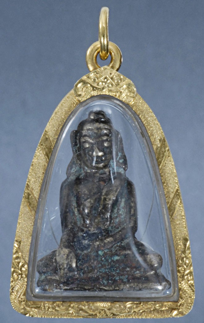 Mon silver Buddha in a contemporary 22k gold frame. Pre 1000 A.D. Rare and powerful early Buddhist relic. Excavated in the early 20thC with a cache of other small bronze Buddhas of this same style. This was supposedly the smallest and most intense one of the group. I have owned three others that I am pretty sure are from the same group, and this is the one I invested in having a 22k frame made by a jeweler out gold that came to me through my family. For a long time I wore this every day, but as I got older it got heavy. Very animated and hard to capture in photos. Measures 1 3/4 inches tall.