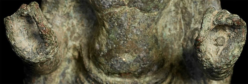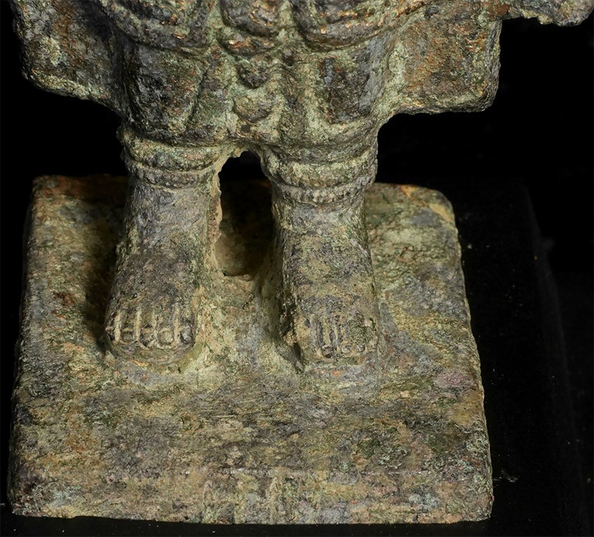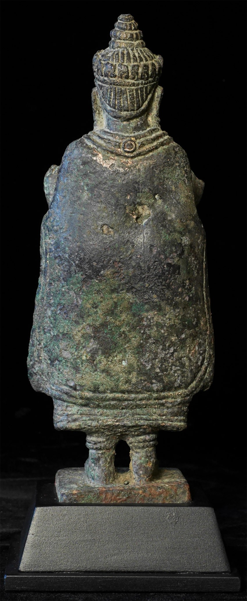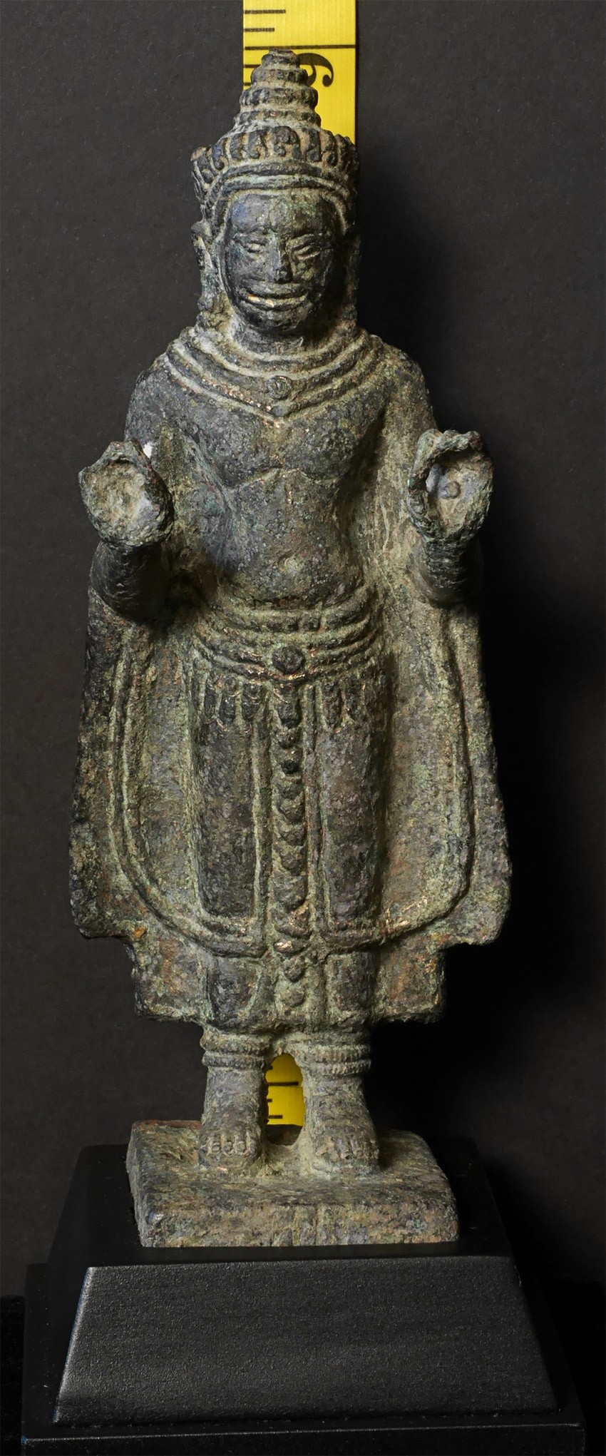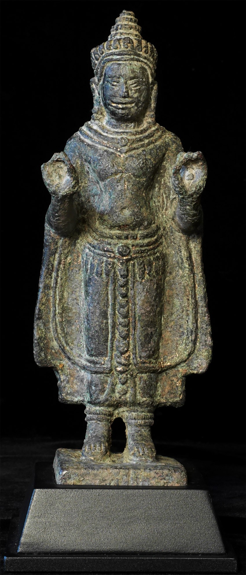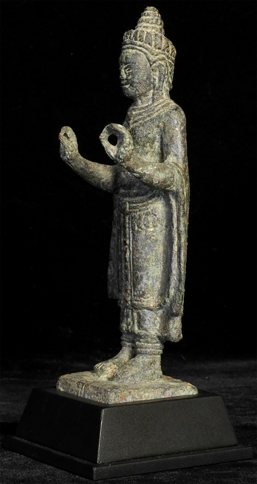 13th Century Thailand bronze Buddha. It is from the same period as Angkor Wat in Cambodia but was done in Thailand --the robes and face are somewhat different, and the face is a bit friendlier. Hard to capture the beauty in the photos. He is large for this type of piece at a full 8 inches tall, 9 inches on its custom base. There is wear and loss to the fingers as seen in the photos, but otherwise in complete and unrepaired and untouched condition, with an extraordinarily deep, rich patina.