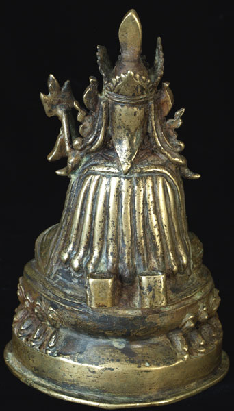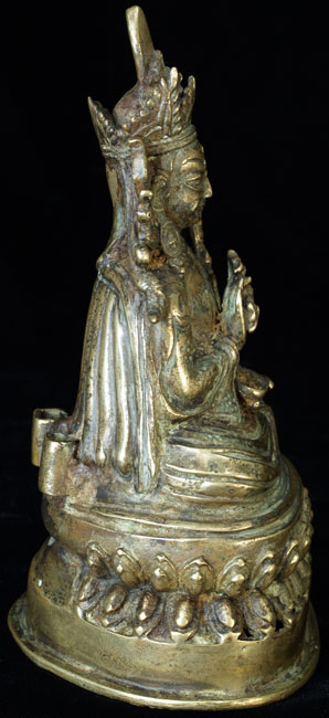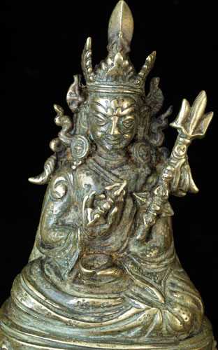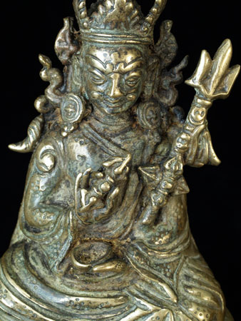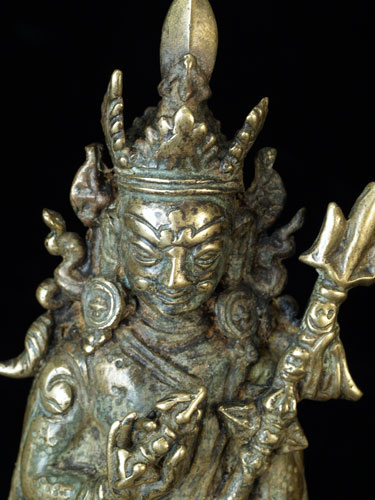Nicely sculpted, very expressive, and quite detailed Buddhist bronze or brass figure. He is holding a scull cup and dorge, and a trident, all of which are clearly cast. Originally Had a Mandorla attached to the back, as can be seen in the photos. This item is much less common the majority of related pieces I have posted. He is a full 6 inches tall. Minor traces of old red devotional powder indicated that this has clearly been a devotional piece. A quality sculpture.
