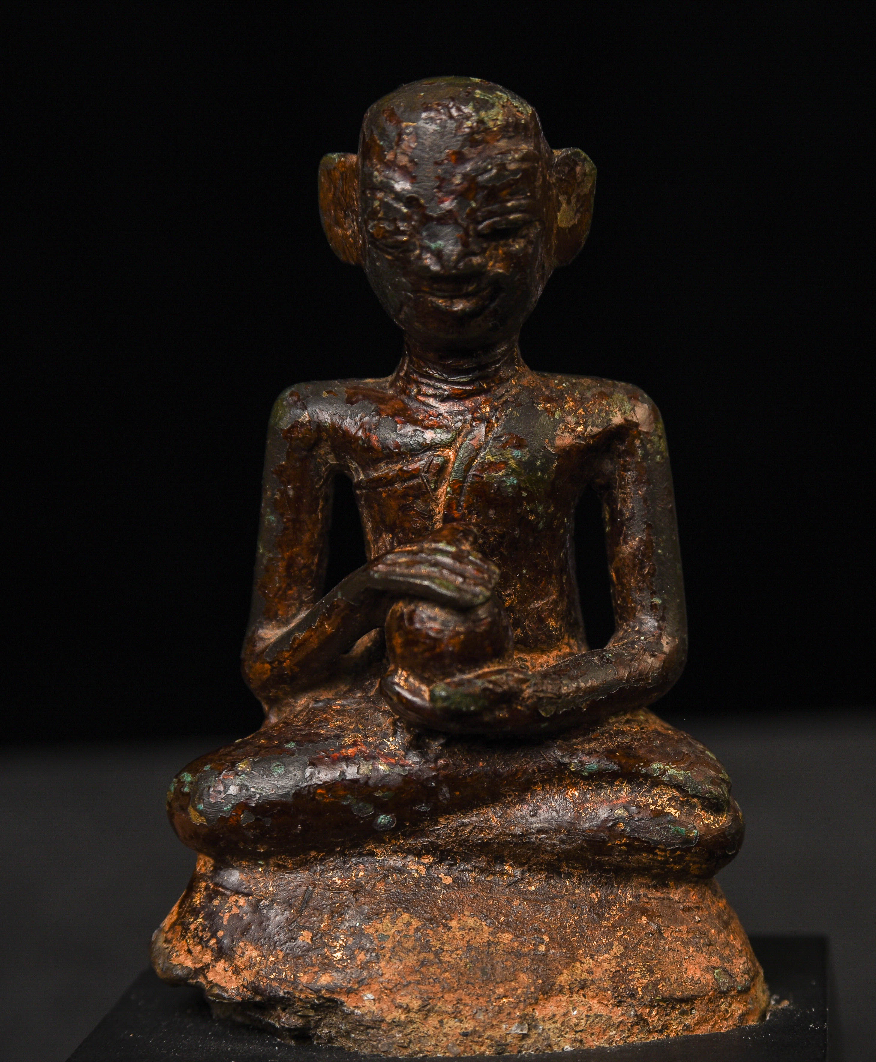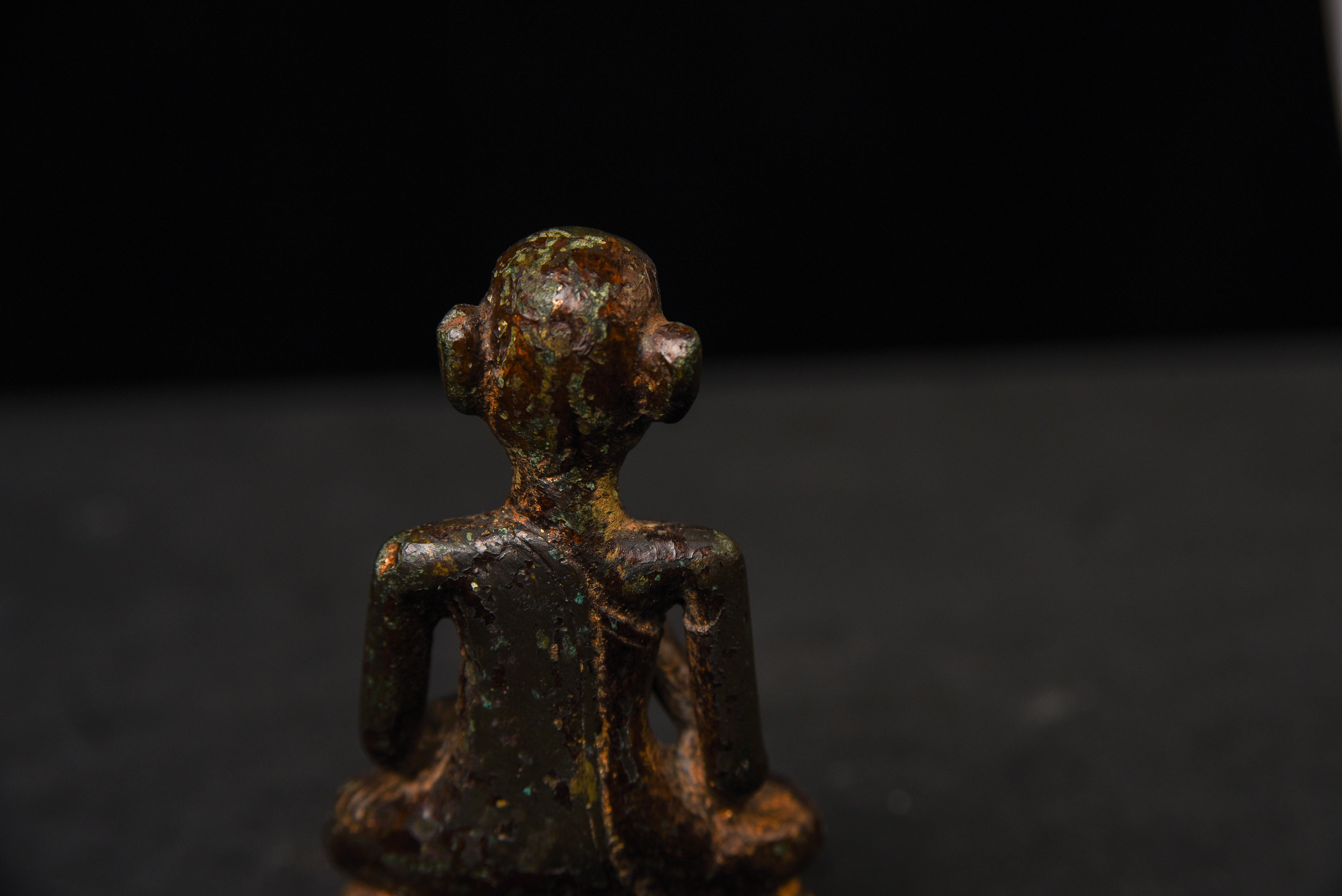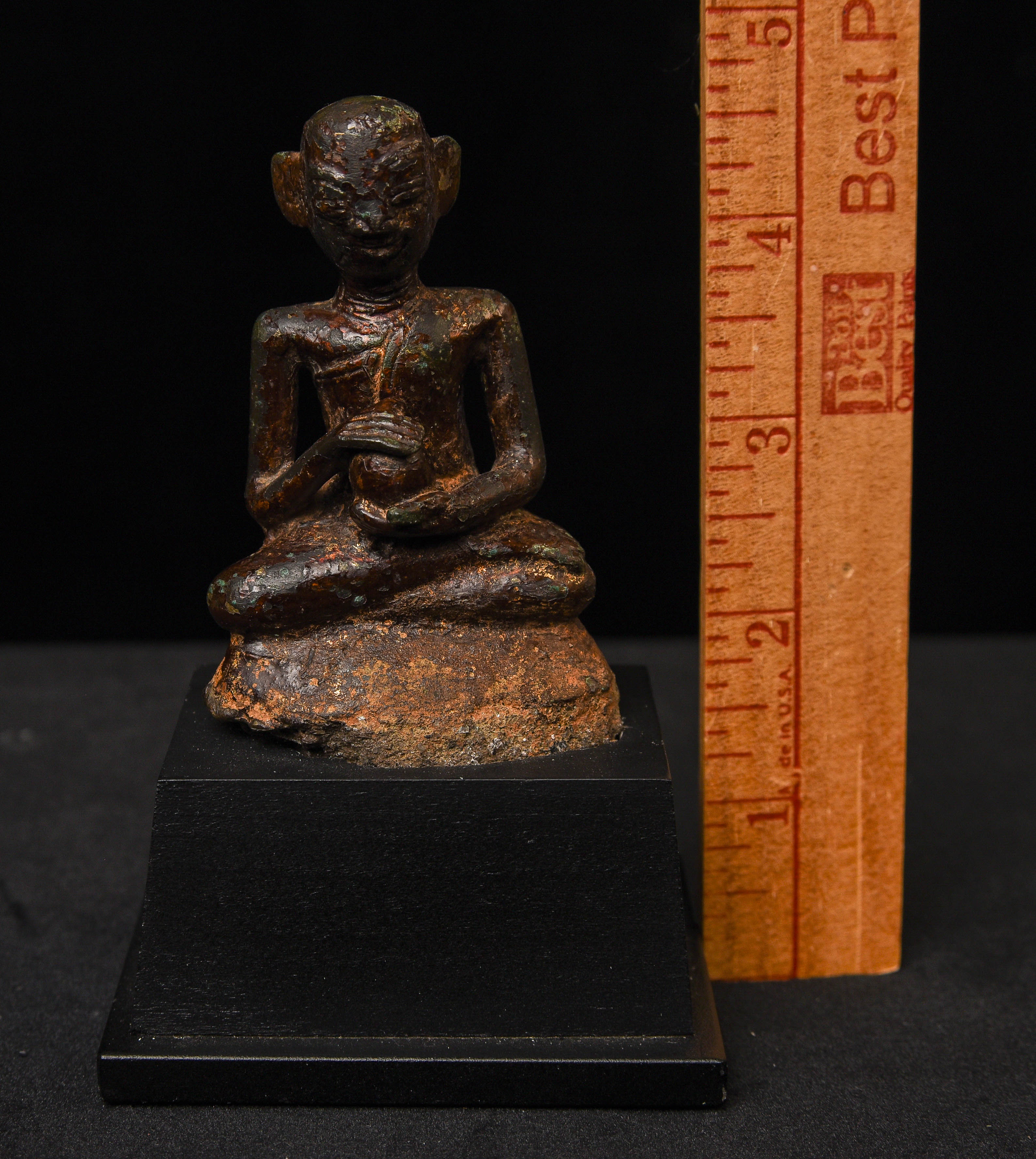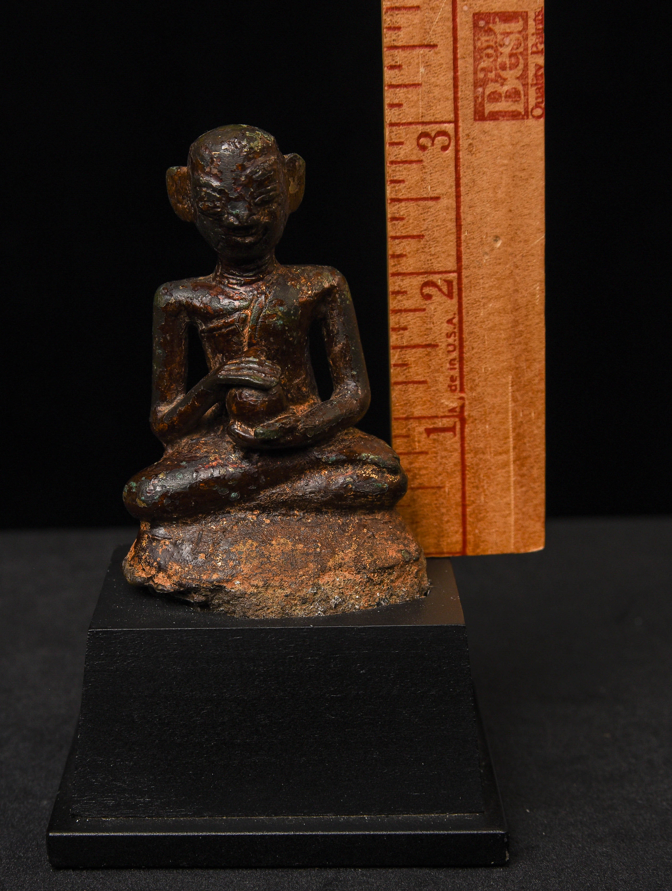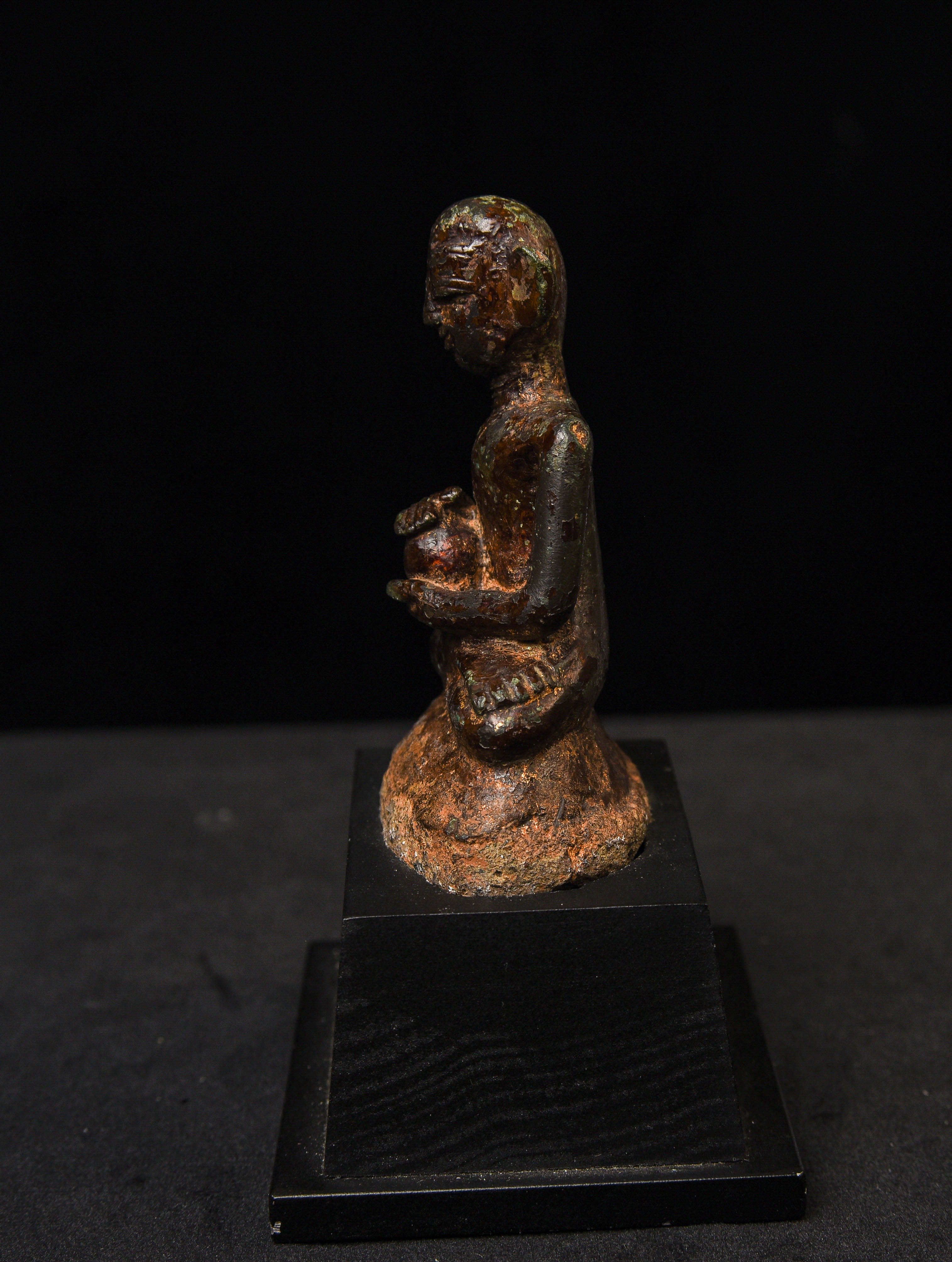Very early Pyu Burmese Buddhist monk or pre-enlightened Buddha. Solid cast. Holding a ball in the same manner as the 7-9th century Pyu Buddha images, likely of that period or at most a little later. Sits happily at 3-1/8 inches tall, 4.5 inches on a custom stand. It's a rare early type - I've never seen another Monk like this (mostly Buddhas and an occasional Bodhisattva). It is a genuinely advanced collector/museum-level piece. Domestic shipping is included, and international shipping is $200 including packing and insurance to anywhere in the world.