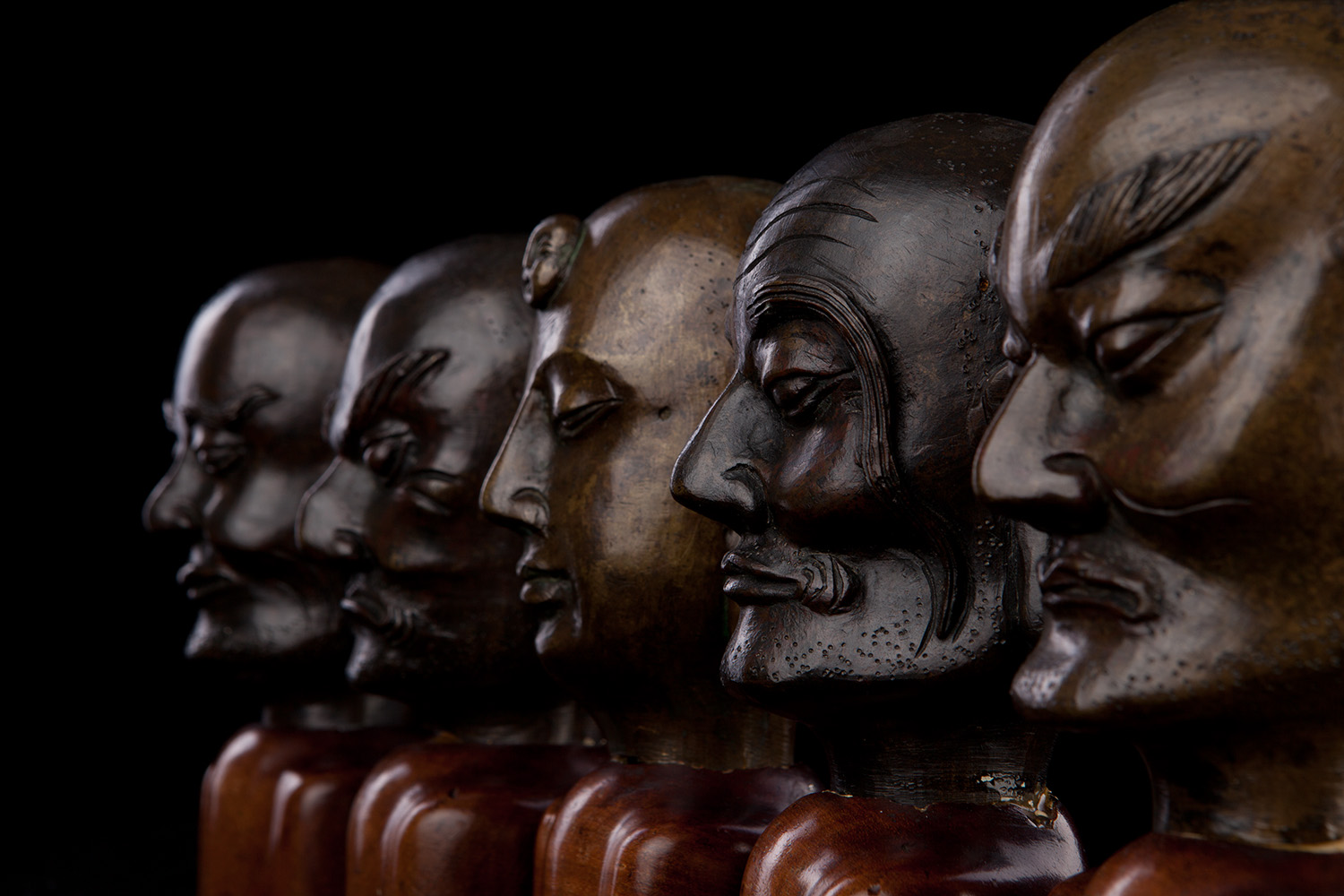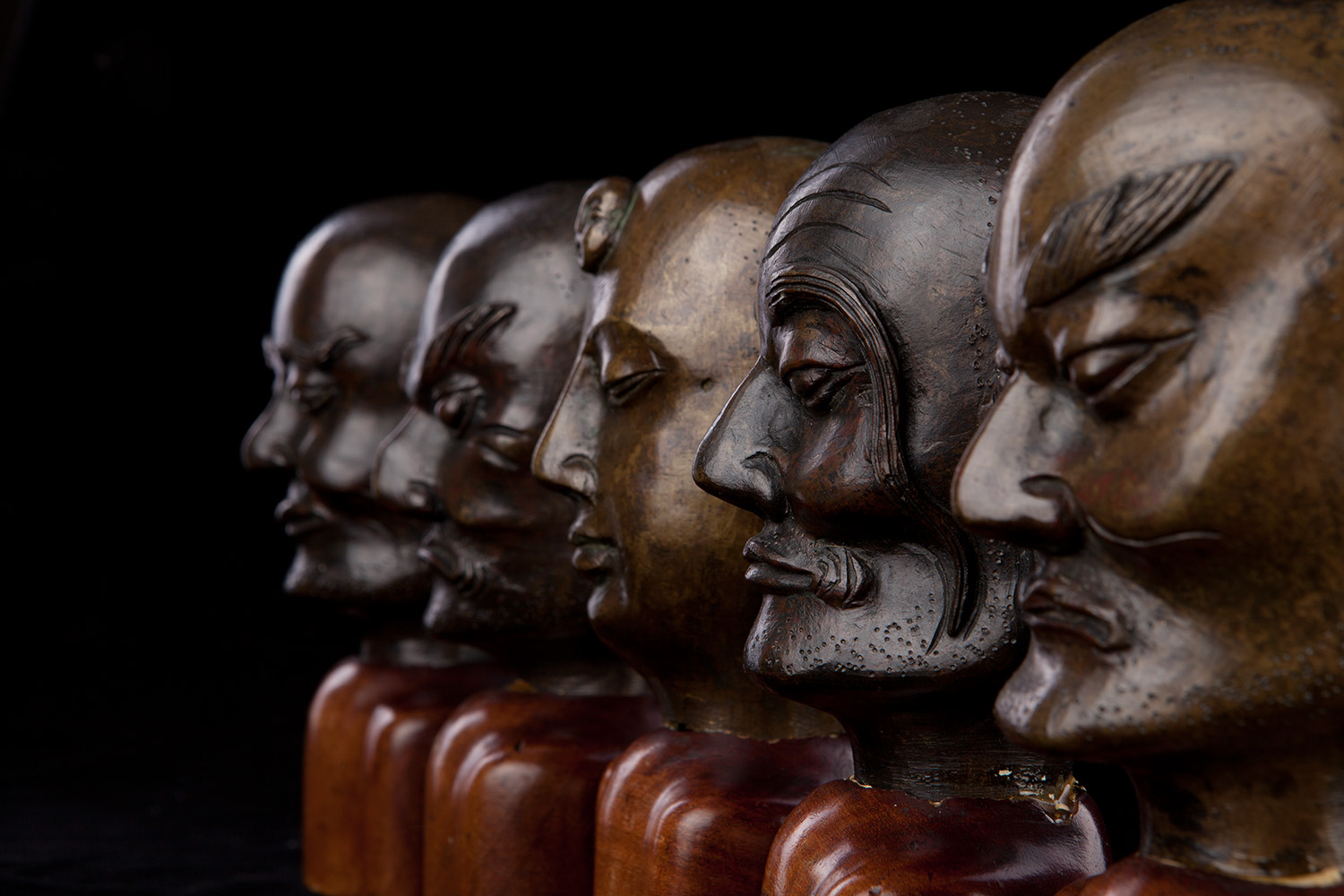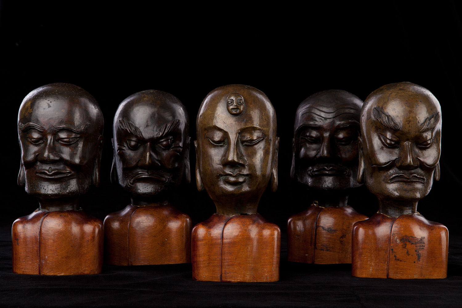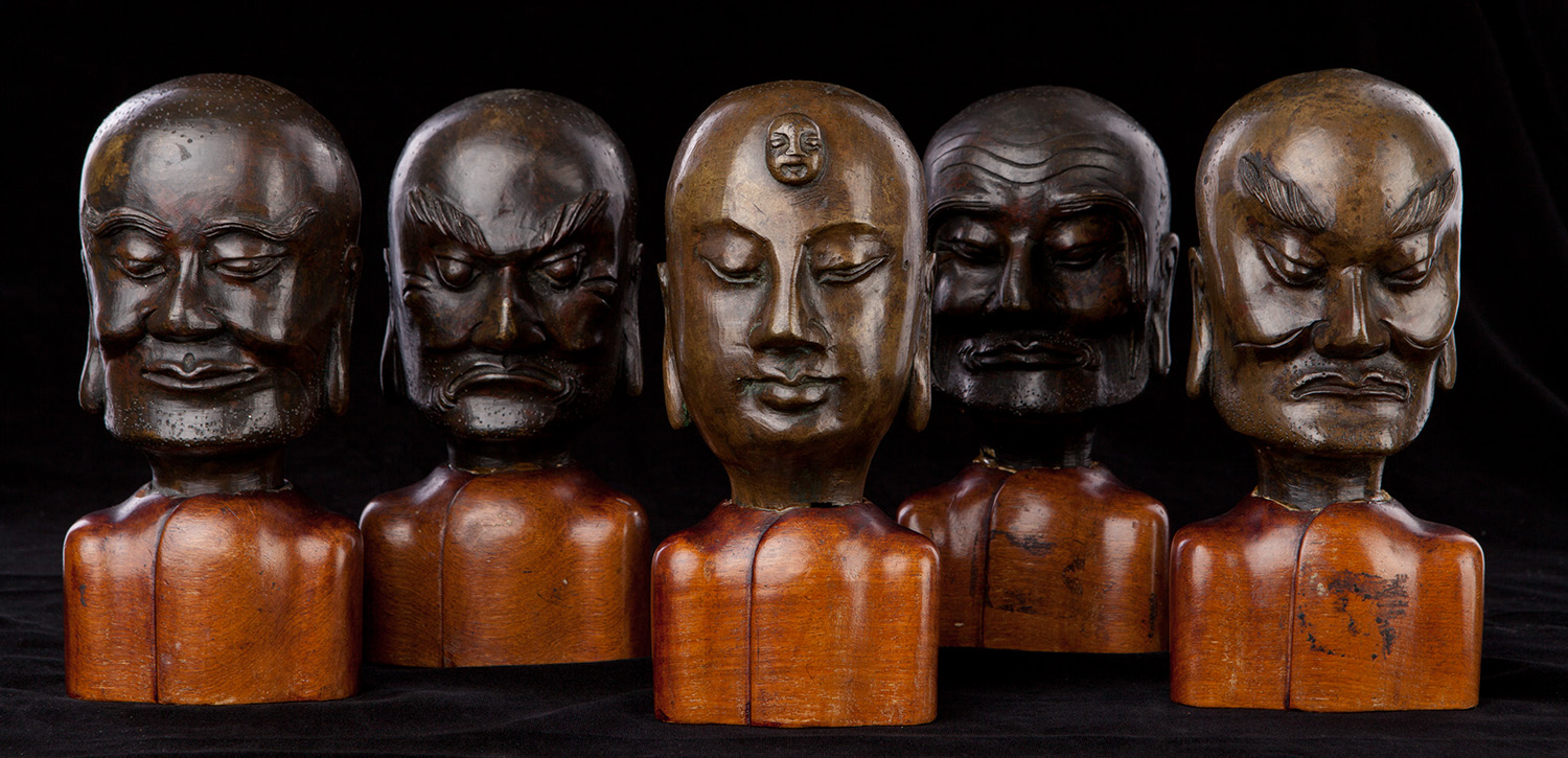 Set of Five 17th/18th Century (or Earlier) Bronze Lohan Heads. A rare and beautifully cast group of five Lohan (Arhat) heads, dating to the 17th–18th century or earlier. Each head measures approximately 7⅝ inches tall including the base, with the bronze portions themselves about 5 inches in height—an impressive and desirable size for works of this type.