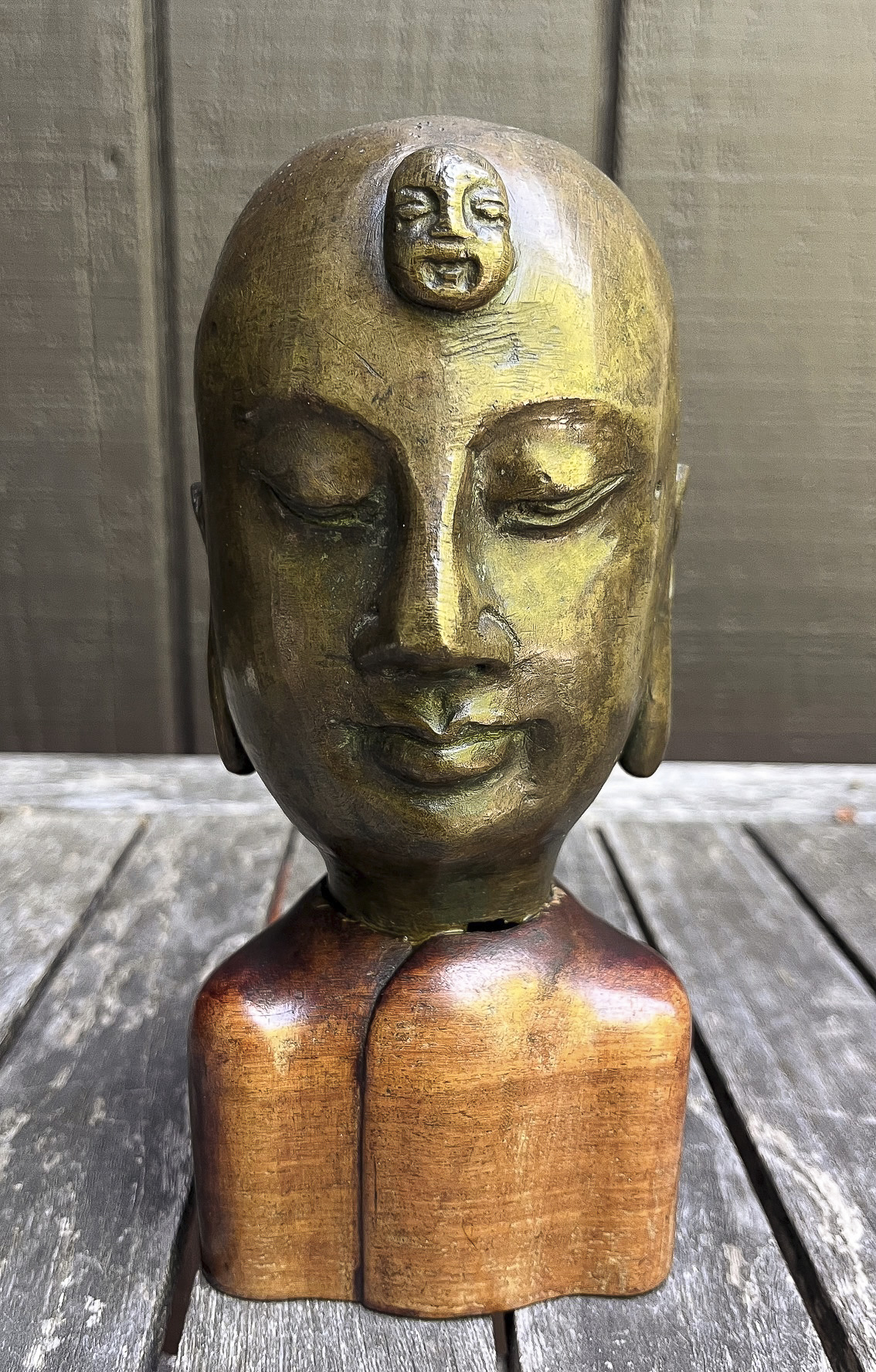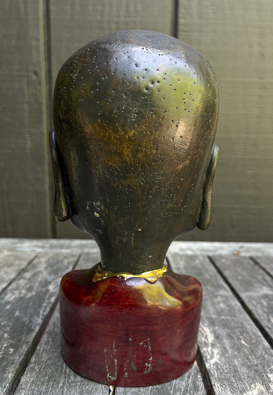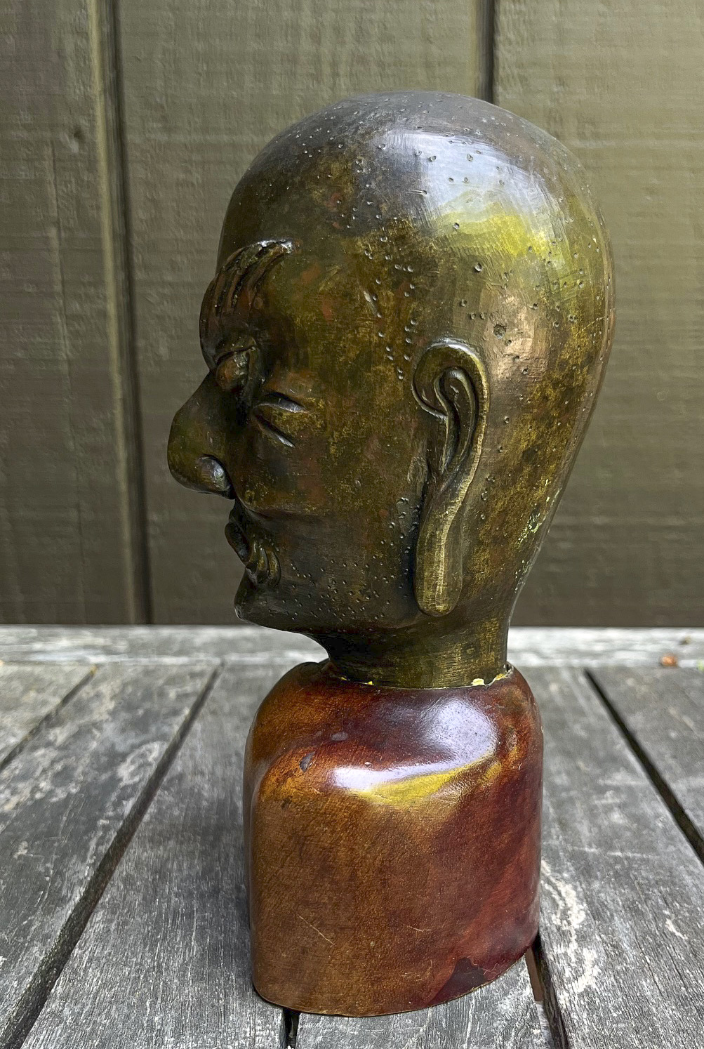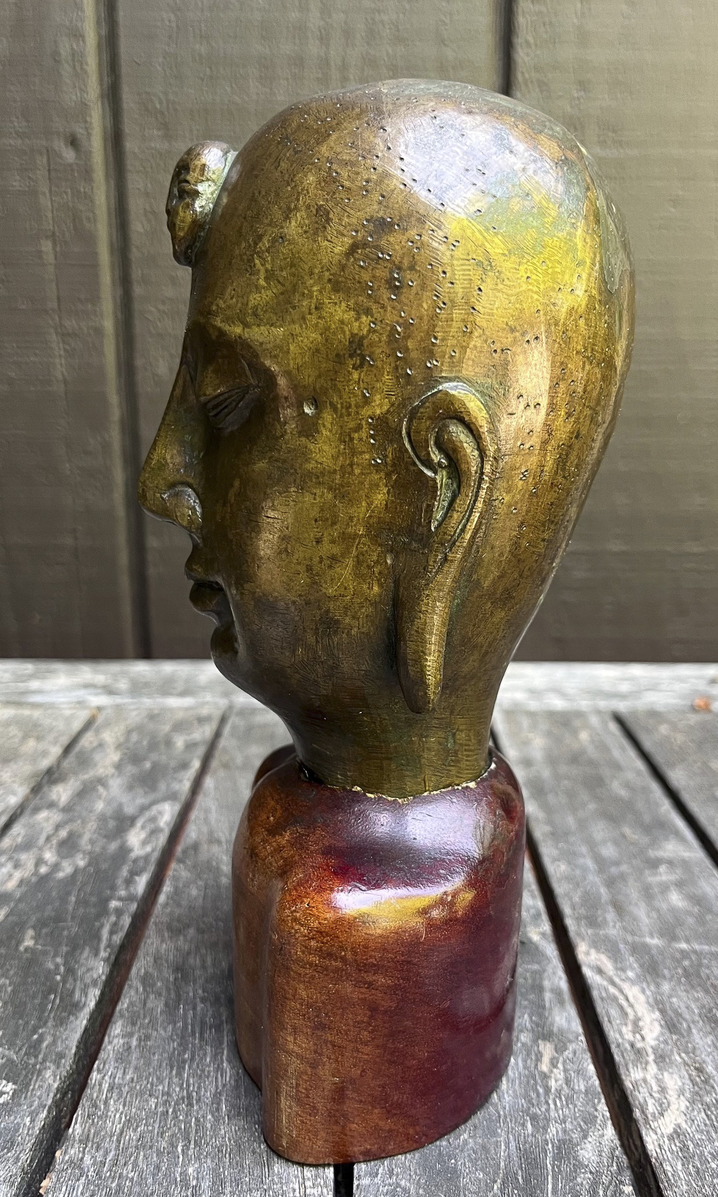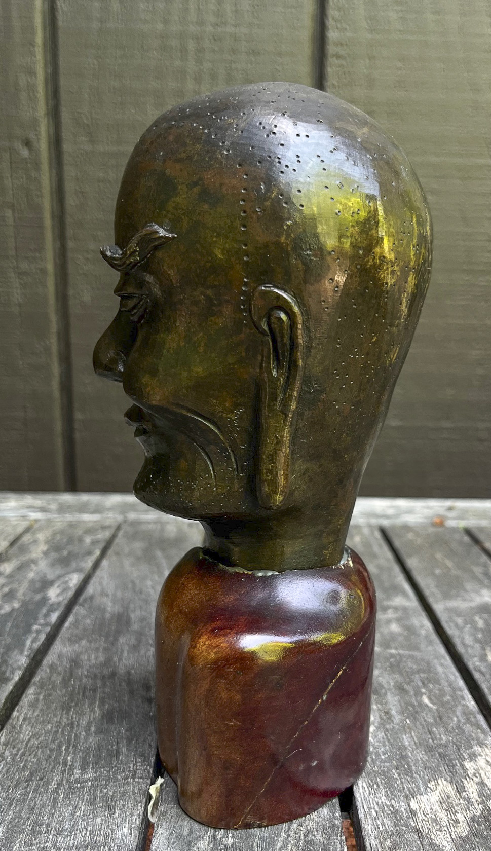 Set of Five 17th/18th Century (or Earlier) Bronze Lohan Heads. A rare and beautifully cast group of five Lohan (Arhat) heads, dating to the 17th–18th century or earlier. Each head measures approximately 7⅝ inches tall including the base, with the bronze portions themselves about 5 inches in height—an impressive and desirable size for works of this type.