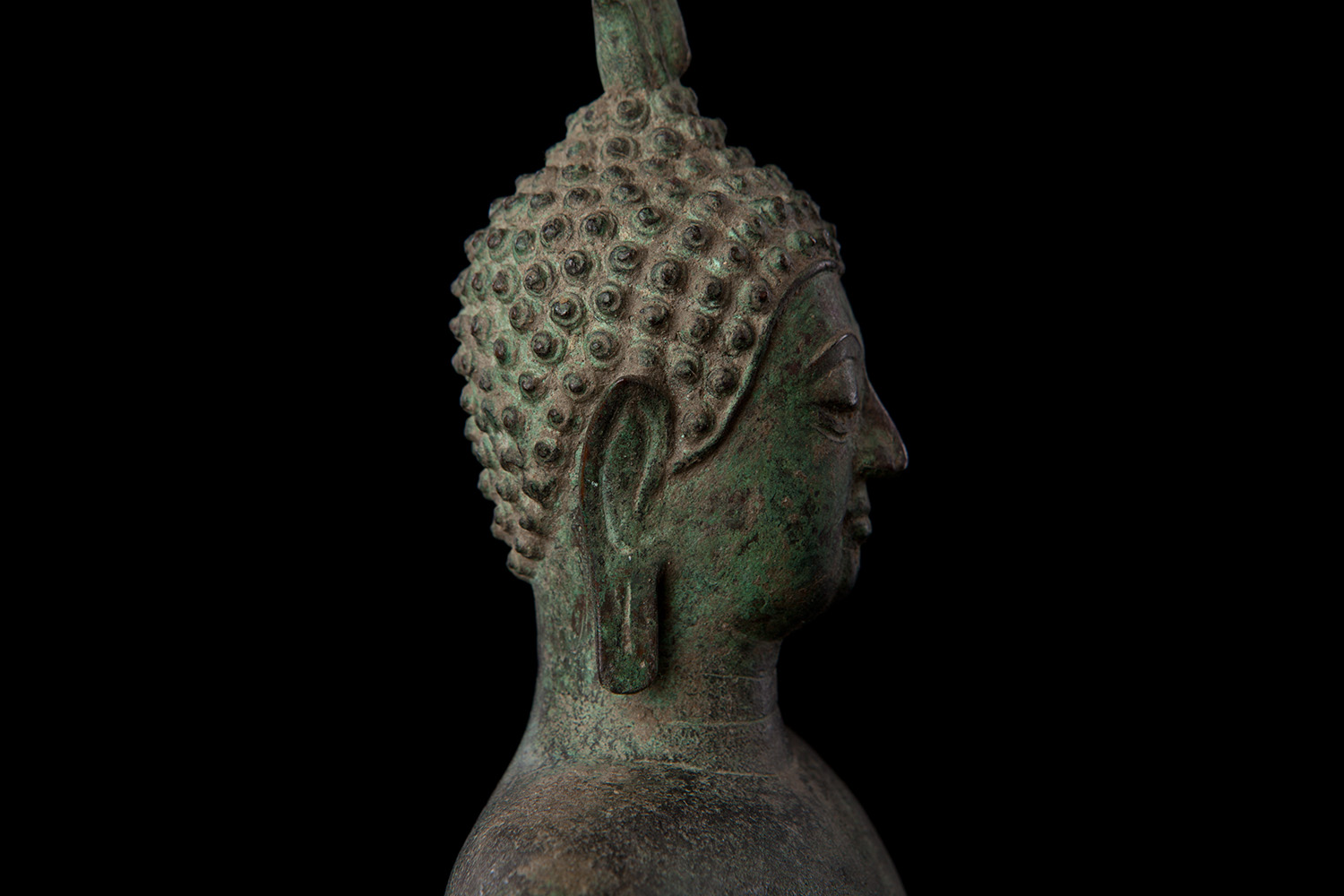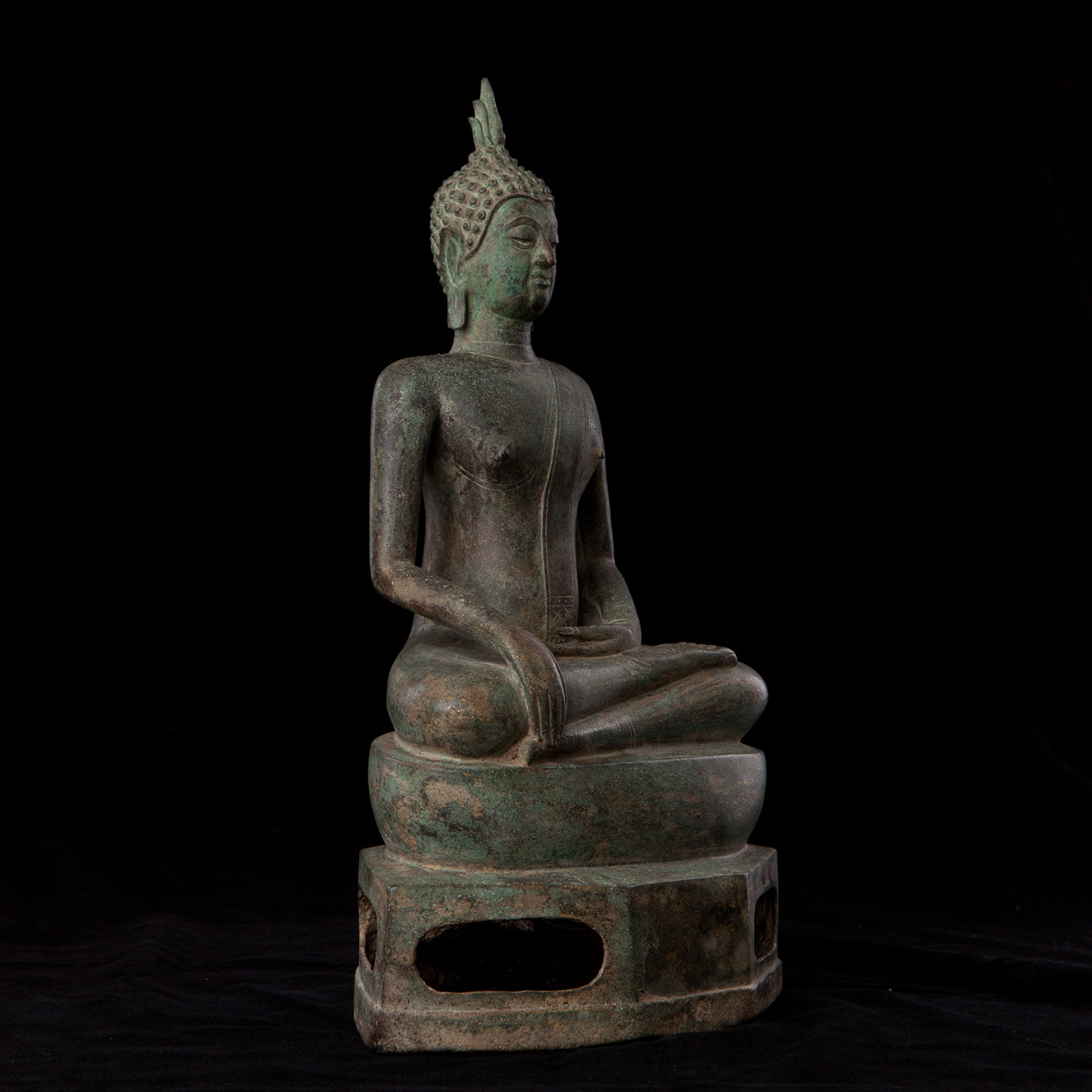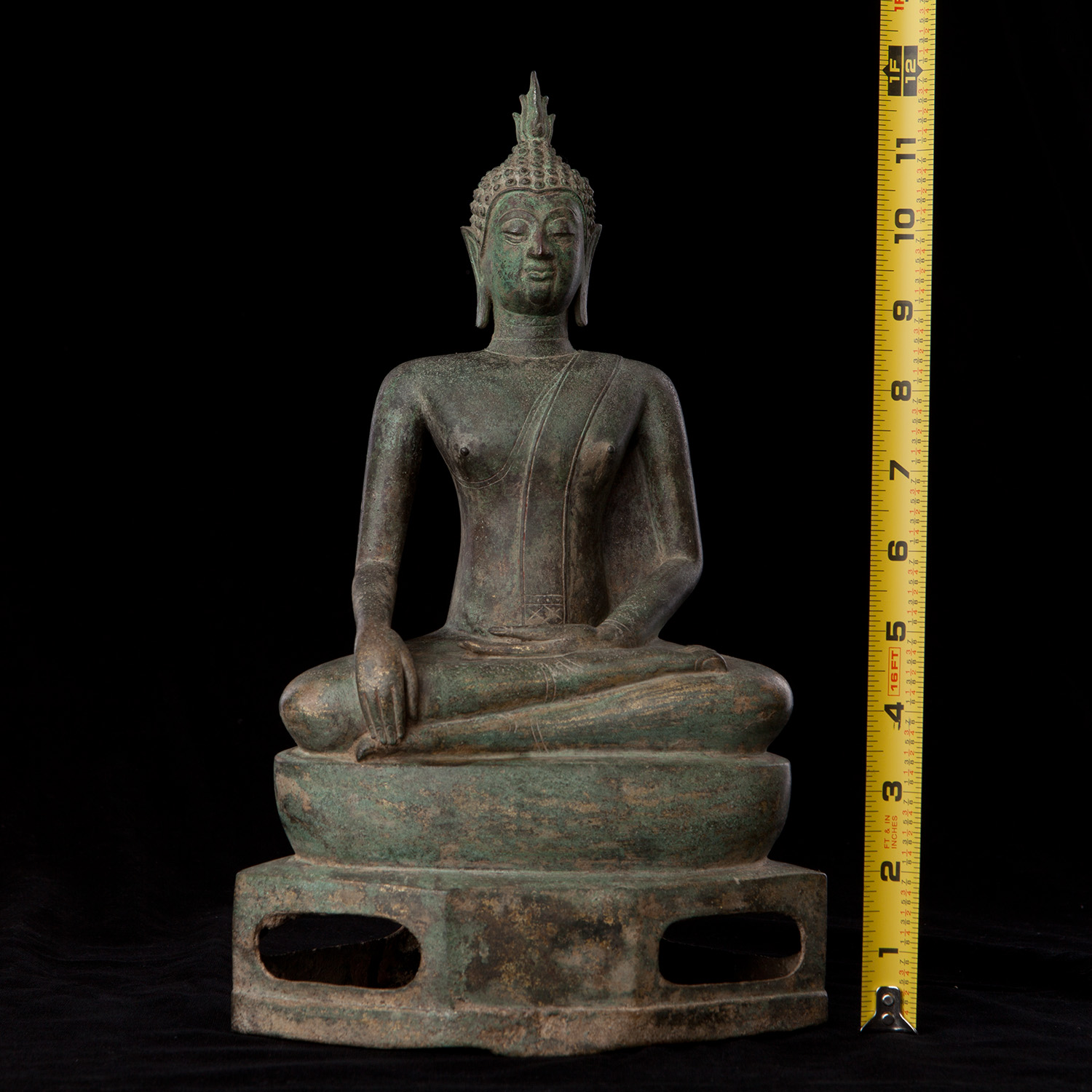 Classic Northrn 16thC Thai Buddha with great face and original patina. This piece is a good size at 12 inches tall with its intergrated base. Nice to find such a nice example in such untouched condition with such a good overall surface, that also has such a sweet face.
