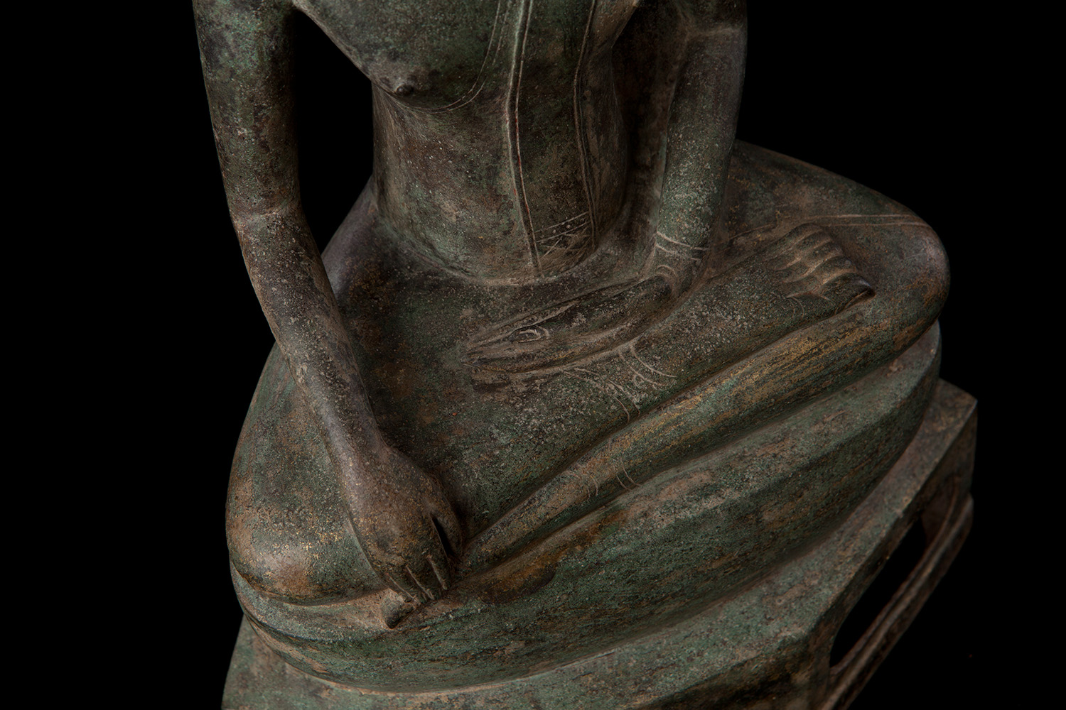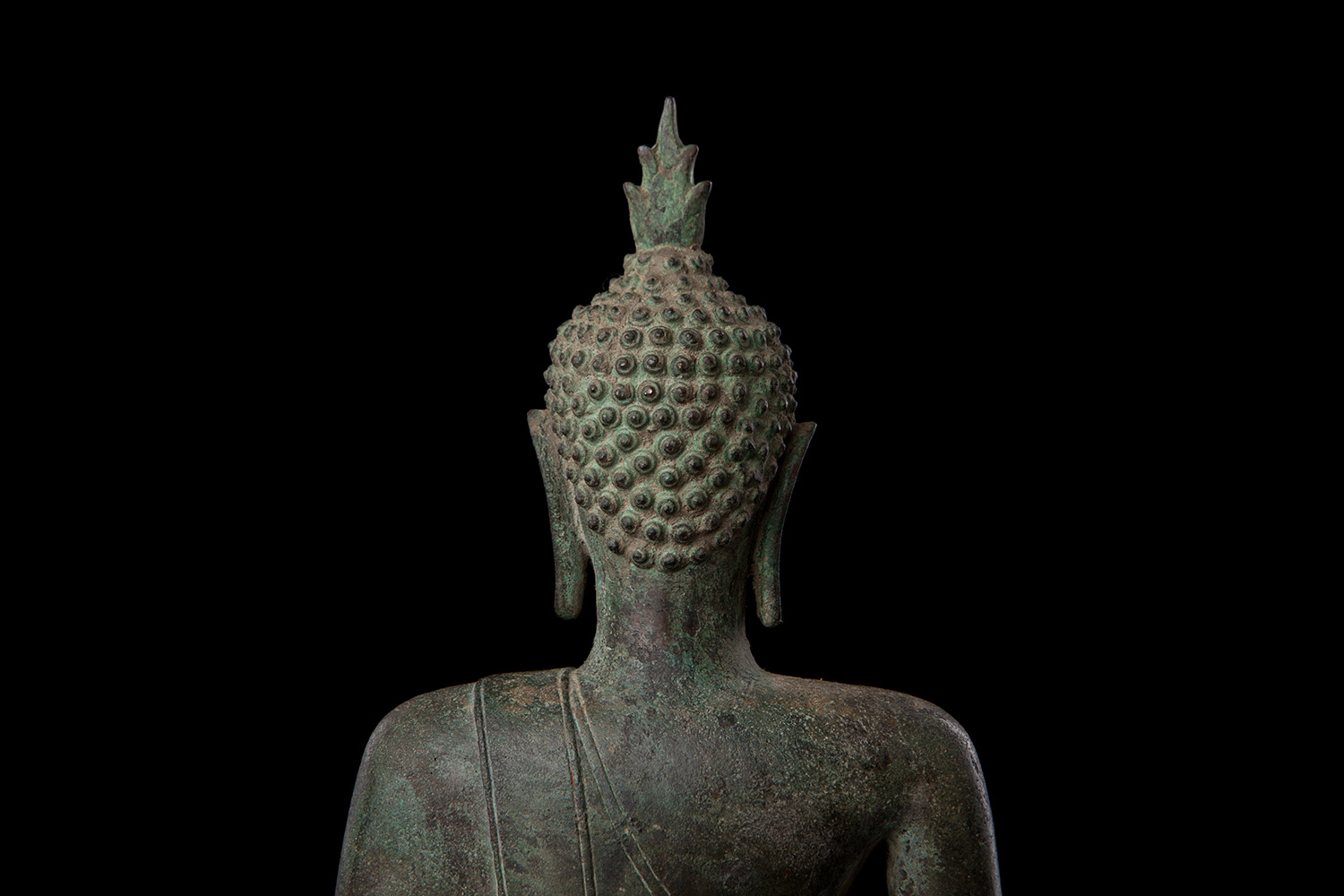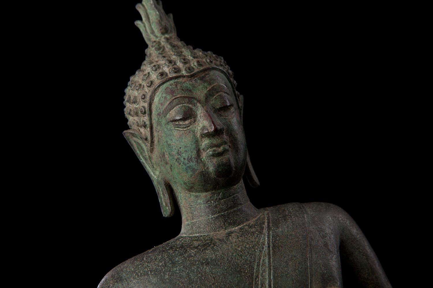 Classic Northrn 16thC Thai Buddha with great face and original patina. This piece is a good size at 12 inches tall with its intergrated base. Nice to find such a nice example in such untouched condition with such a good overall surface, that also has such a sweet face.