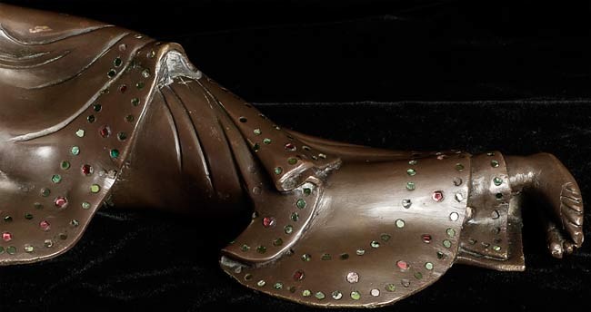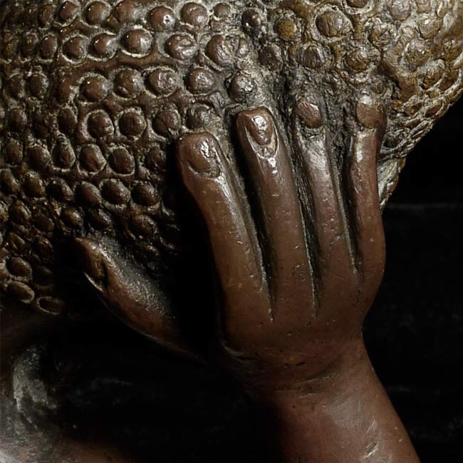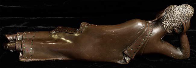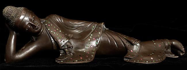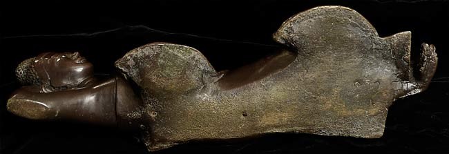 Delightful Solid Cast 19thC Burmese Mandalay Buddha. 11.5" from elbow to toe. 4 1/8" at deepest point3.75" tall. Missing (separately cast) left hand. Largest of this type I have ever seen. Has a flat black wood base not shown in the photos.