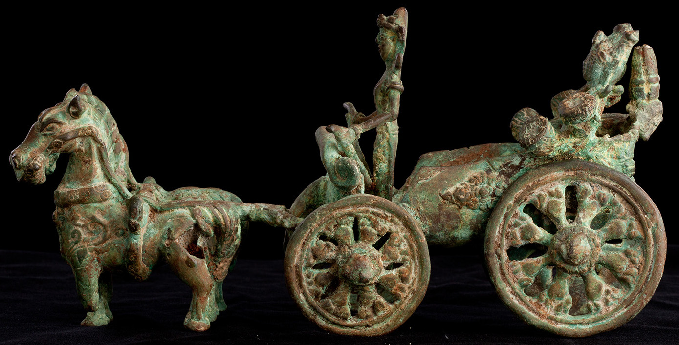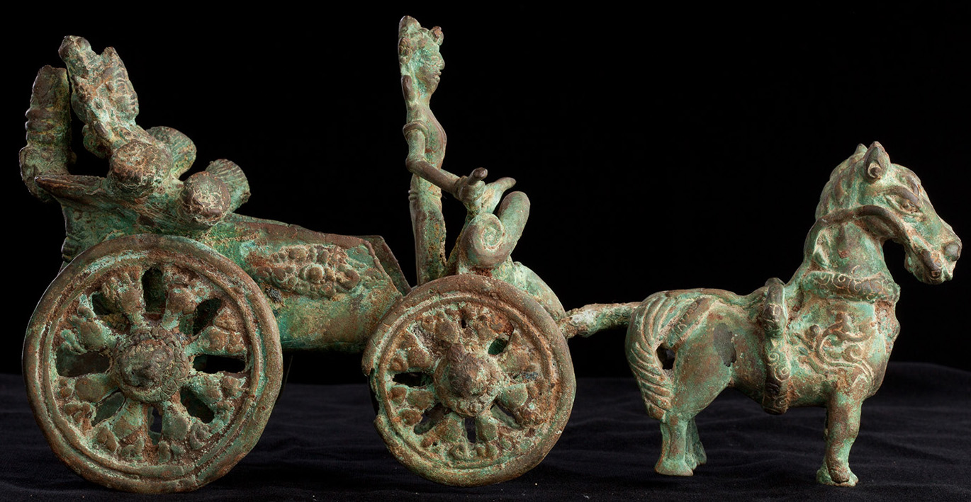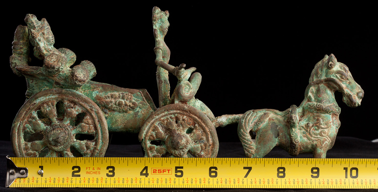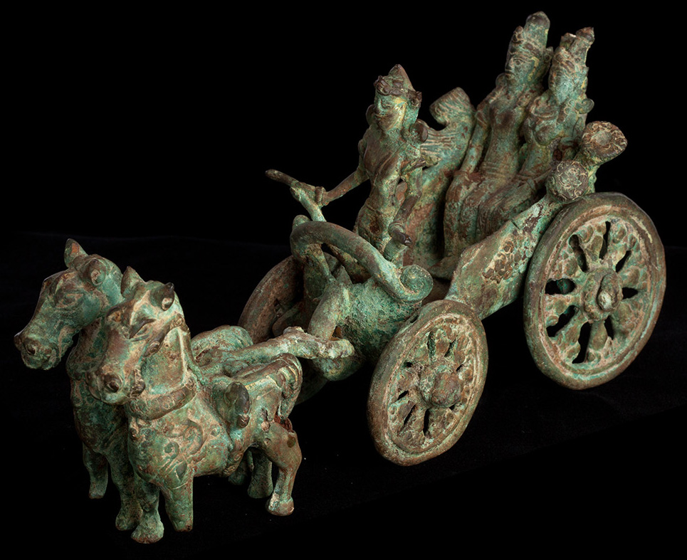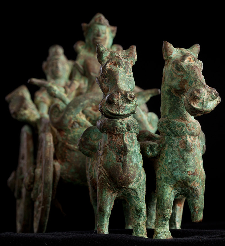 Rare 14/15thC Indonesian Hindu Bronze Group in Chariot Led By Horses. Loss to 2 horse feet. It is a very uncommon item. Many parts. Total length is approximately 11", width at widest point is 3.75", tallest point is 5.75. Very rare item, though I have seen other similar variations