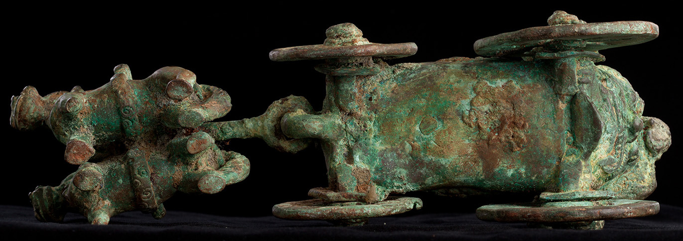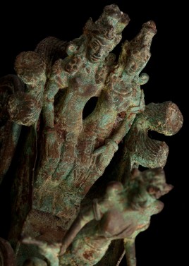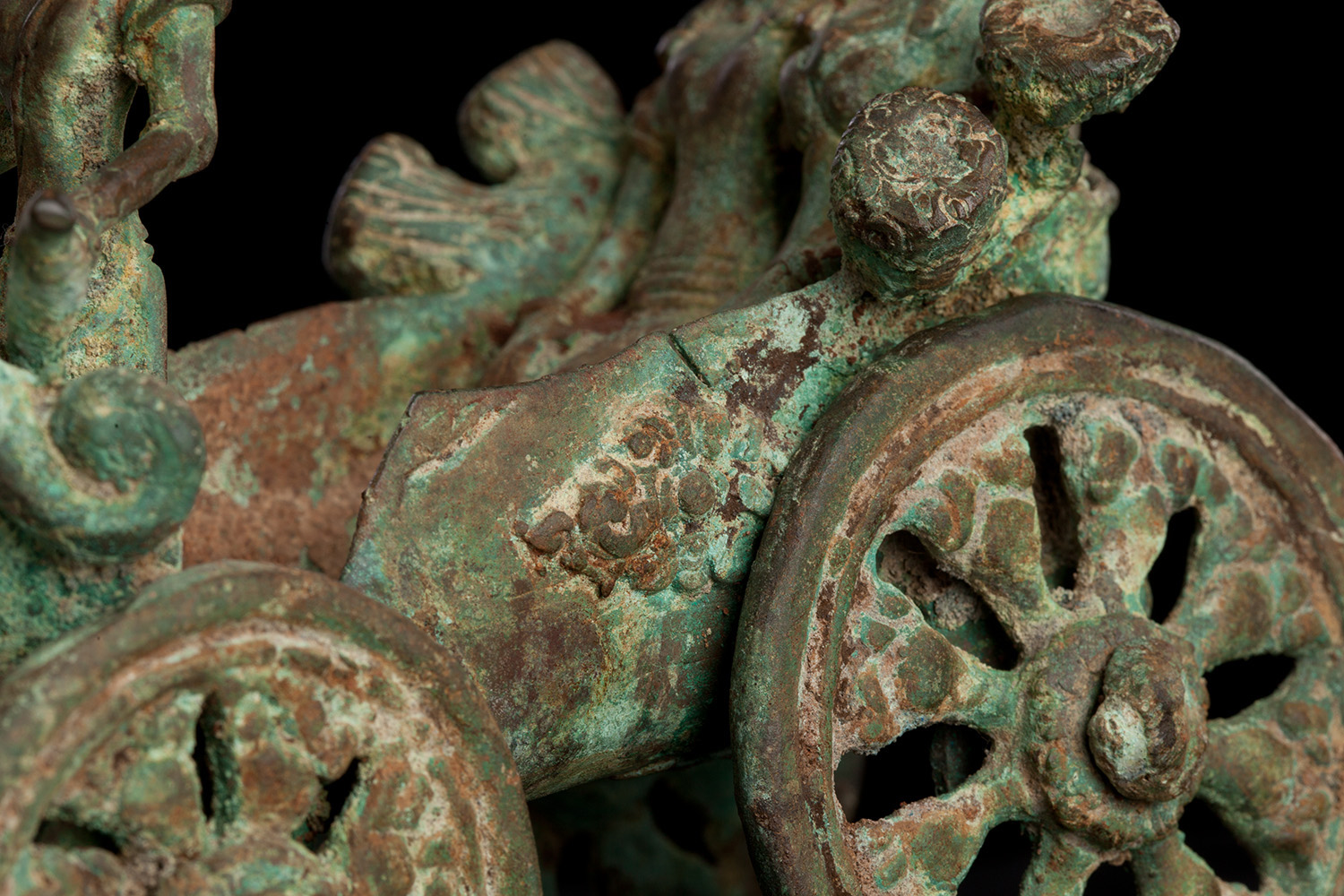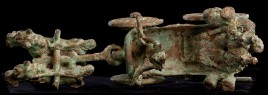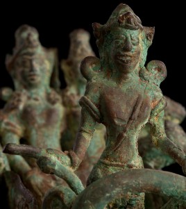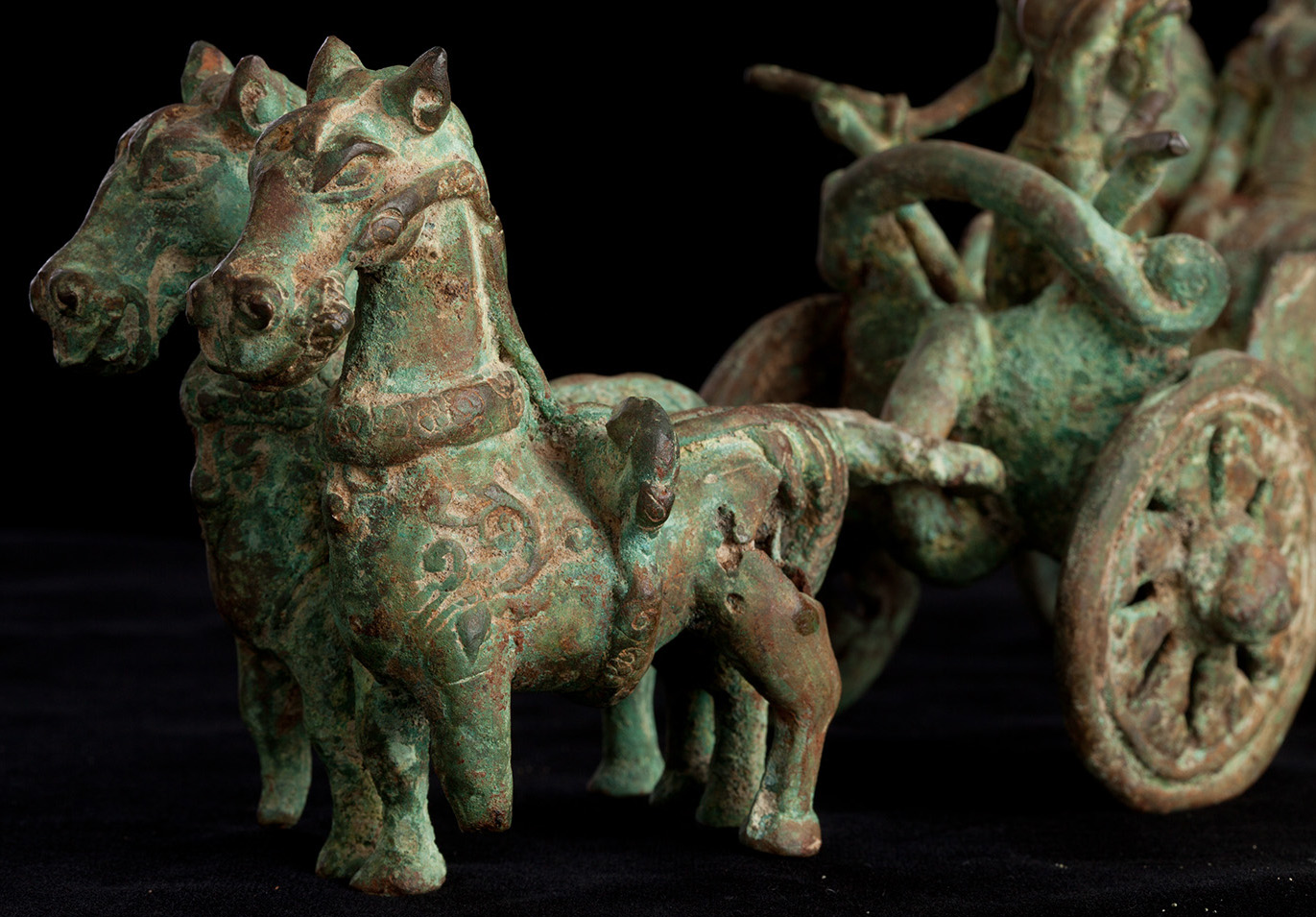 Rare 14/15thC Indonesian Hindu Bronze Group in Chariot Led By Horses. Loss to 2 horse feet. It is a very uncommon item. Many parts. Total length is approximately 11", width at widest point is 3.75", tallest point is 5.75. Very rare item, though I have seen other similar variations