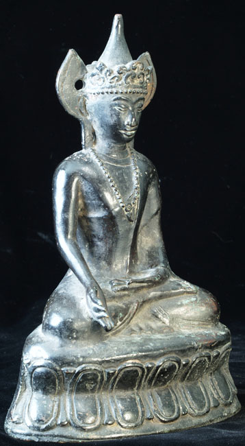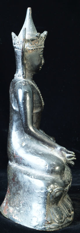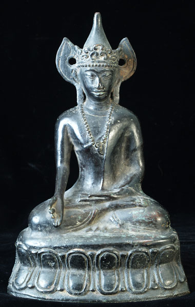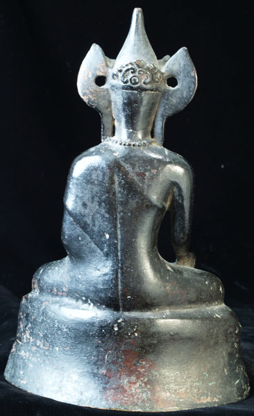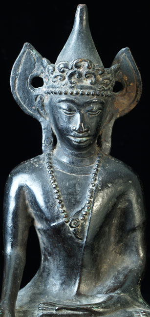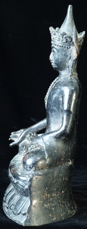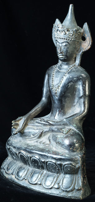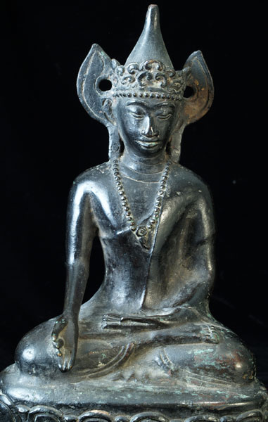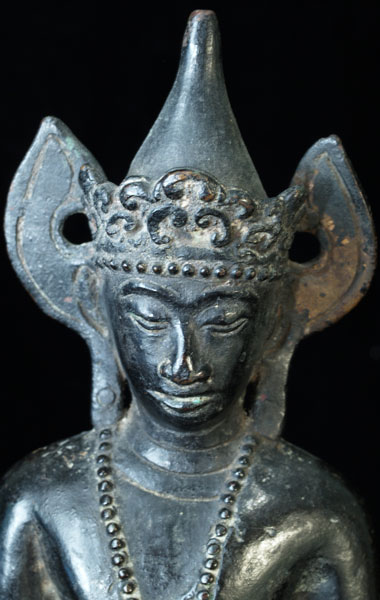 Very uncommon Mon style Buddha in Royal Attire. I’ve not seen another like this one before. 16-17th century-possibly earlier. Covered with thin black lacquer. Outstanding condition. Never seen another quite like it. Classic Mon face- extremely rare headdress. Sits 9 inches tall.
