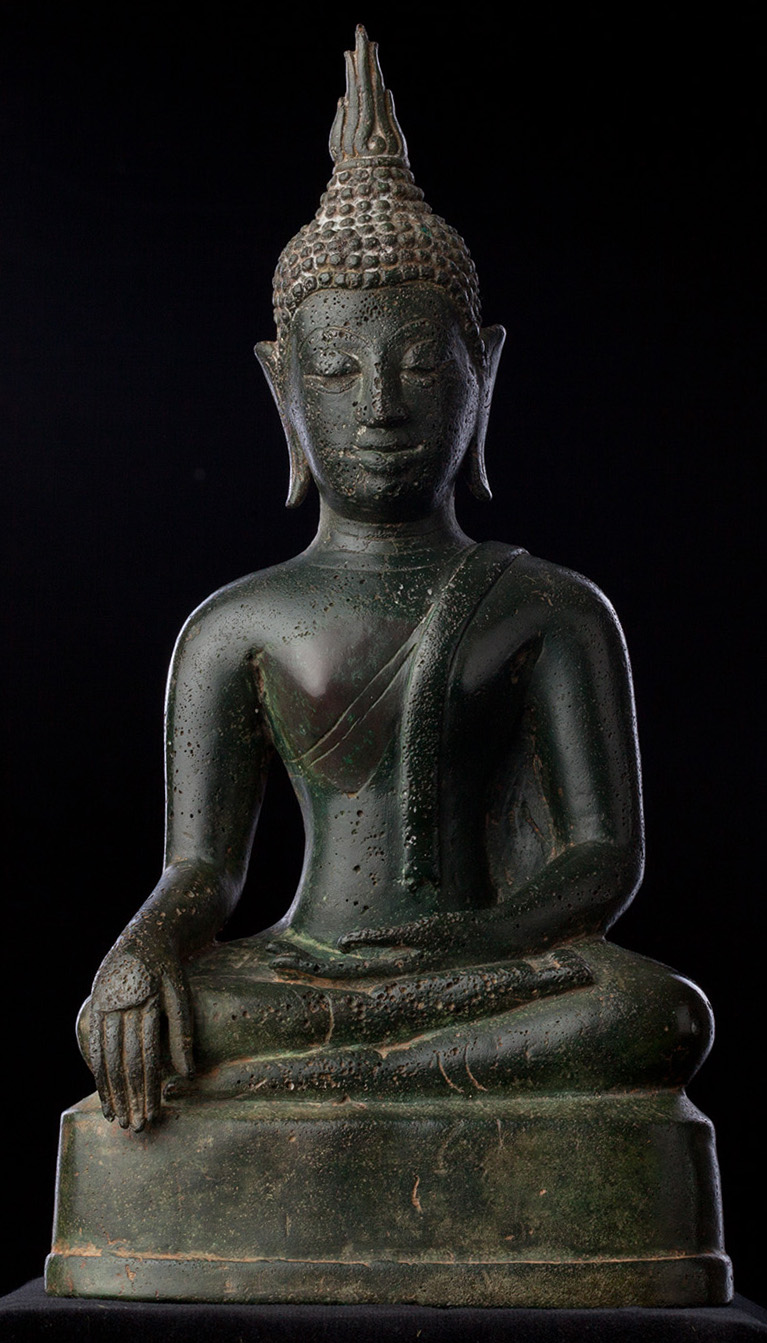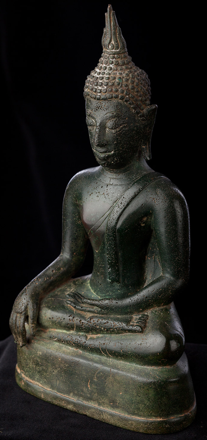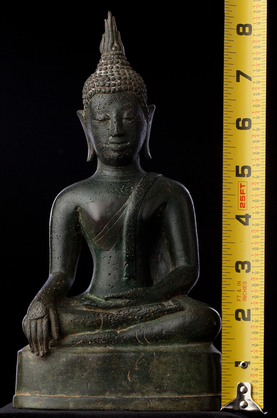 Good 16thC Thai Bronze Buddha. This piece measures 8-3/8 inches tall. Special "jade patina-one of the most prized surfaces of all the minerals leech out and create an almost stone-like green surface-takes hundreds north of years to create, only occurs with quality Thai Buddhas, is beautiful, cannot be faked as it grows out of the metal.