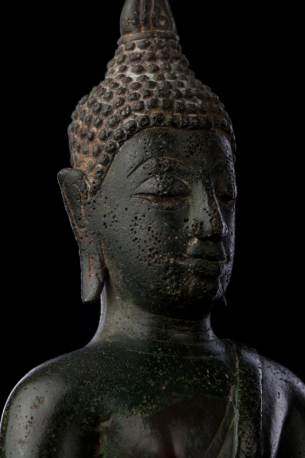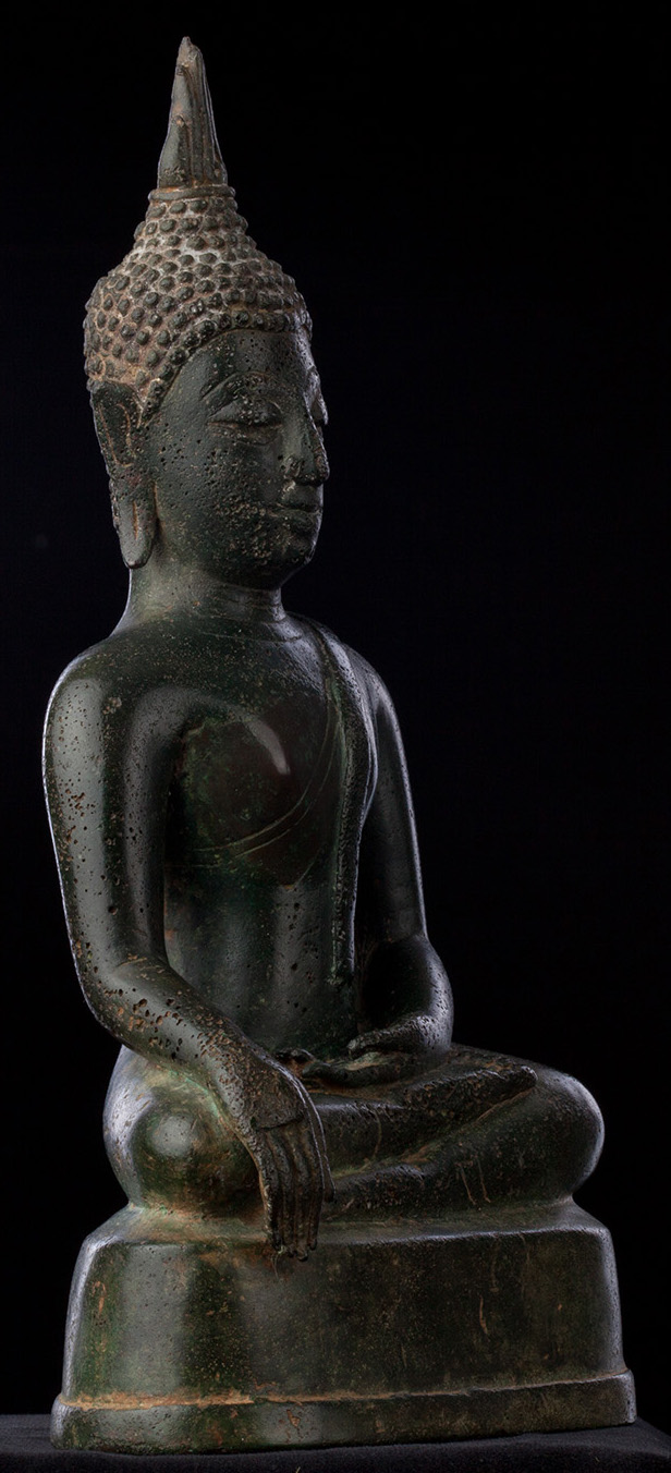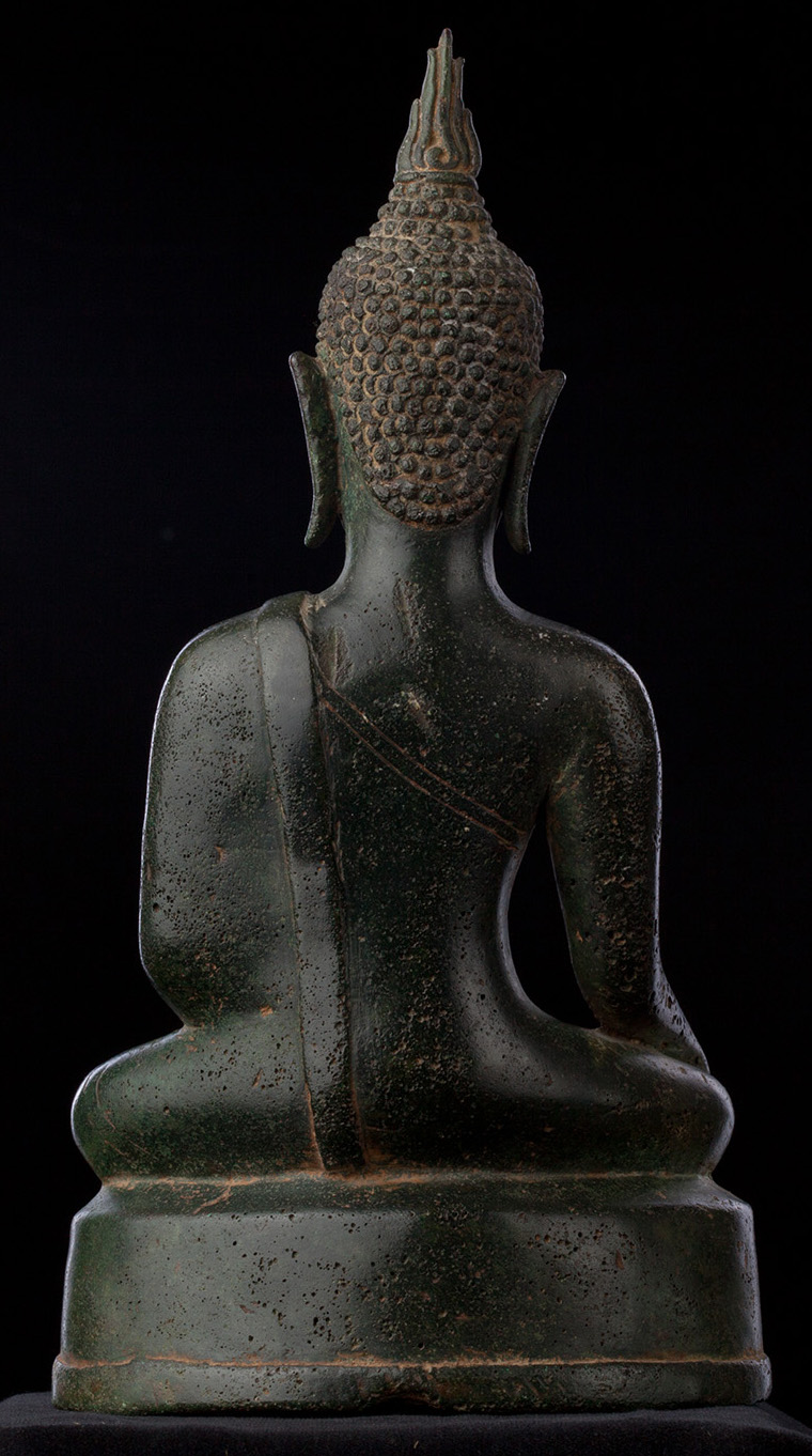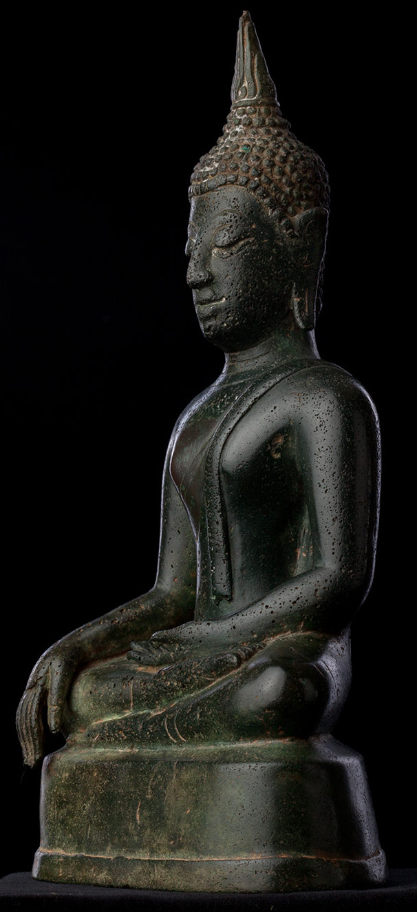 Good 16thC Thai Bronze Buddha. This piece measures 8-3/8 inches tall. Special "jade patina-one of the most prized surfaces of all the minerals leech out and create an almost stone-like green surface-takes hundreds north of years to create, only occurs with quality Thai Buddhas, is beautiful, cannot be faked as it grows out of the metal.