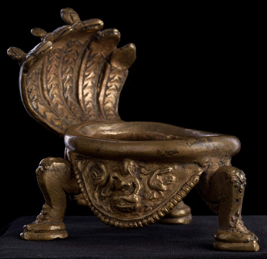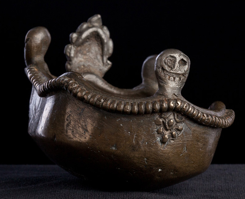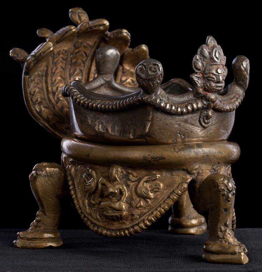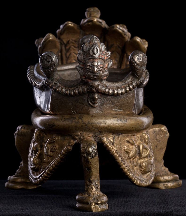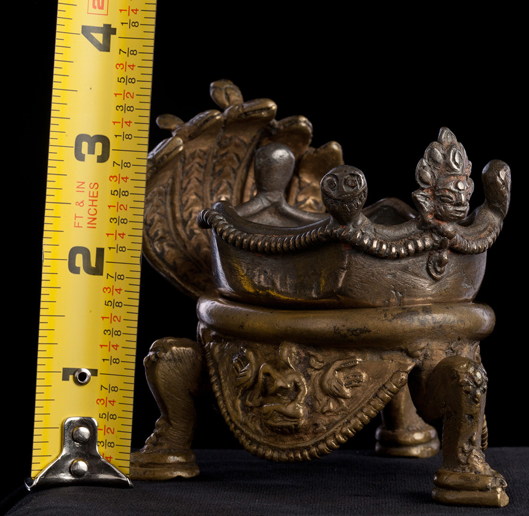 This unique near miniature bronze skull cup in a unique stand qith antrhropomorphic legs and a Naga hood-piece measures 4-5/8 inches tall at its highest point. Looks to be at least 19thC and to be Tibetan or Nepalese. Never seen another like it.