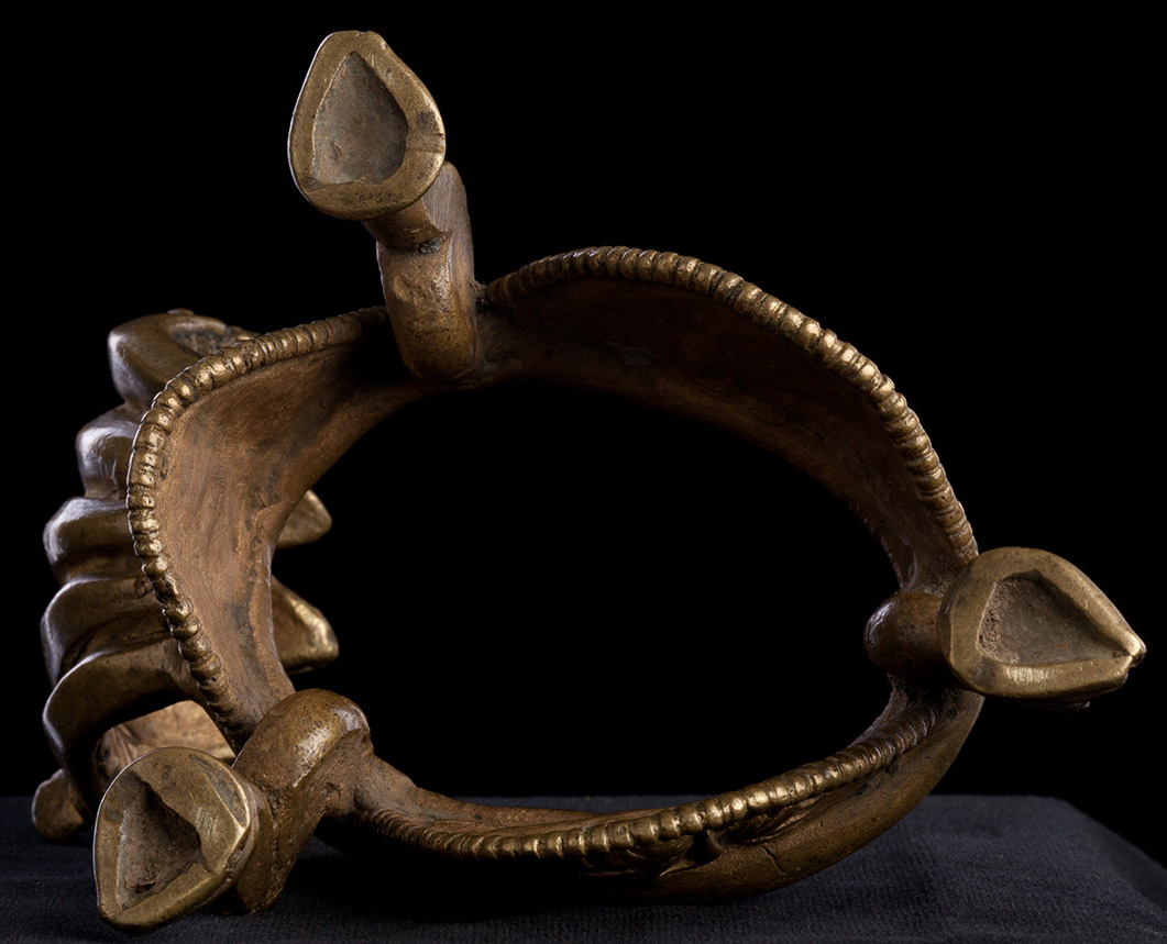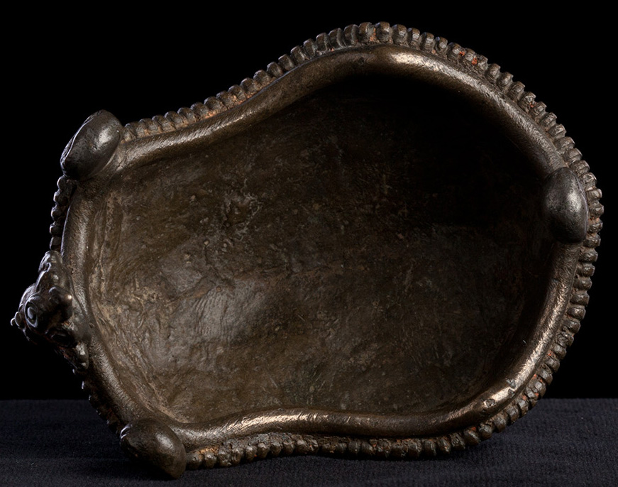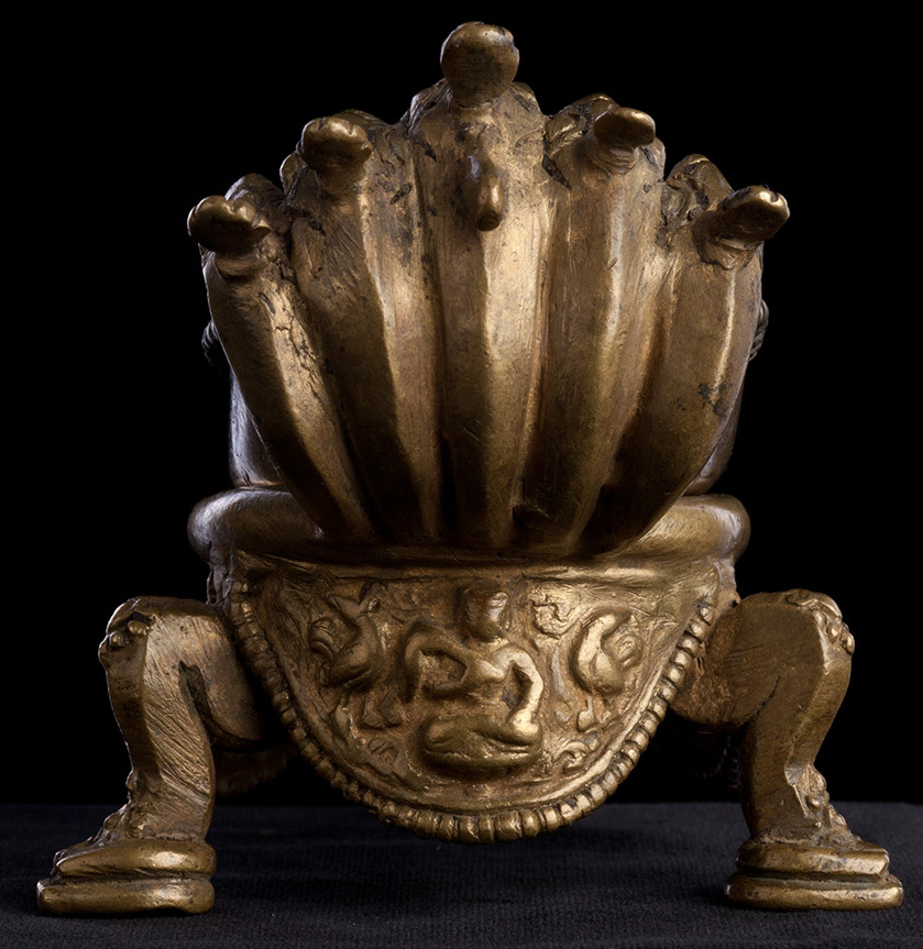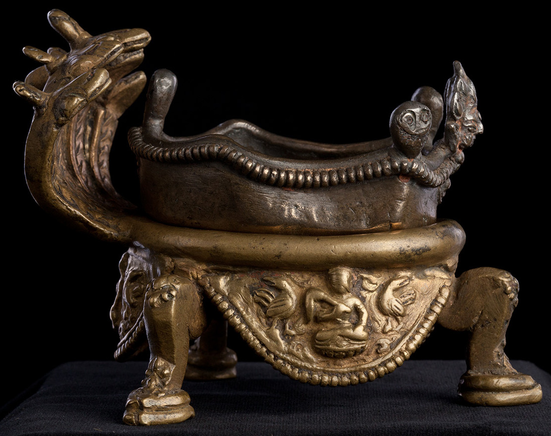 This unique near miniature bronze skull cup in a unique stand qith antrhropomorphic legs and a Naga hood-piece measures 4-5/8 inches tall at its highest point. Looks to be at least 19thC and to be Tibetan or Nepalese. Never seen another like it.