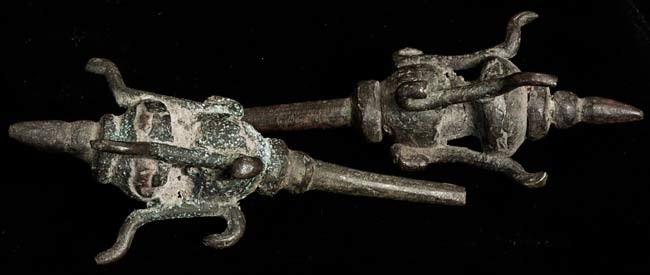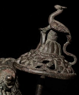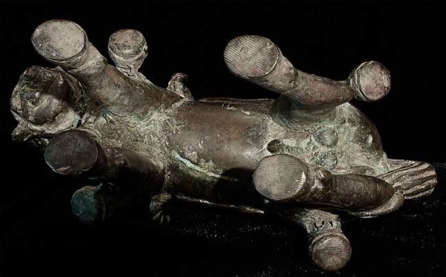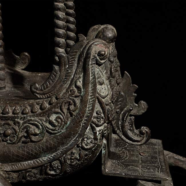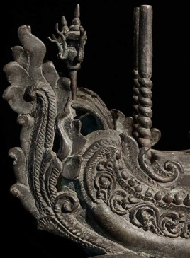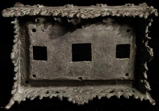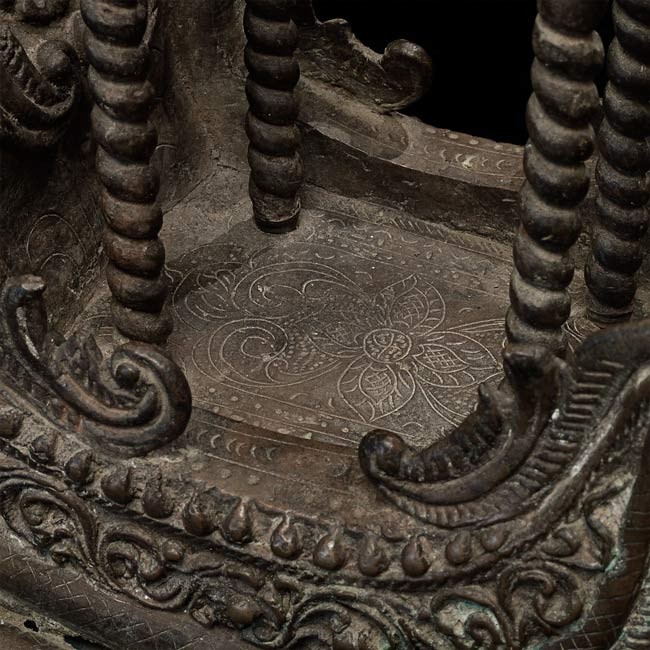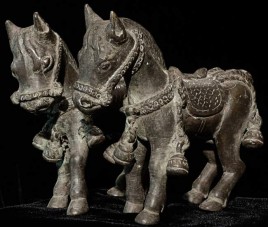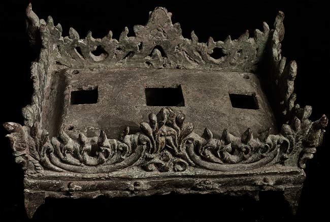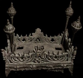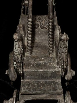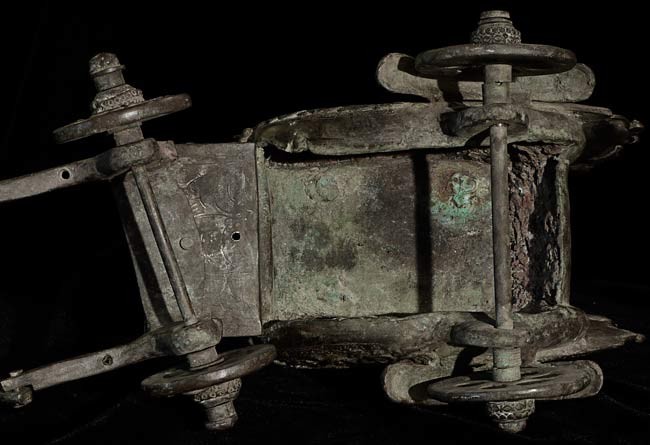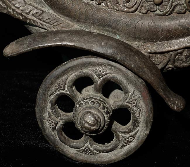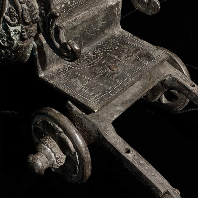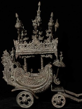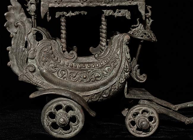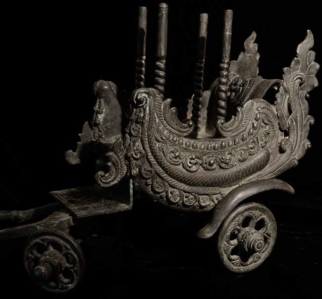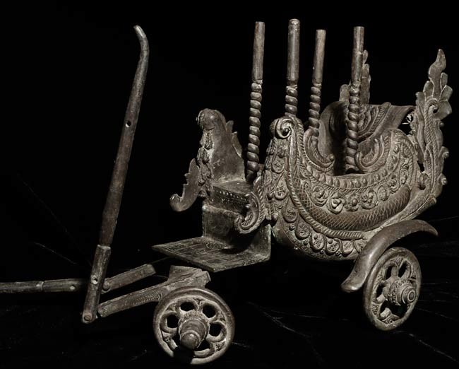 It is an Indonesian or Javanese cart, likely Majapahit (14/15thC). I will not guarantee the period as this is not my area of expertise. While there are minor losses, which are hard to see, ALL original parts are still together. Extremely heavy. The height of the carriage to the top of the canopy is 12", the width (wheel to wheel) is 6.5", and the length to the front of the footrest is 10.5. The length from the front of the footrest to the end of the side shafts is 11.25". Starting bid lowered dramatically..