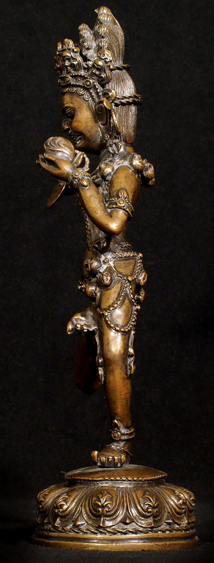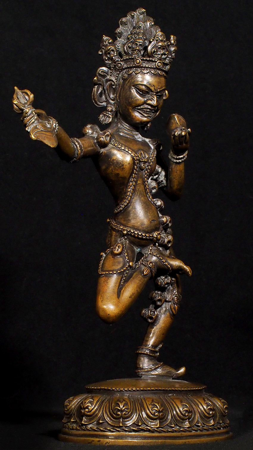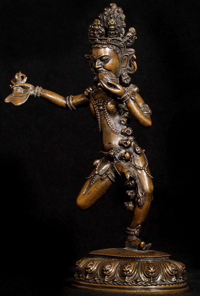 Unusual Himalayan fierce deity holding ritual chopper and skull cup.Twentieth century, though sculpted and finished to a very high standard. Extremely lively and animated, both in expressiveness and in posture. Not seen one like this before. Measures 11.5 inches x 6.5 inches (at the arm) x 3.5 inches. The base (integrated) measures 5 inches x 3.5 inches x 1.5 inches.