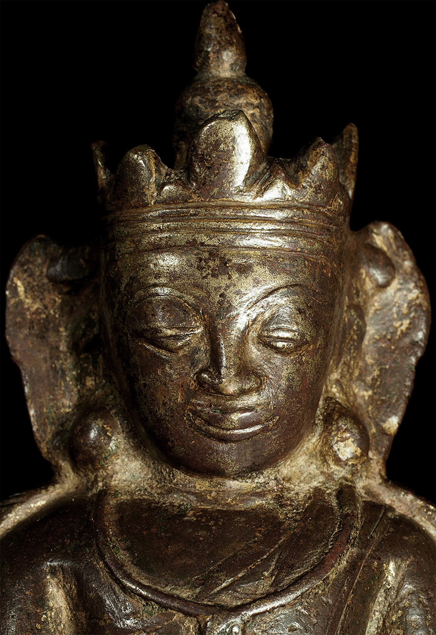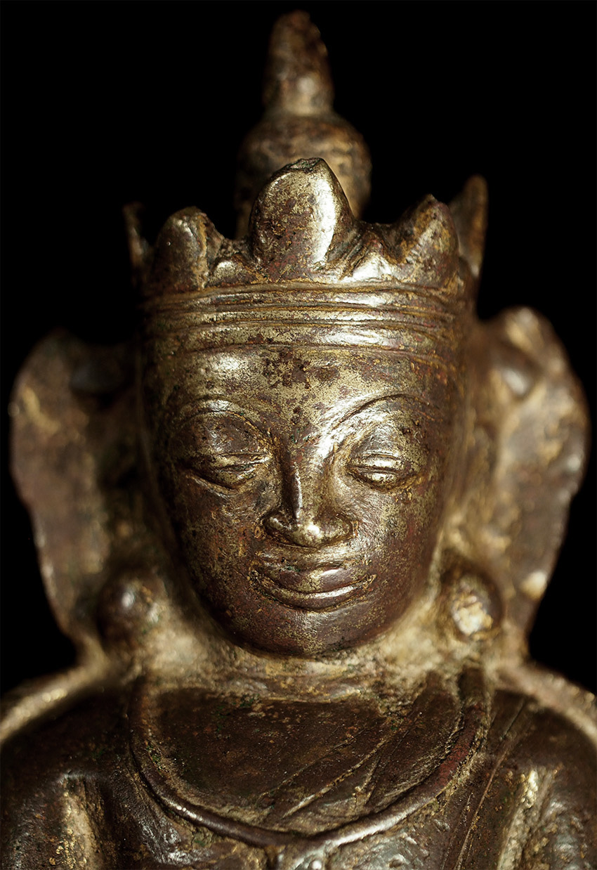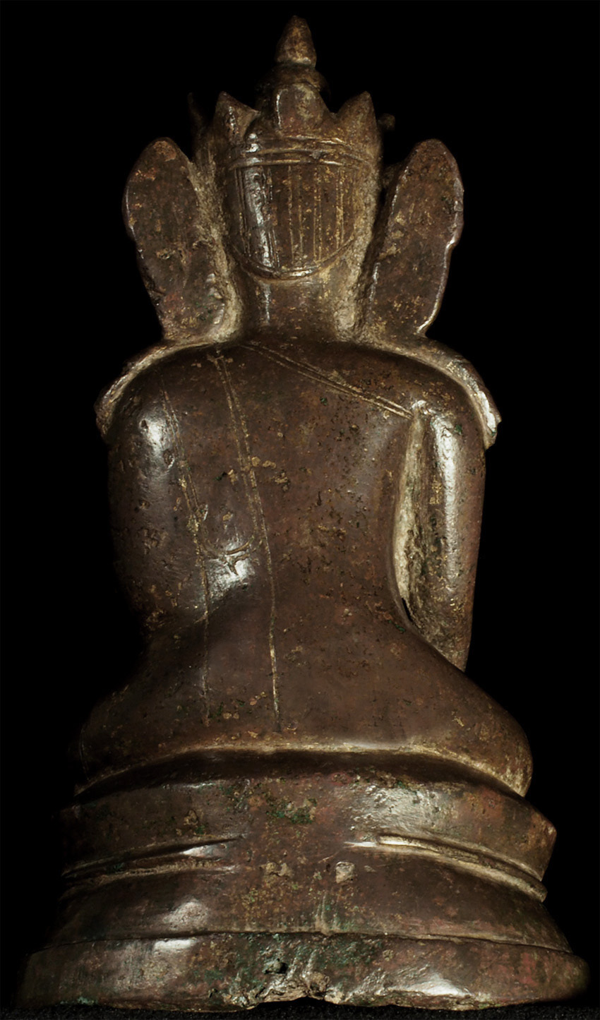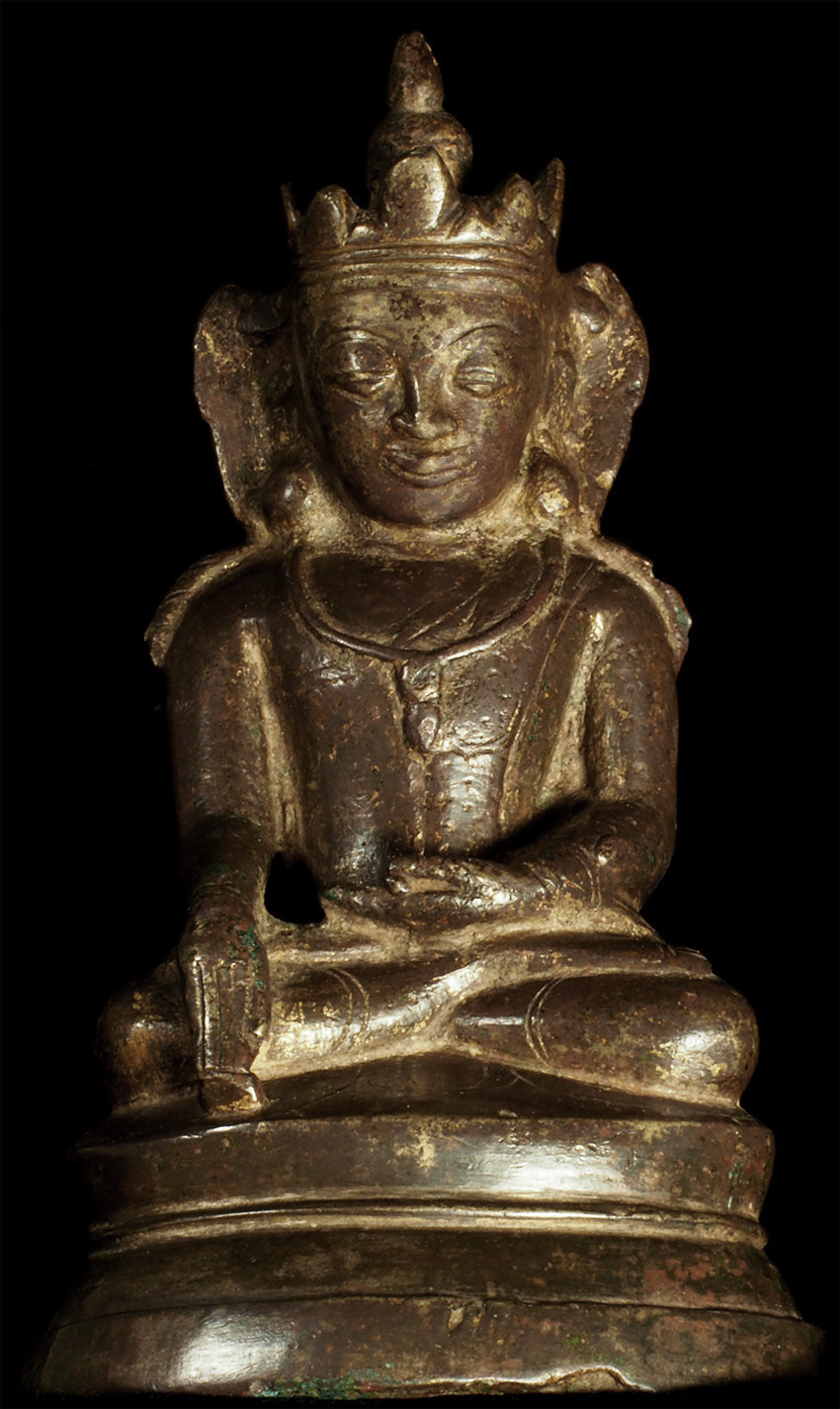 15thC Burmese Crowned Buddha. Crowned Ava type. Rare to find so beautiful and complete in bronze in this small size. Has influence from Ming type, of which it is contemporary. Very hard to find this type as nice as this in the marketplace anymore--most are fakes. This is an estate piece that was bought 40 years ago when they were still coming out of Burma. A real treasure. Measures 6.5 inches x 3.75 inches x 3 inches.