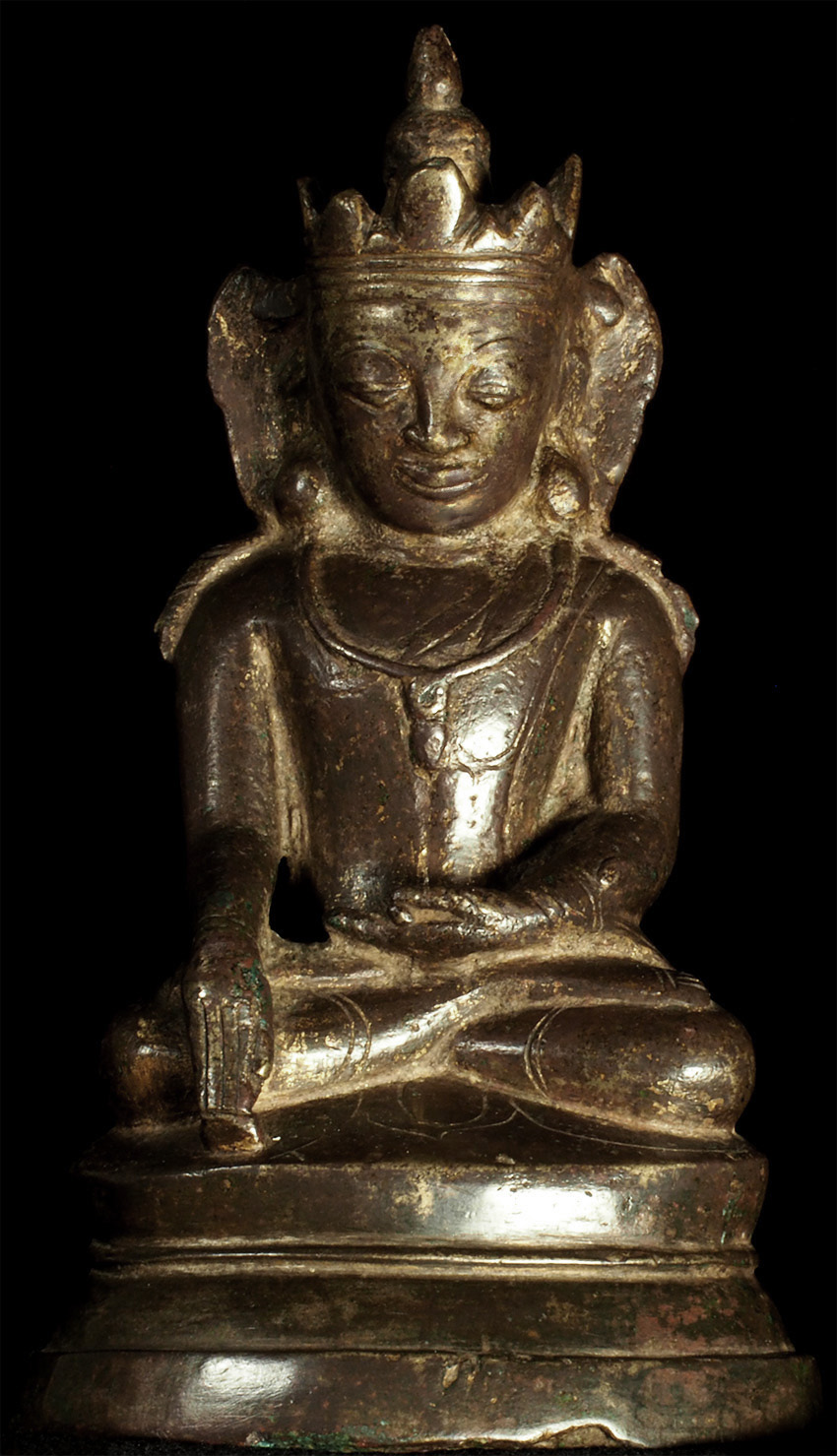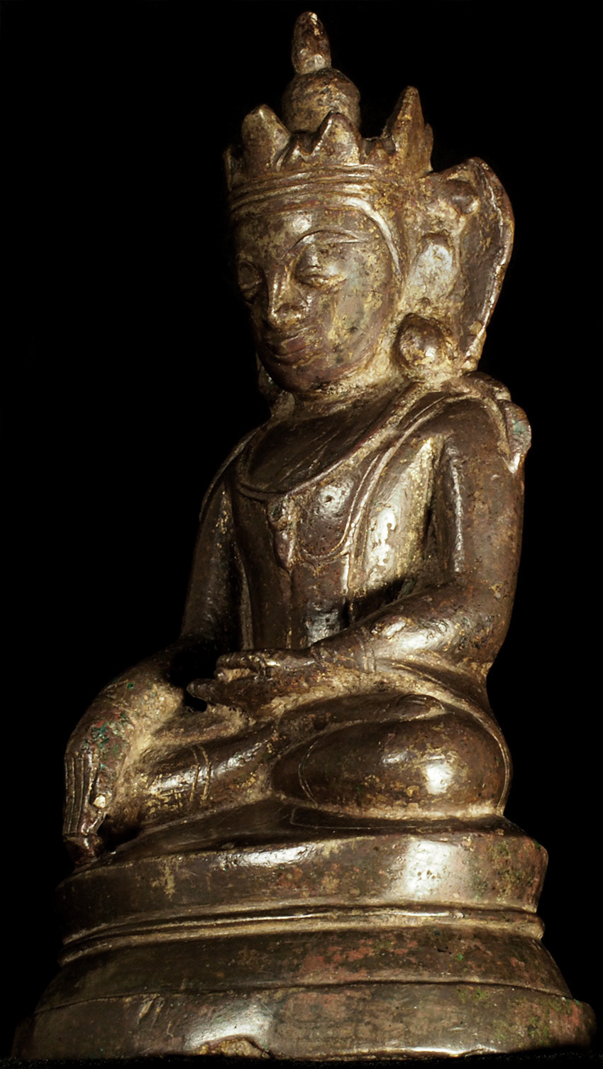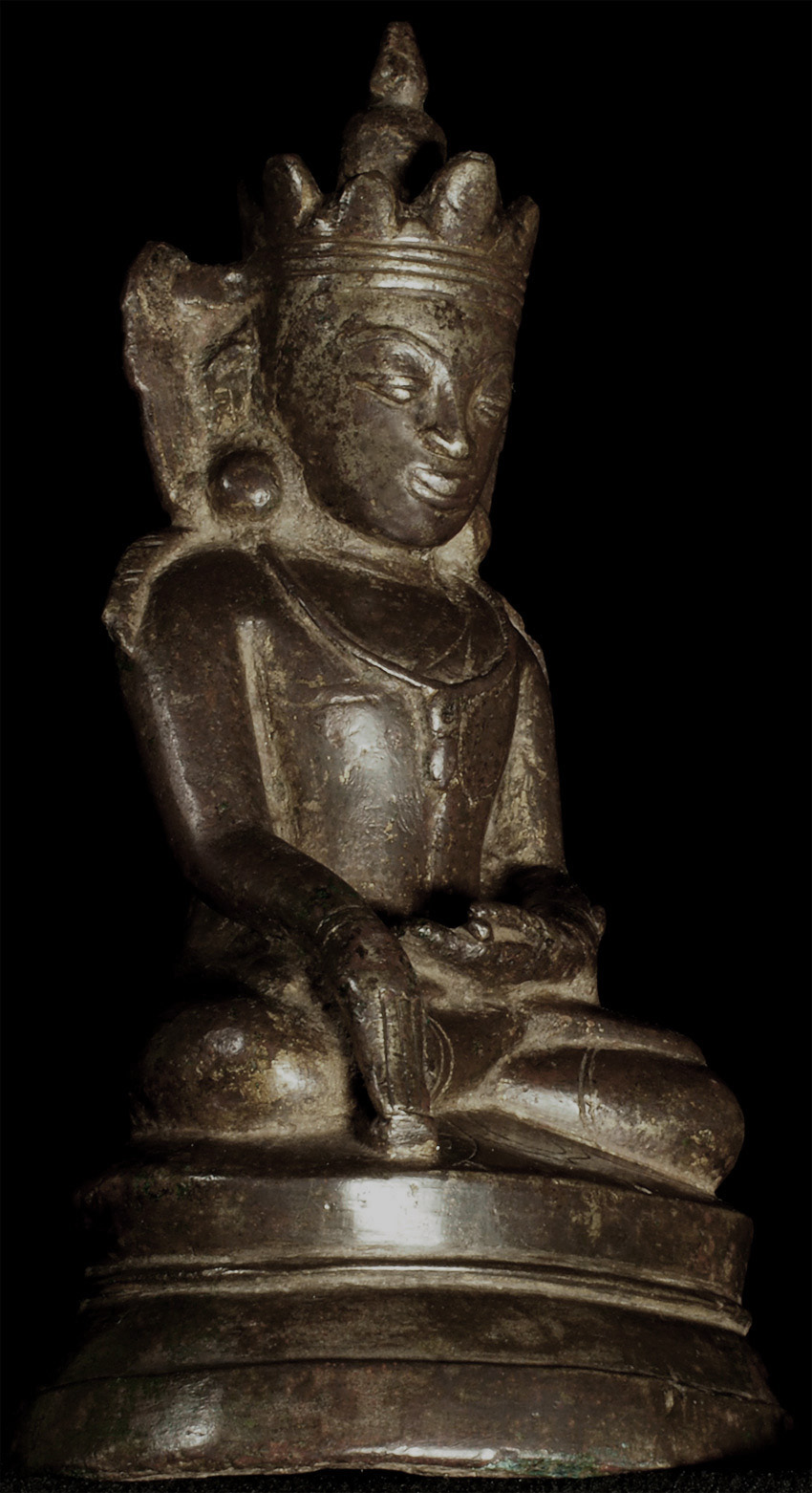 15thC Burmese Crowned Buddha. Crowned Ava type. Rare to find so beautiful and complete in bronze in this small size. Has influence from Ming type, of which it is contemporary. Very hard to find this type as nice as this in the marketplace anymore--most are fakes. This is an estate piece that was bought 40 years ago when they were still coming out of Burma. A real treasure. Measures 6.5 inches x 3.75 inches x 3 inches.