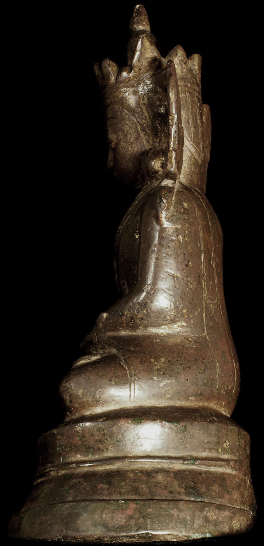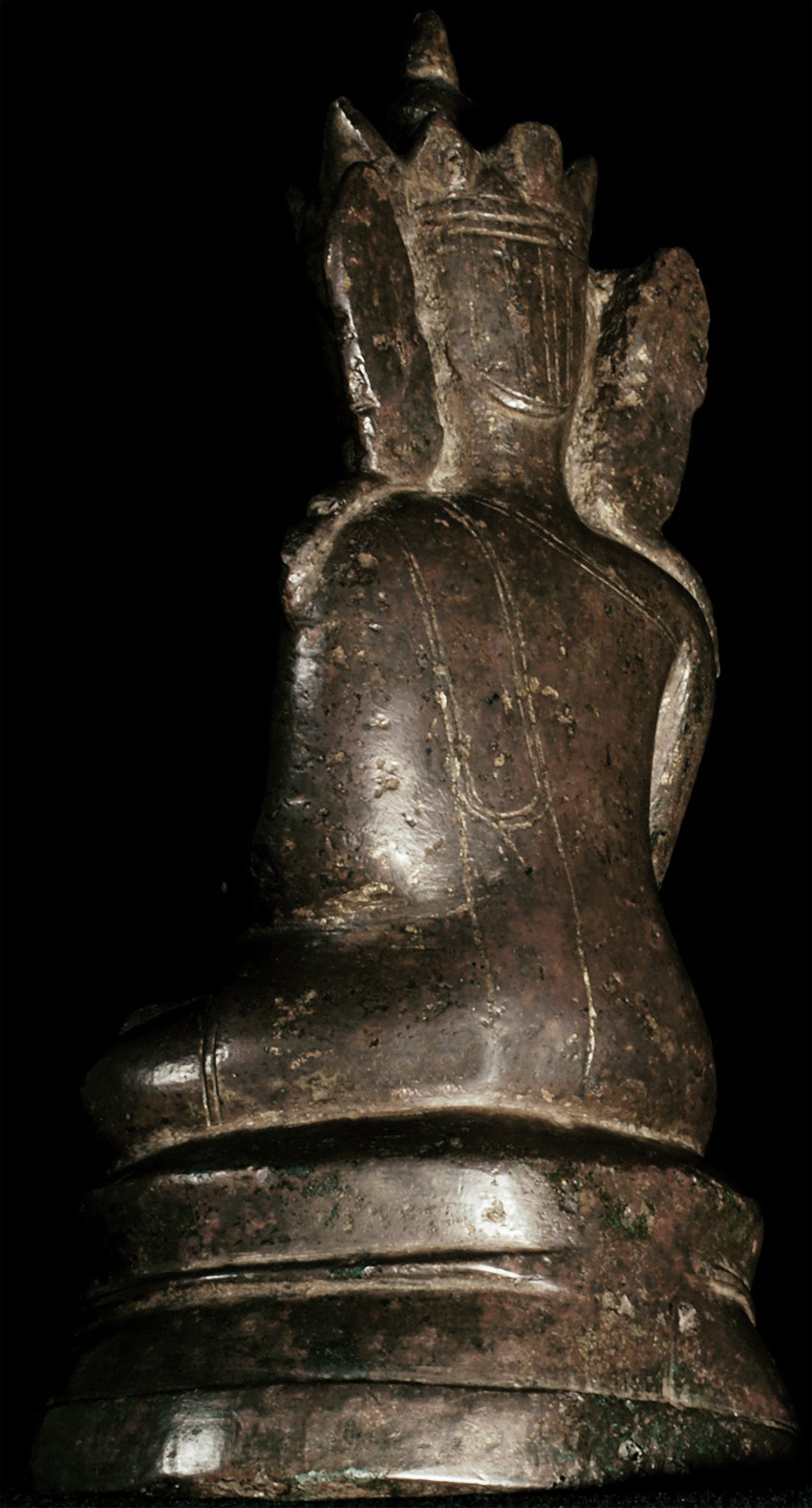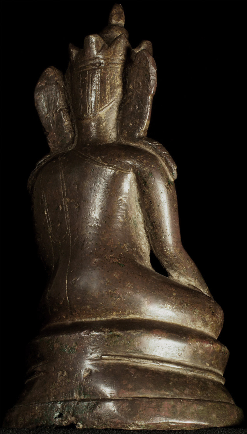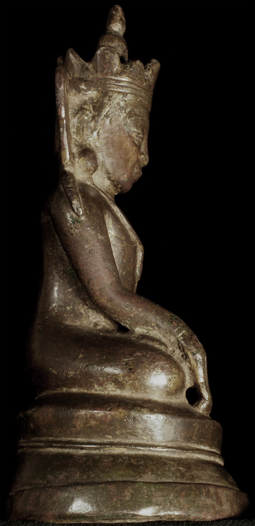 15thC Burmese Crowned Buddha. Crowned Ava type. Rare to find so beautiful and complete in bronze in this small size. Has influence from Ming type, of which it is contemporary. Very hard to find this type as nice as this in the marketplace anymore--most are fakes. This is an estate piece that was bought 40 years ago when they were still coming out of Burma. A real treasure. Measures 6.5 inches x 3.75 inches x 3 inches.