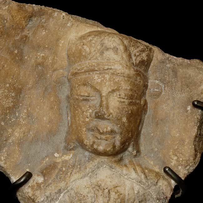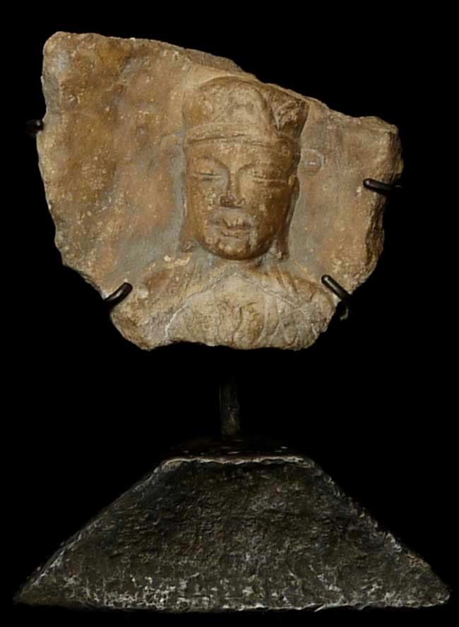 Beautiful Tang or earlier Chinese Buddha (5th/9thC). This is an authentic piece. Previous owner purchased it forty years ago from a WW11 veteran who brought it back from Asia in the 1940's. Mounted on a custom metal stand made by a well regarded sculptor who made bases for early art pieces custom designed to enhance their beauty. Beautiful example. It was looked at by the Asian Art Museum in San Francisco many years ago on members day, and the curator believed it was probably a period piece. Stands 9 1/4 inches tall at the highest point, custom base is 7 inches by 2 inches.