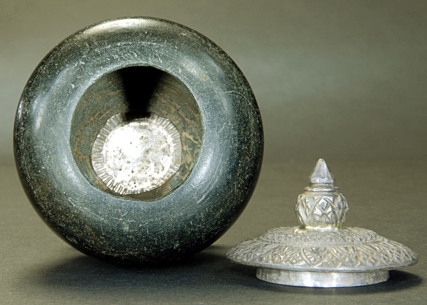 Fine 16/17thC Northern Thai (stone) Container. The silver is a modern replacement, as the original silver or gold was almost certainly melted down long ago during one of their conflicts with Burma. This same hard stone was used to make small, fine Buddha images, and this piece was likely for ritual use in a temple. Stands 3 3/4 Inches tall. I purchased them from a collector, from whom I mostly bought antique crystal, glass, stone Buddhas, and other antique crystal and stone pieces. Domestic shipping is included, and international shipping is $50, including packing and insurance to anywhere in the world.