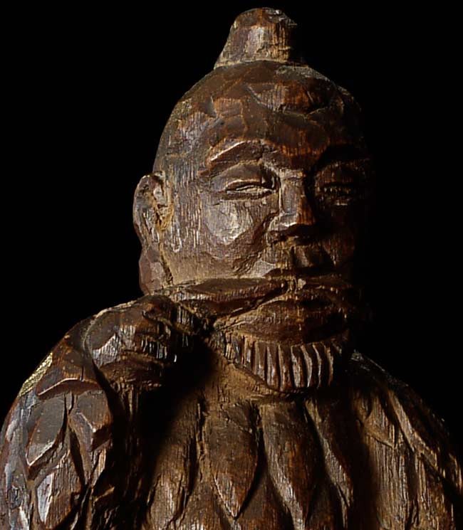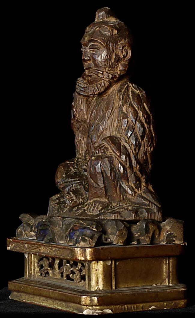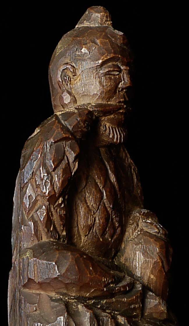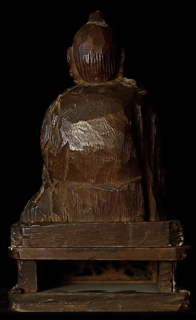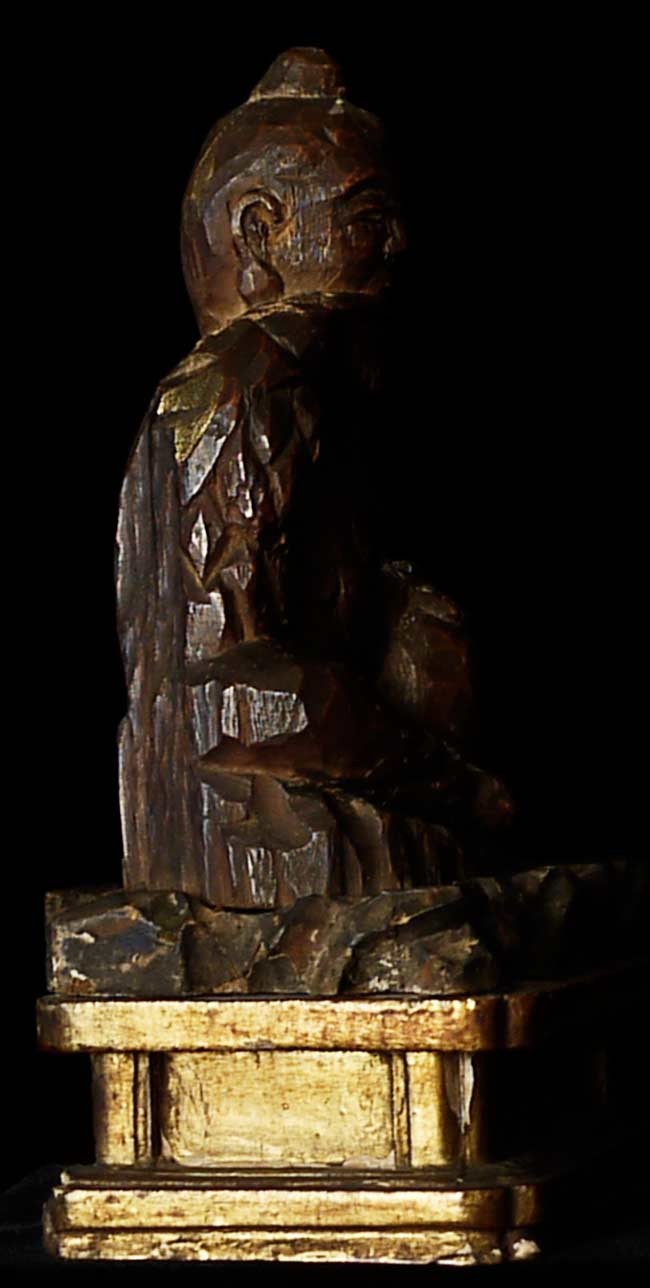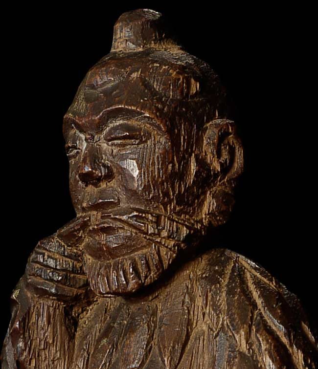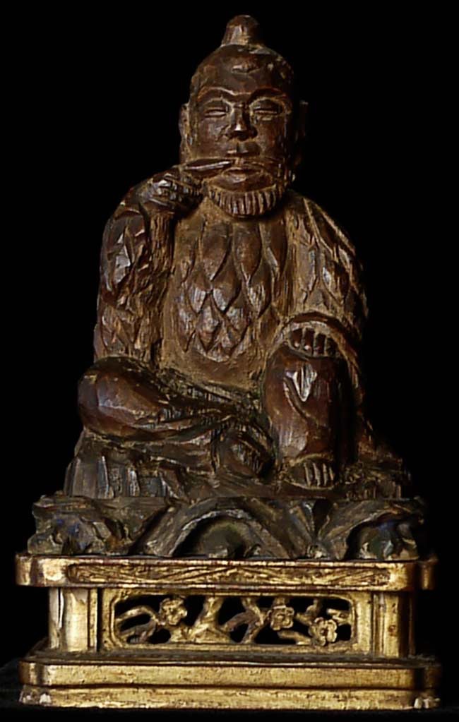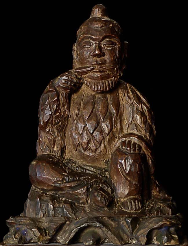 Old carved wood statue of Ebisu, one of the Shichifukujin, the Seven Lucky Gods of Japan. Very good condition. Ebisu is considered the God of Fishermen and Good Fortune, among, many other mystical attributes, and is still very popular throughout Japan., Approximately 7.25" tall, base is 4 3/8" x 3"