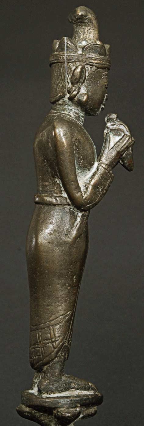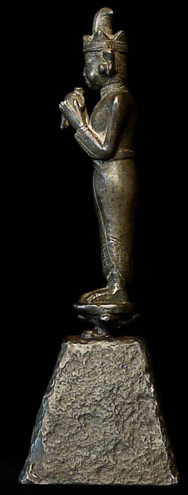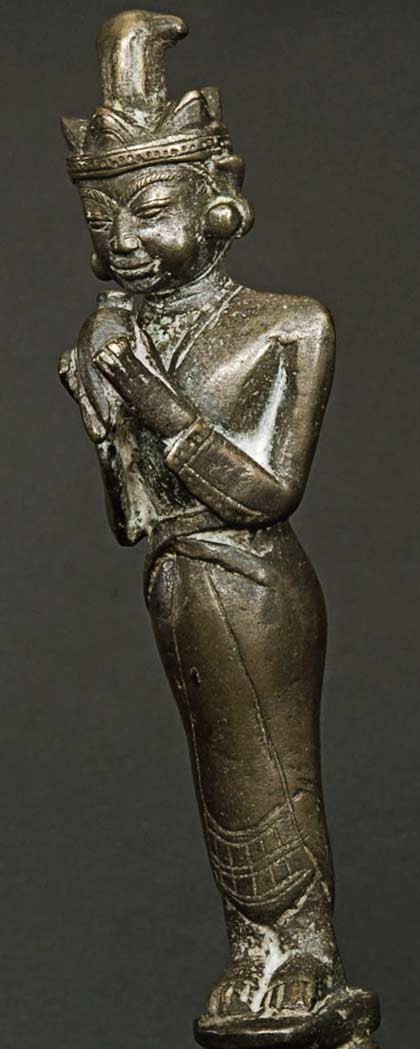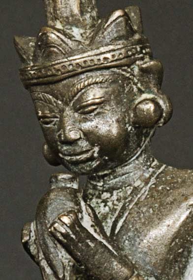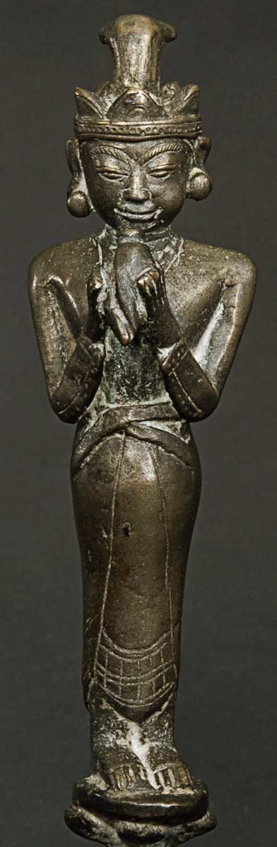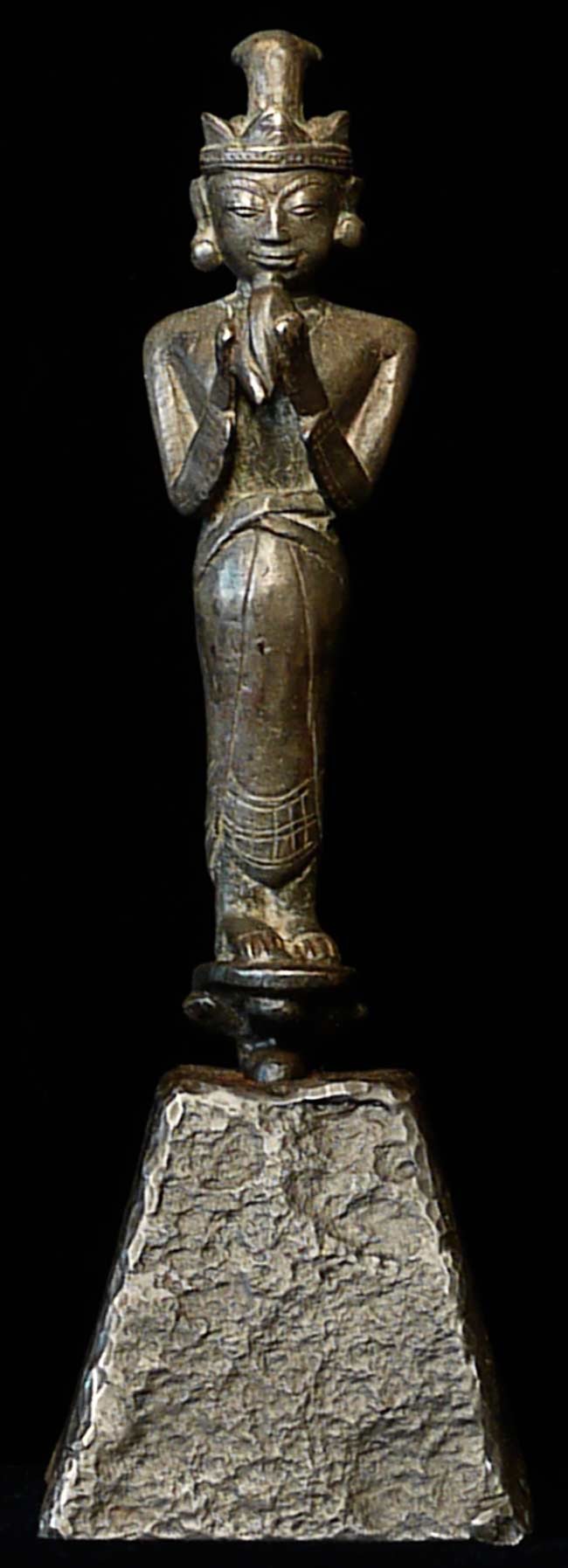 Extremely nice Burmese Buddhist Monk- would have been one of a pair facing a large Buddha. 17/18thC or earlier- Stands 9.5" inches tall on a custom base made by a metal sculptor. Base alone is 2.75" tall and 3" square on the bottom. It is a very fine and rare type.