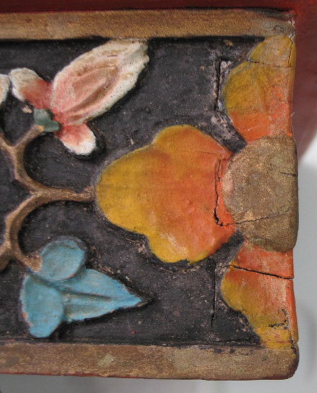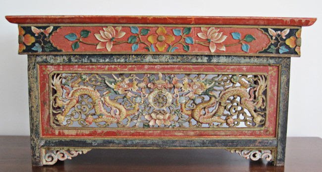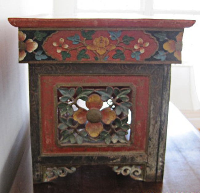 Old Mongolian Altar table. Previous owner was a Buddhist scholar who received it as a gift right out of someone's yurt while in Mongolia. Great finesse to the carving- excellent condition. Sits 14.25" high, 28" wide, 14.25" deep