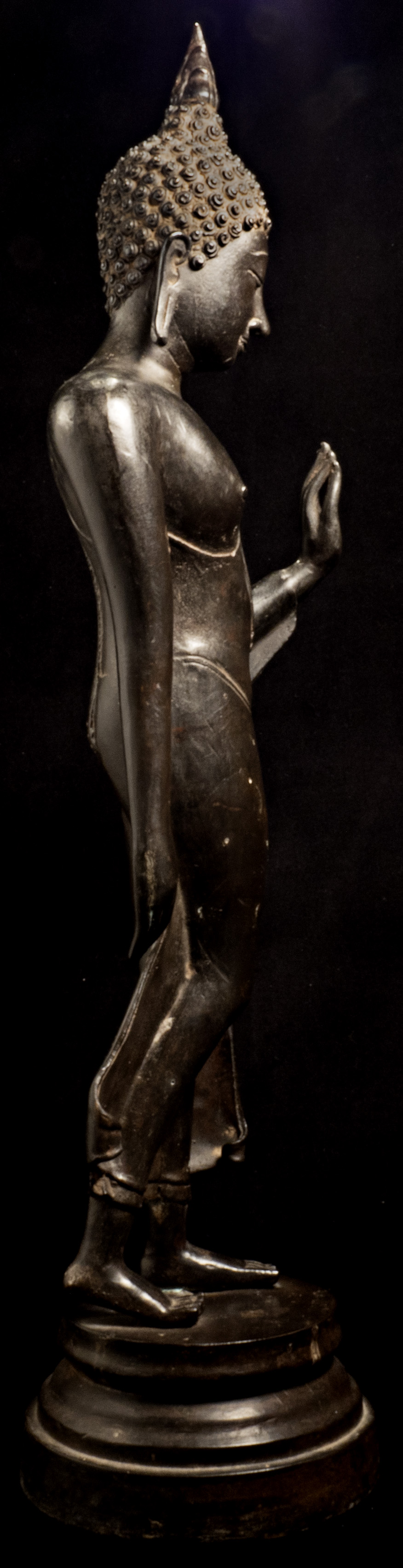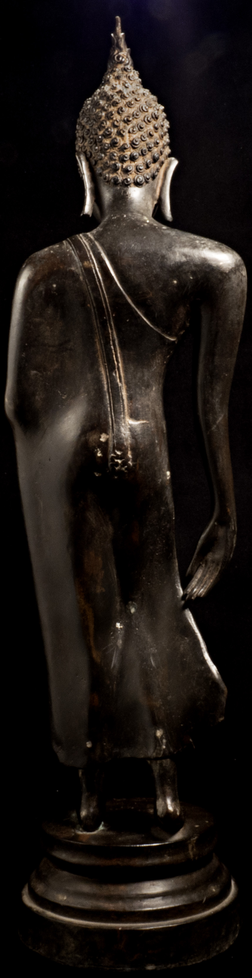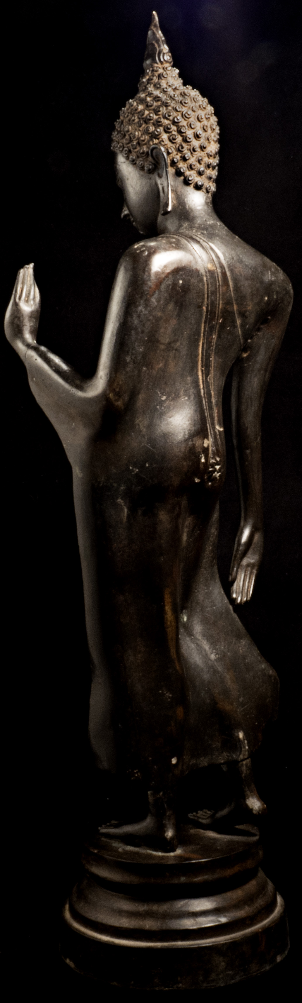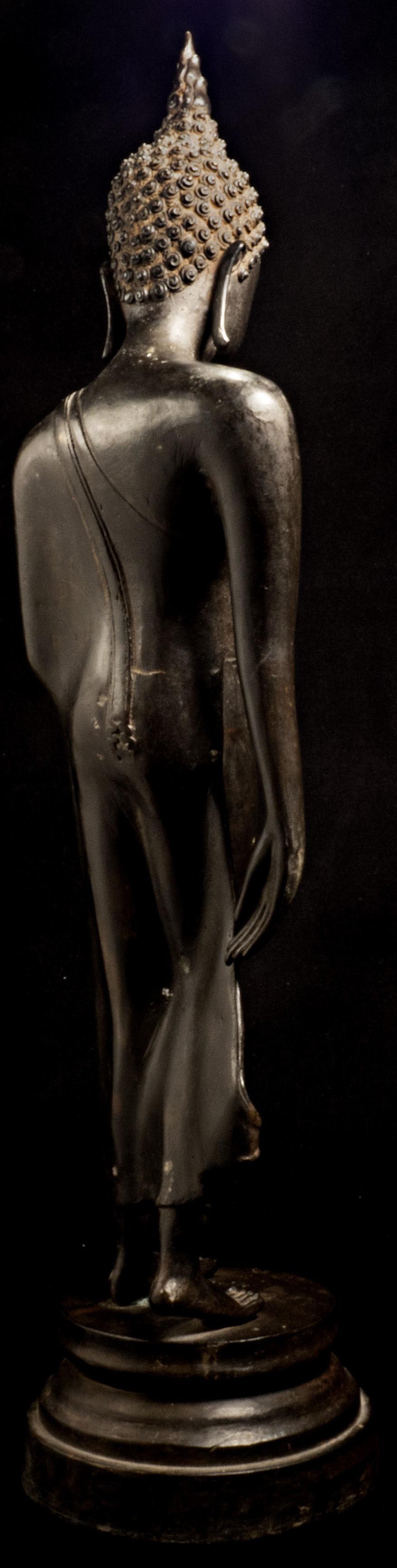 Beautifully cast 19th to 20thC walking Sukhothai style Buddha. One of the most graceful of all Buddhist forms, this meditation in motion shows Thai sculpture at it's pinnacle. This is almost certainly a revival piece brought about by Rama V (the King and I King) in the 3rd quarter of the 19th century in Bangkok. He loved this form and brought hundreds of large statues from the ancient capital city of Sukhothai to the new capitol Bangkok, and commissioned and encouraged the making of large numbers of this type. They remained popular through the late 19th and early 20th century, and continue being made up until today. This is a particularly large and fine example, and likely dates from close to 100 years ago. Stands 24.5 inches tall including the base , and measures 6 inches in diameter at the base.