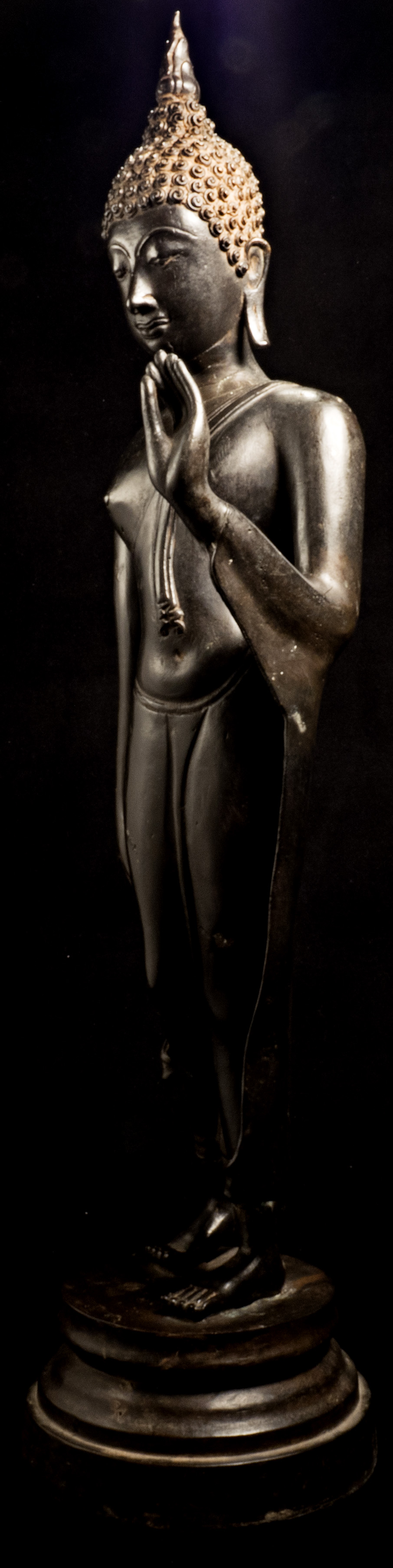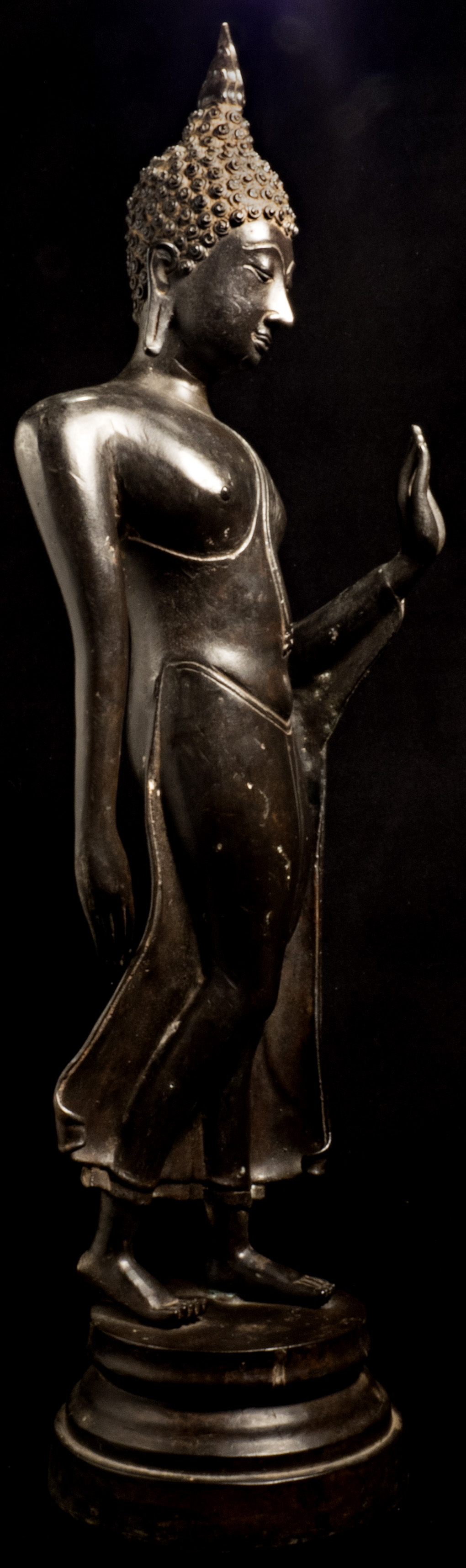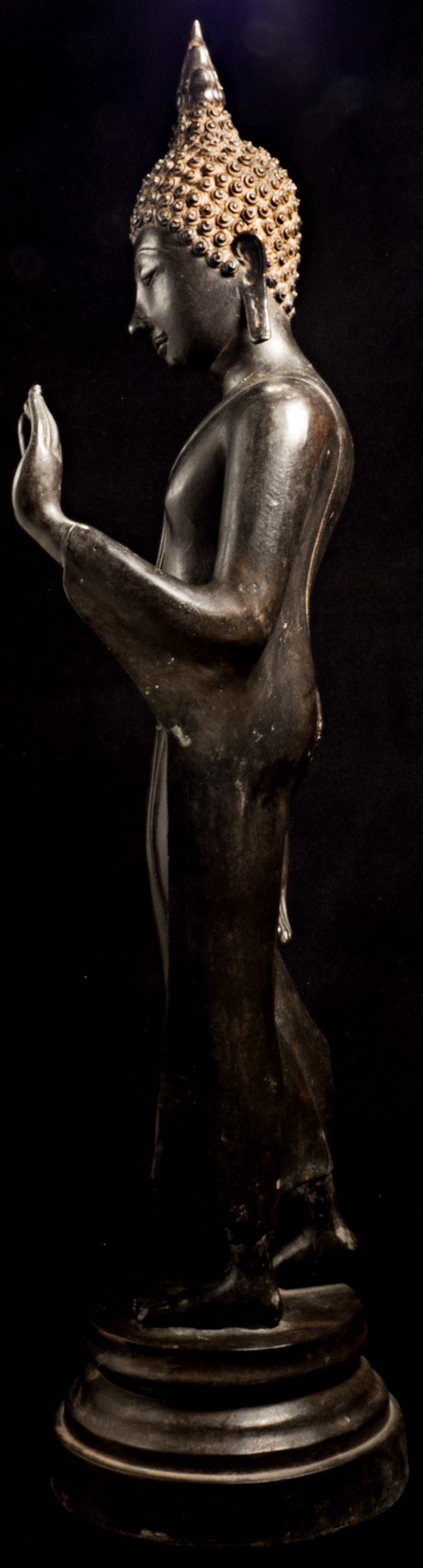 Beautifully cast 19th to 20thC walking Sukhothai style Buddha. One of the most graceful of all Buddhist forms, this meditation in motion shows Thai sculpture at it's pinnacle. This is almost certainly a revival piece brought about by Rama V (the King and I King) in the 3rd quarter of the 19th century in Bangkok. He loved this form and brought hundreds of large statues from the ancient capital city of Sukhothai to the new capitol Bangkok, and commissioned and encouraged the making of large numbers of this type. They remained popular through the late 19th and early 20th century, and continue being made up until today. This is a particularly large and fine example, and likely dates from close to 100 years ago. Stands 24.5 inches tall including the base , and measures 6 inches in diameter at the base.