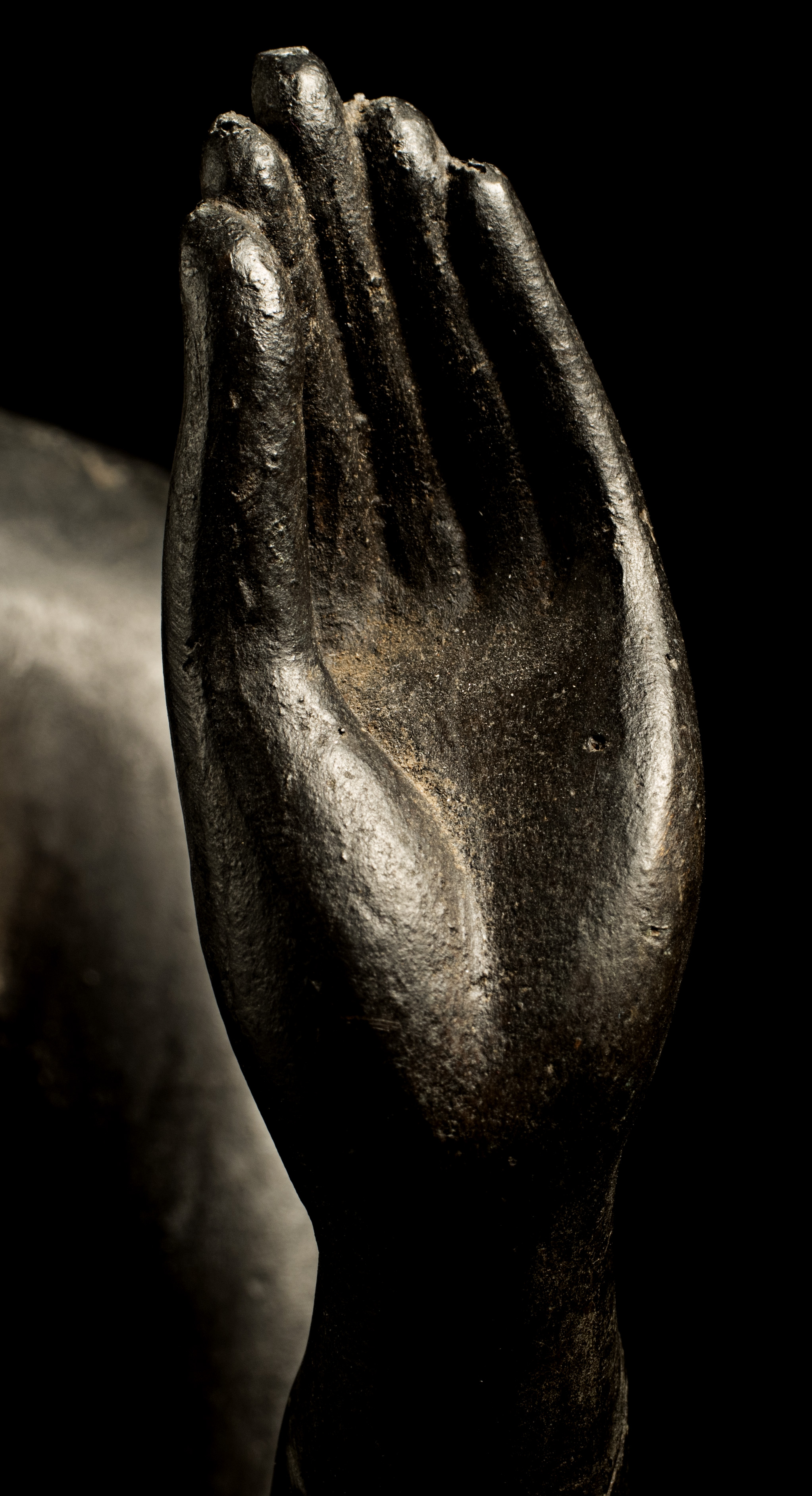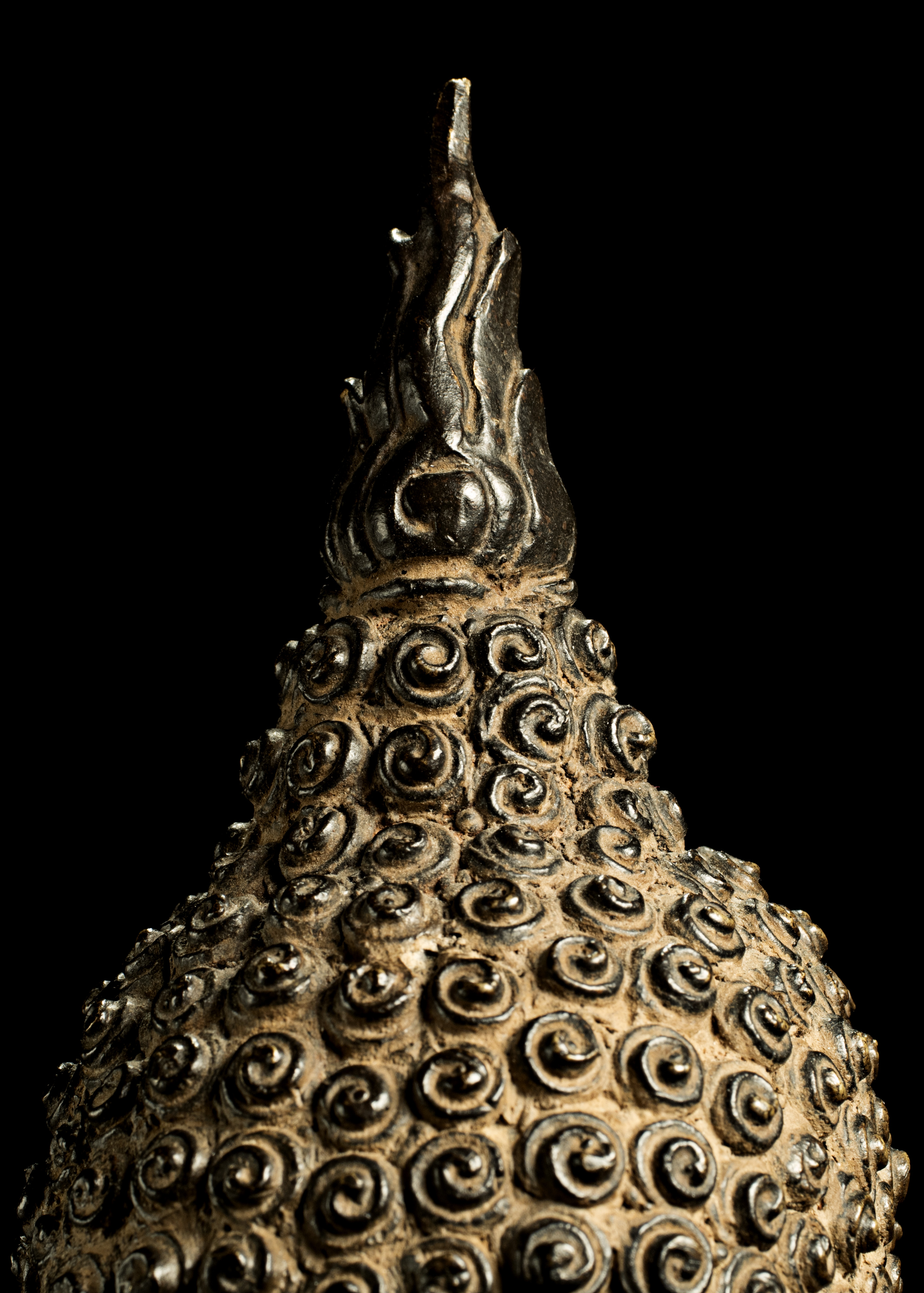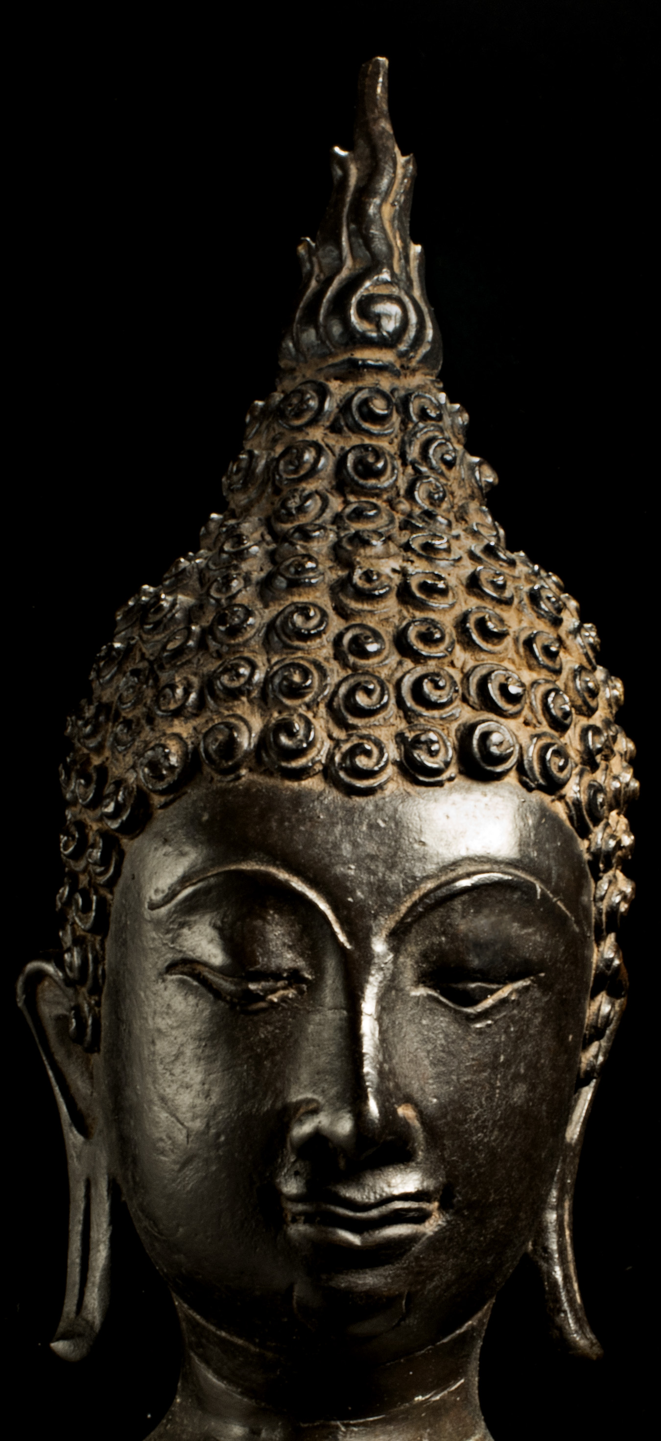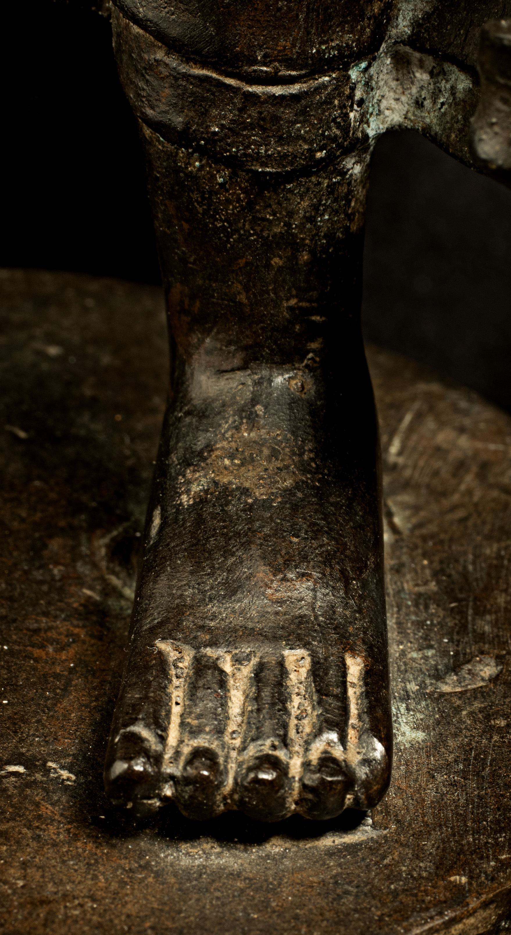 Beautifully cast 19th to 20thC walking Sukhothai style Buddha. One of the most graceful of all Buddhist forms, this meditation in motion shows Thai sculpture at it's pinnacle. This is almost certainly a revival piece brought about by Rama V (the King and I King) in the 3rd quarter of the 19th century in Bangkok. He loved this form and brought hundreds of large statues from the ancient capital city of Sukhothai to the new capitol Bangkok, and commissioned and encouraged the making of large numbers of this type. They remained popular through the late 19th and early 20th century, and continue being made up until today. This is a particularly large and fine example, and likely dates from close to 100 years ago. Stands 24.5 inches tall including the base , and measures 6 inches in diameter at the base.