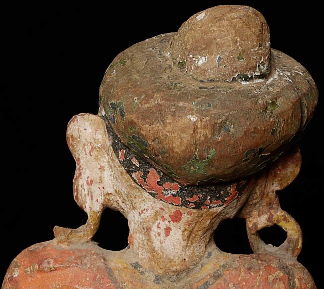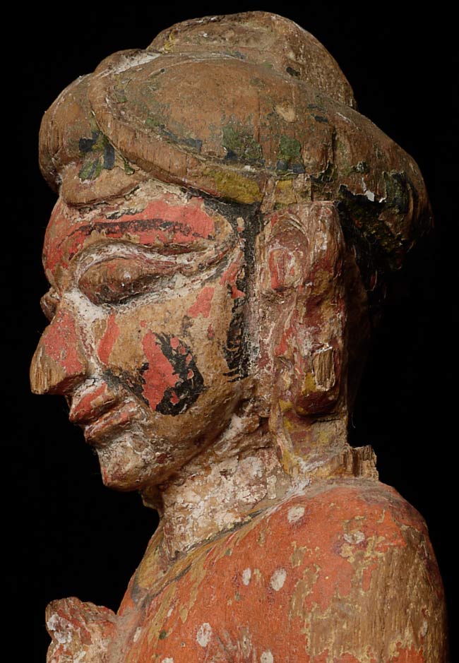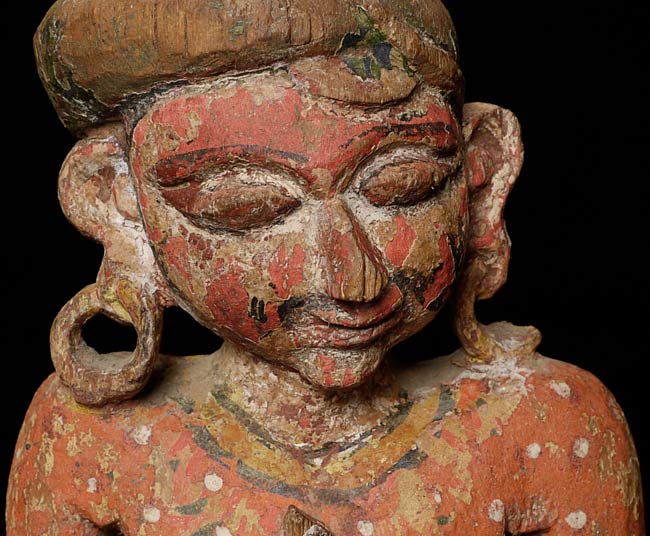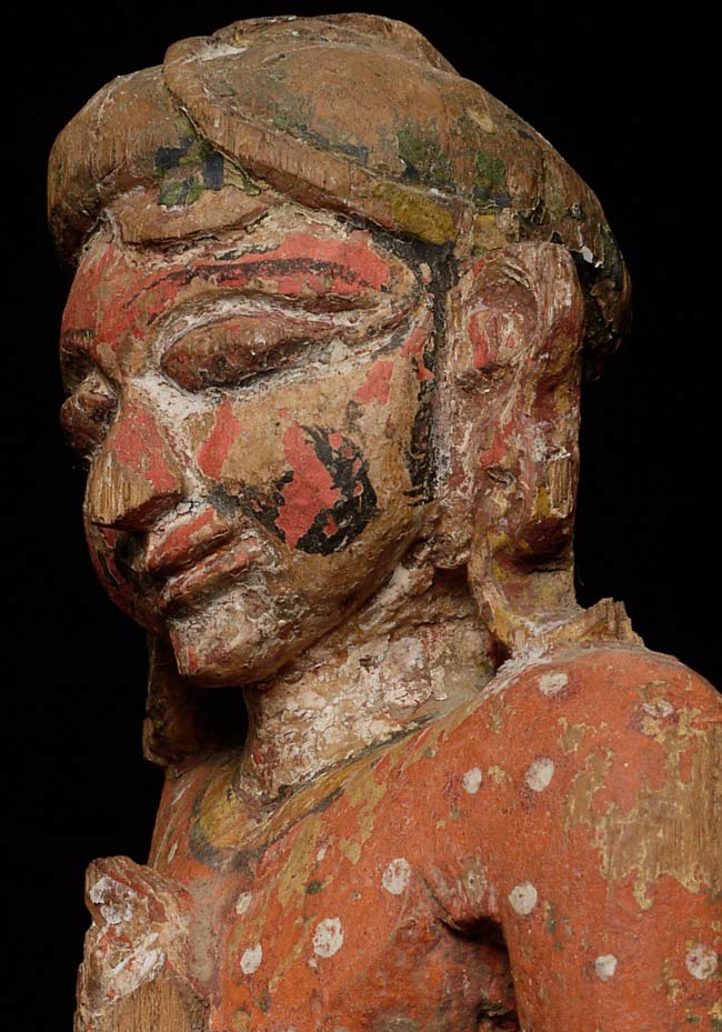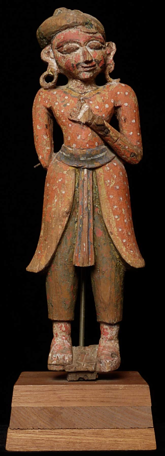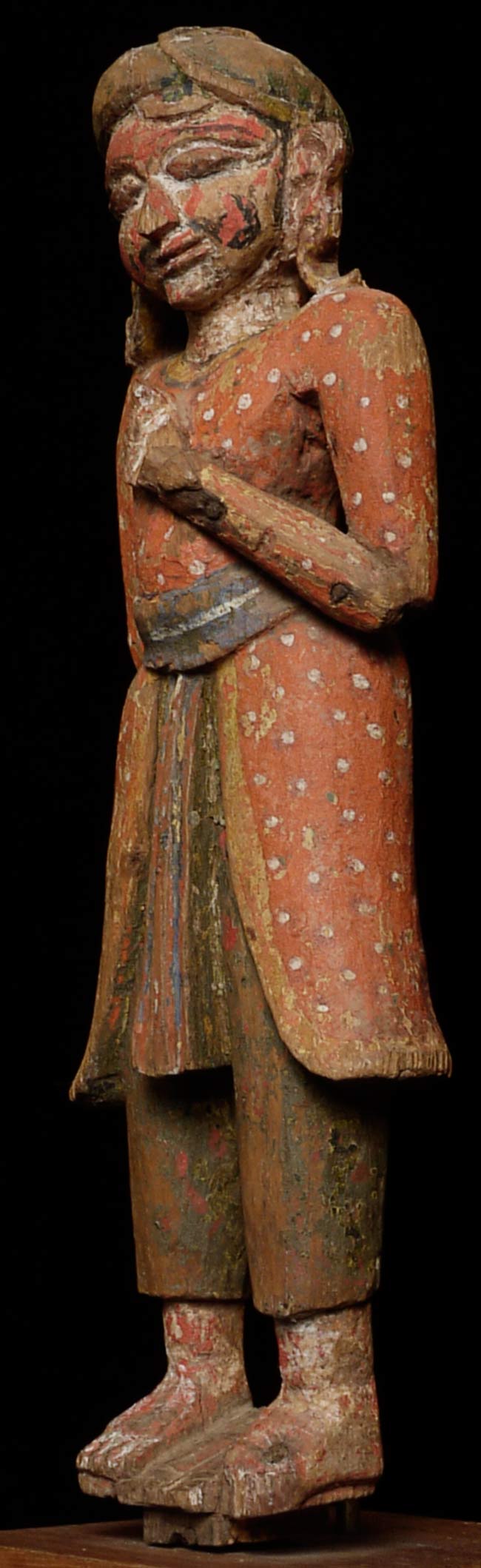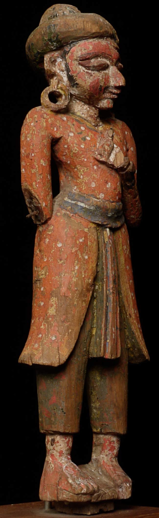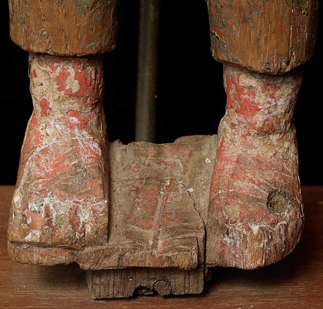 Delightful 19thC Indian Fellow. Stands 12.25 inches tall on a base that is 2.25 inches tall; 4.25 inches square. Losses as seen in the photos. Great face!