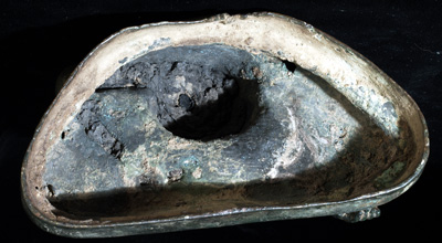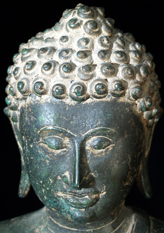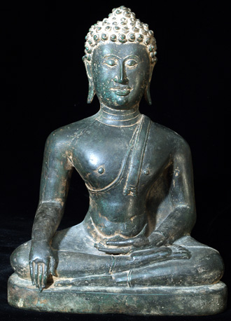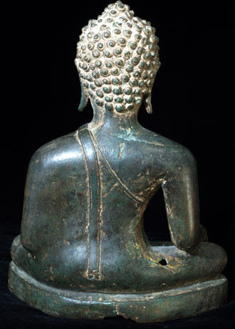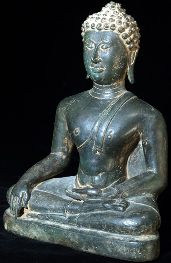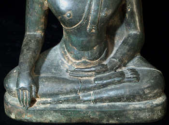 This is an early Sukothai which is finely cast, with a superb patina, distinctive face and great overall all feel. There must have been a temple or palace school producing this style, as I have seen 2 or 3 related pieces over the years using the same casting technique, style of sculpting, and alloy. He is 8 inches tall by 5.5 at the knees and is as large as life