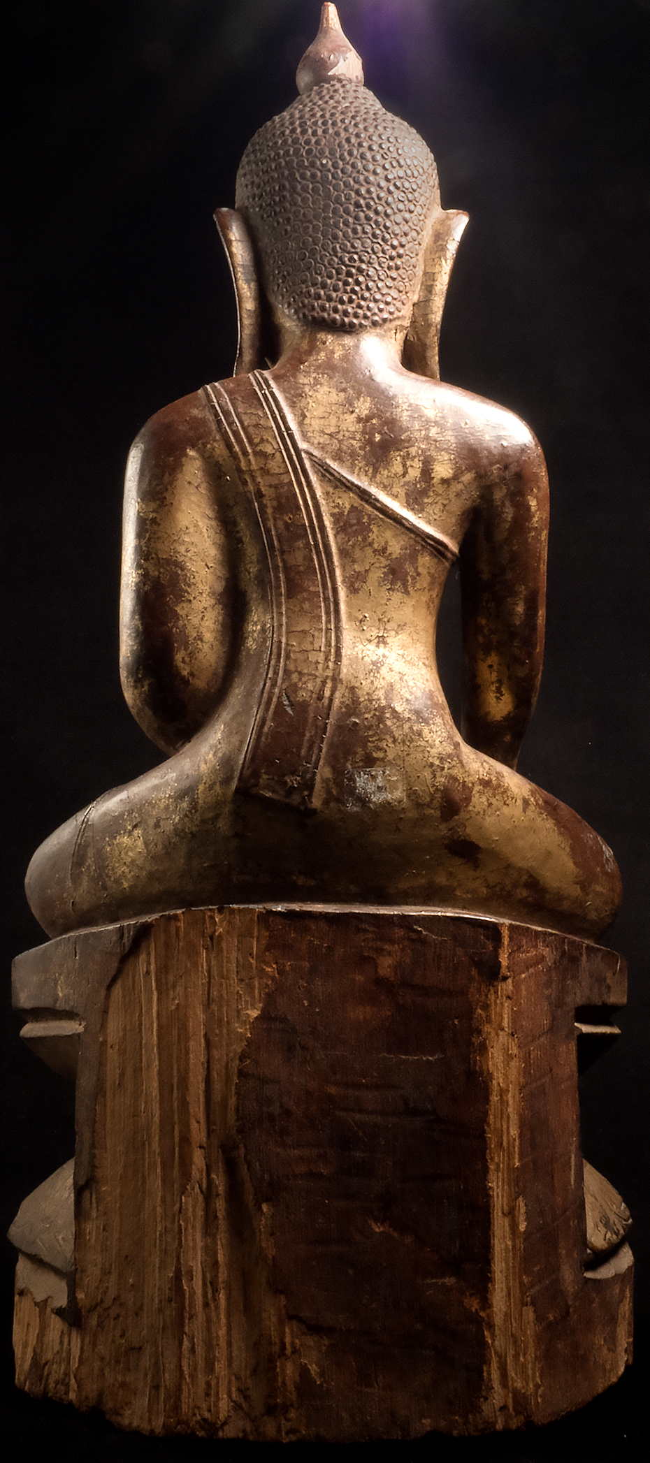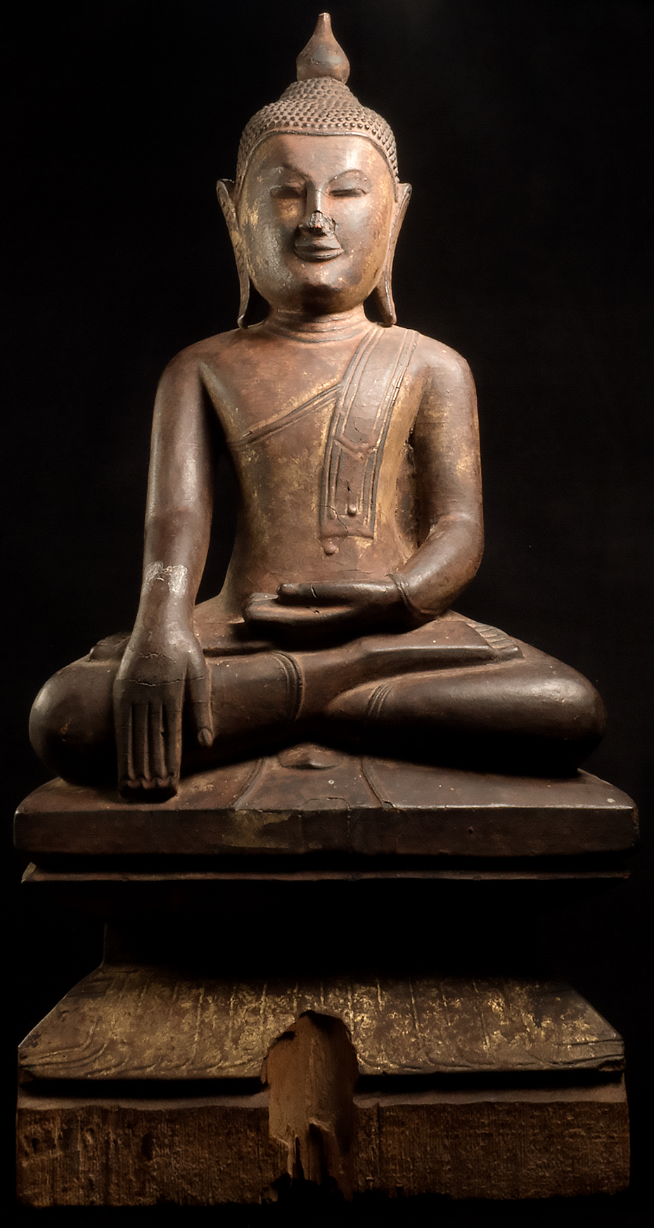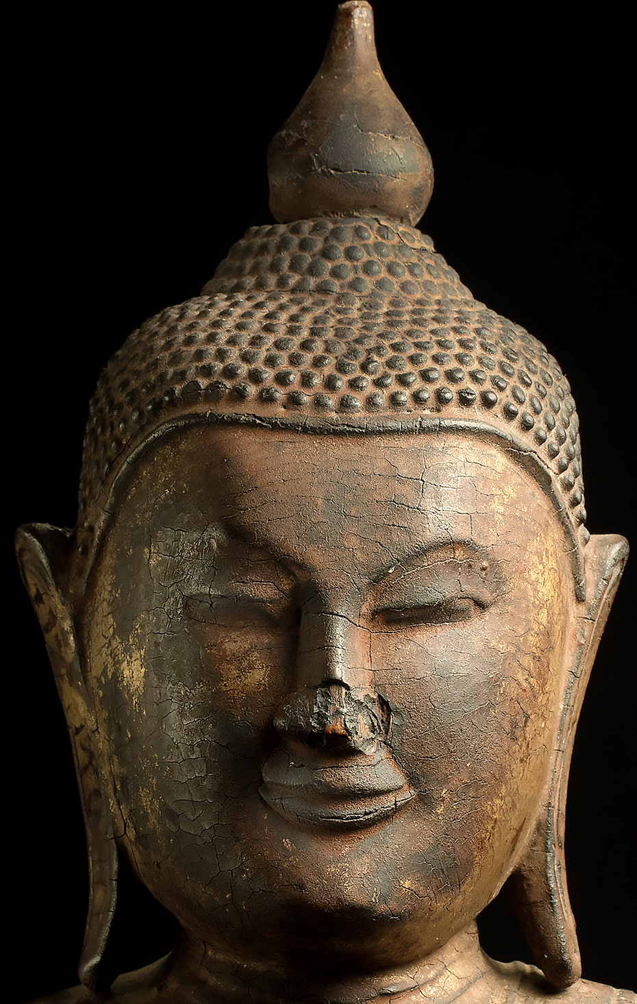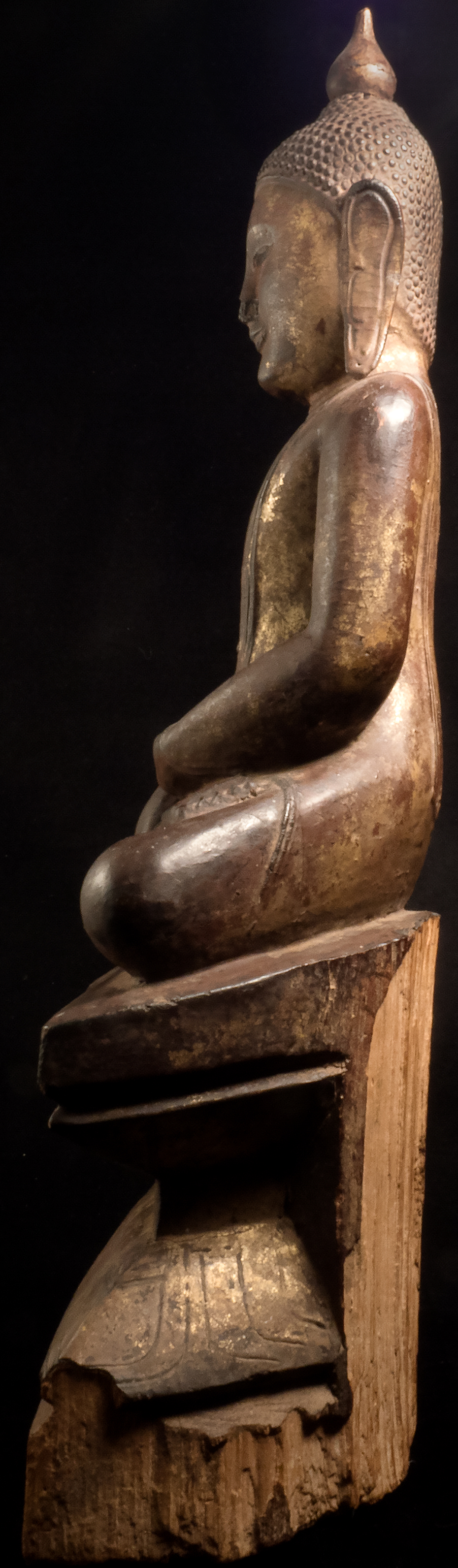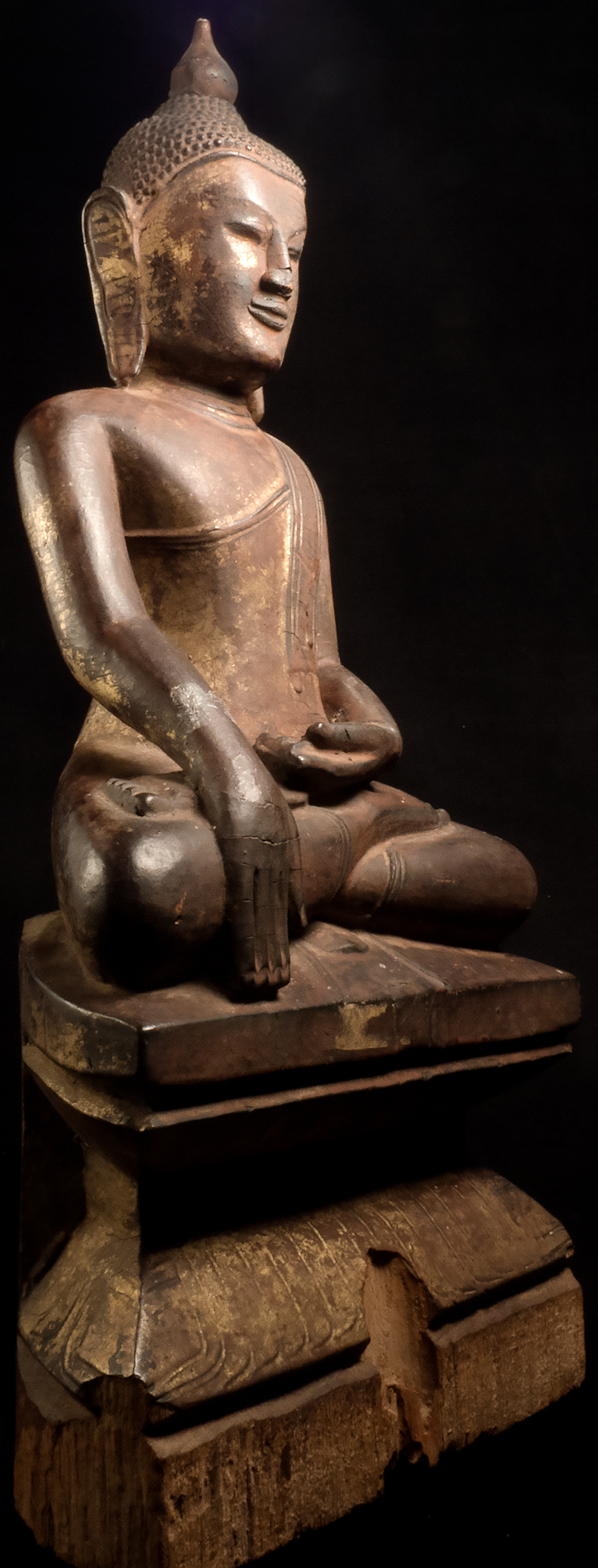 Large 17/18thC Ava/Shan Buddha. This piece measures 19 inches x 9 inches x 4.25 inches. Loss to nose, and usual losses to base that are found on virtually all authentic Burmese wood Buddhas of this age (due to heat, humidity, and bugs found in Burmese climate). If it were not for issue with nose, this Buddha would be splendid, and would be worth 3 to 5 times what it is selling for now (could be fairly easily repaired by someone who knew how). Wonderful round "baby face" as is found on the late Ava-type Buddhas.